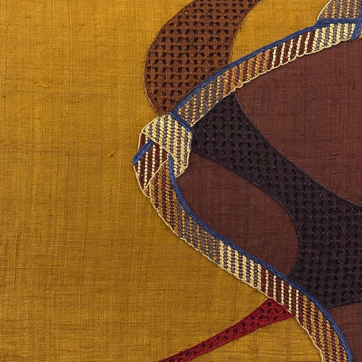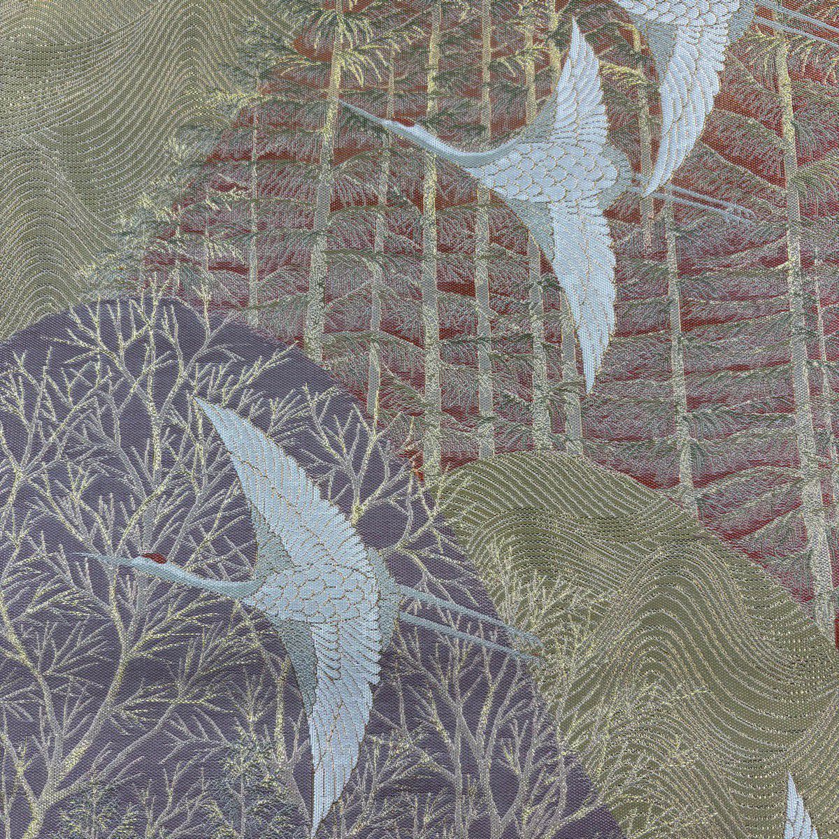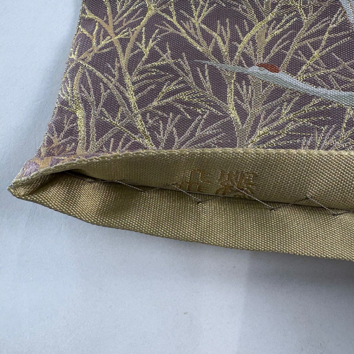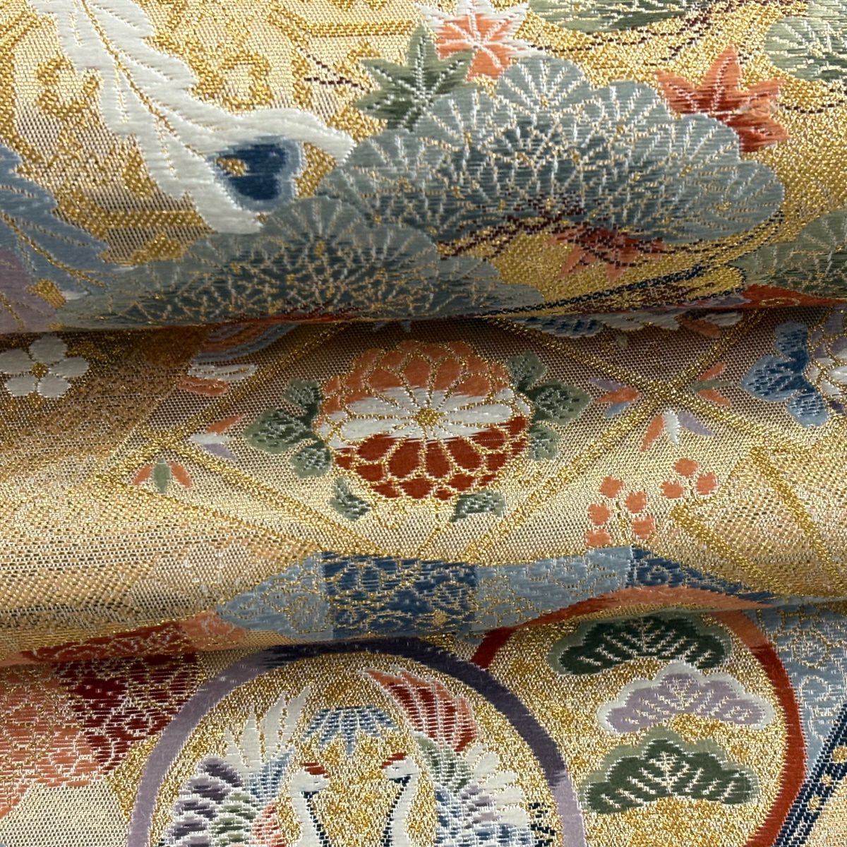 【美品】 袋帯 秀品 落款あり 藤三郎 鶴 山並み 箔 黄土色 六通 正絹