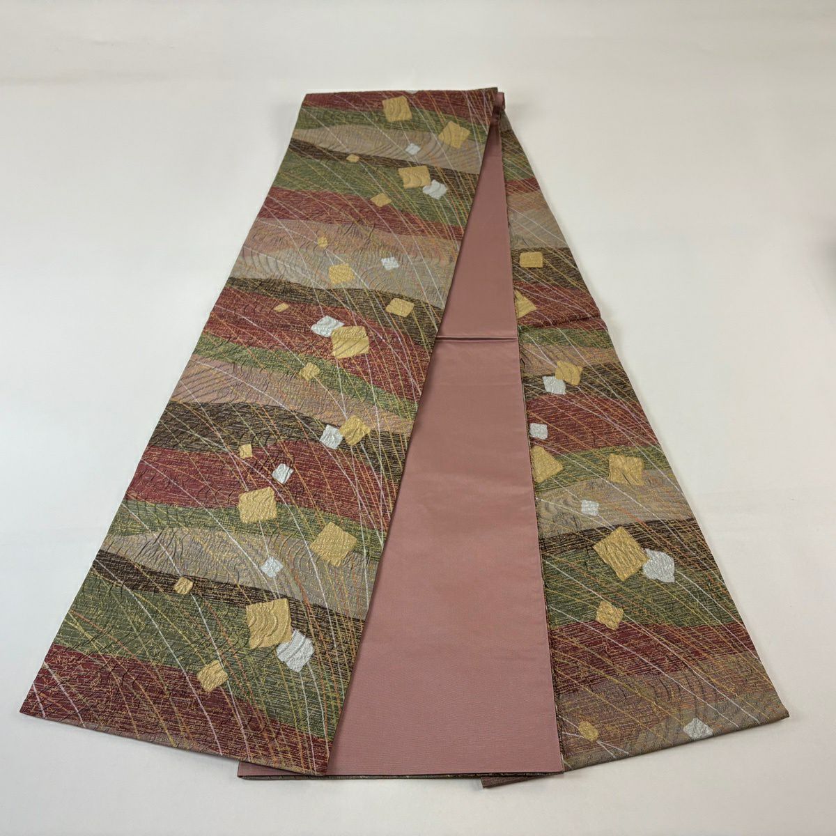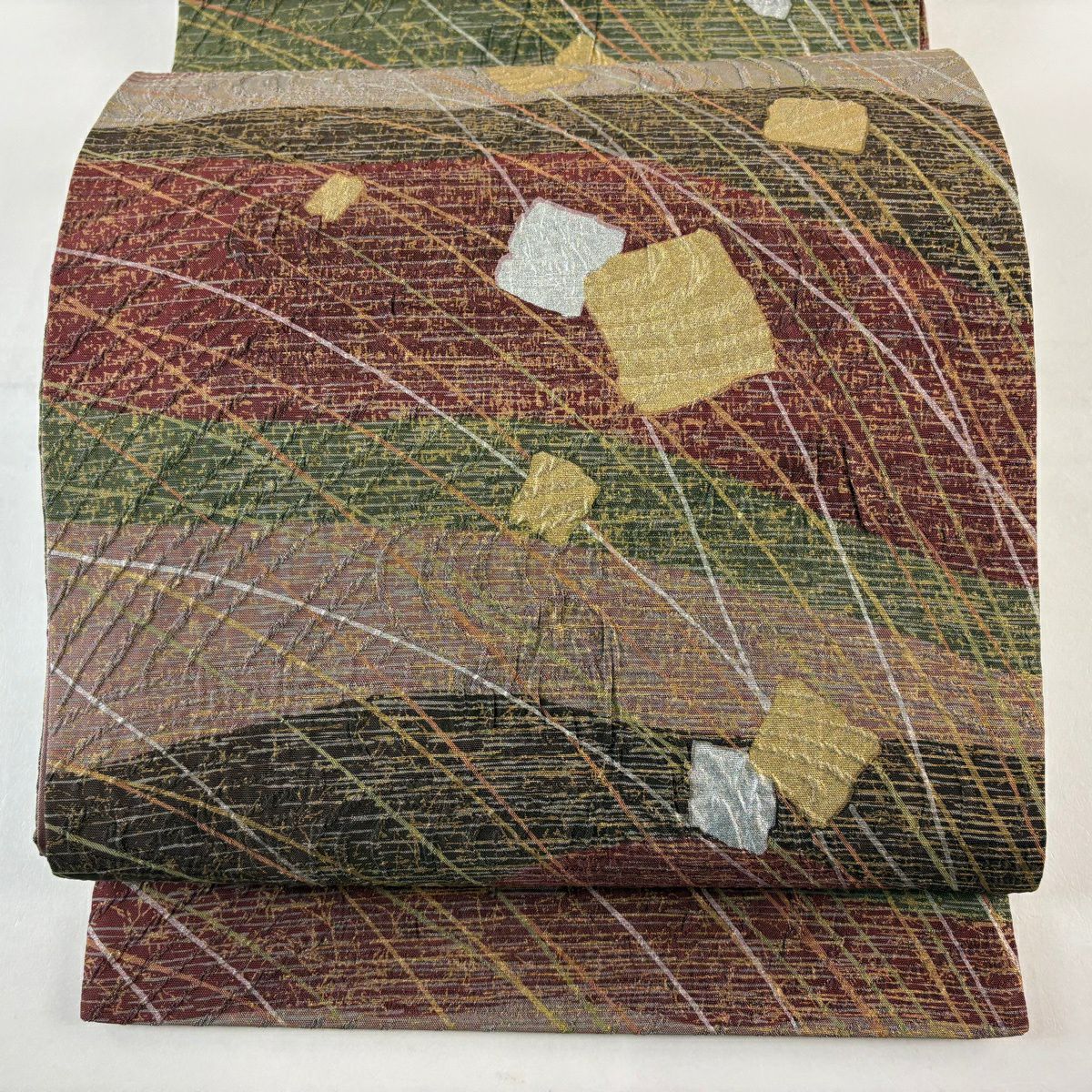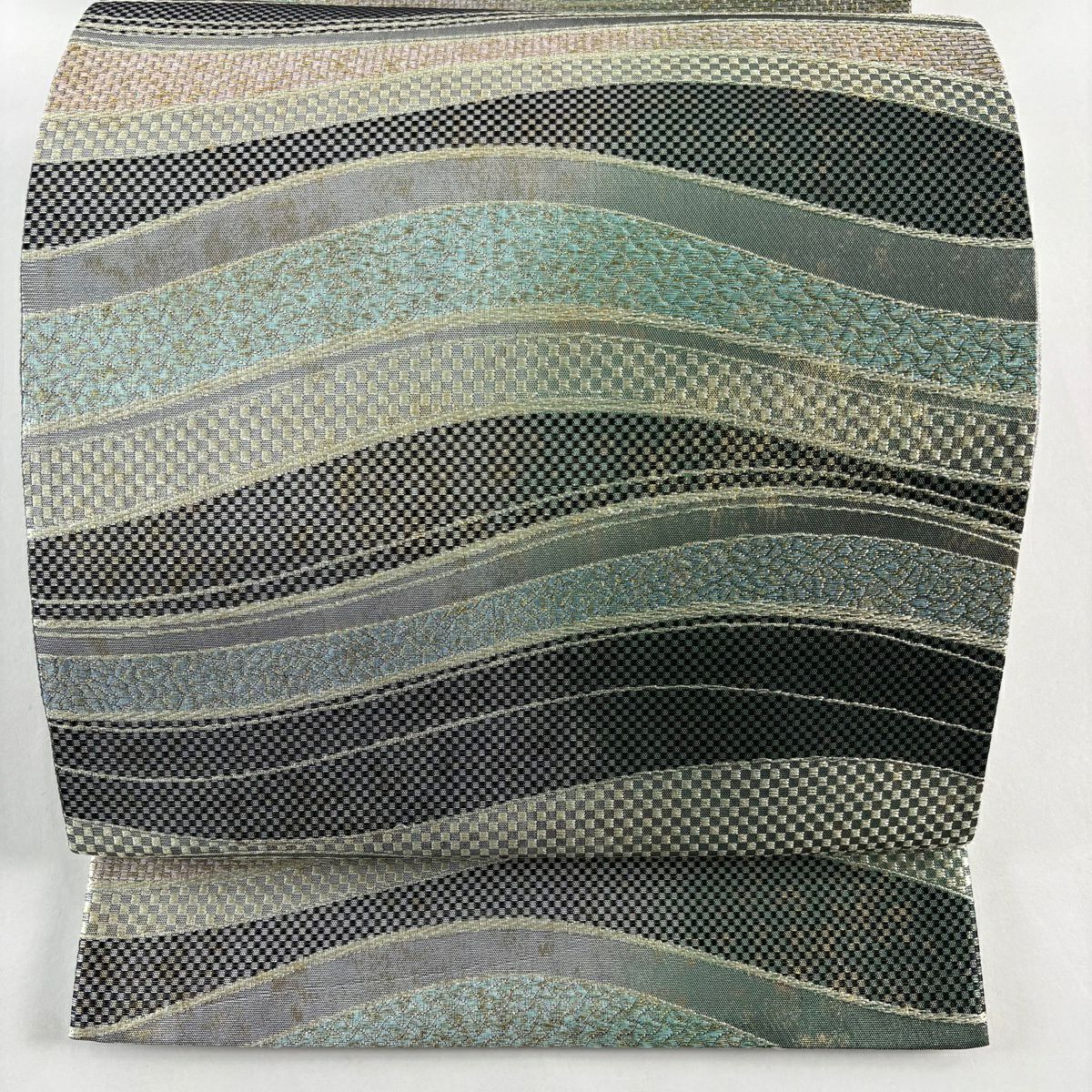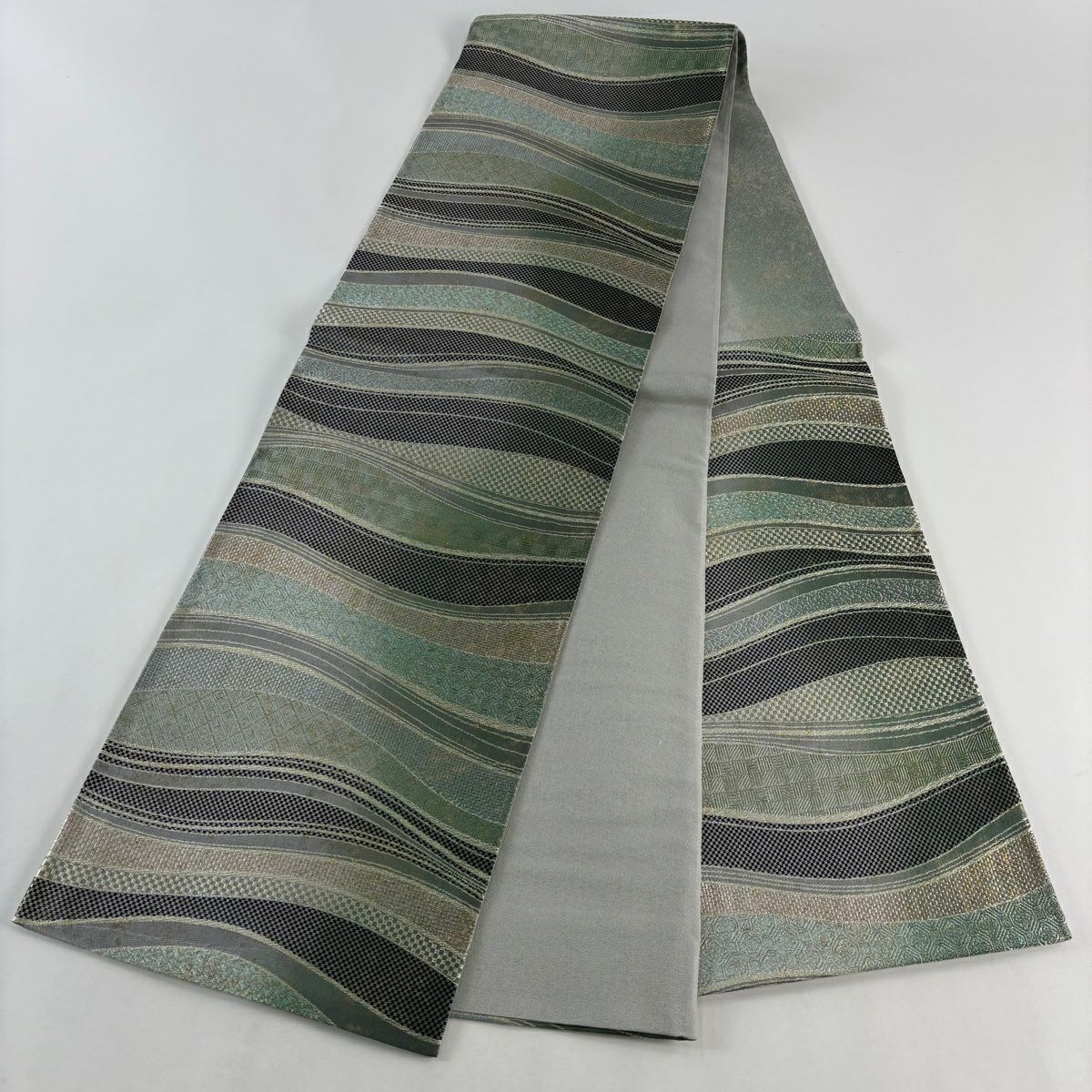 【美品】 袋帯 秀品 証紙あり 波 幾何学模様 金糸 箔 灰緑 六通 正絹