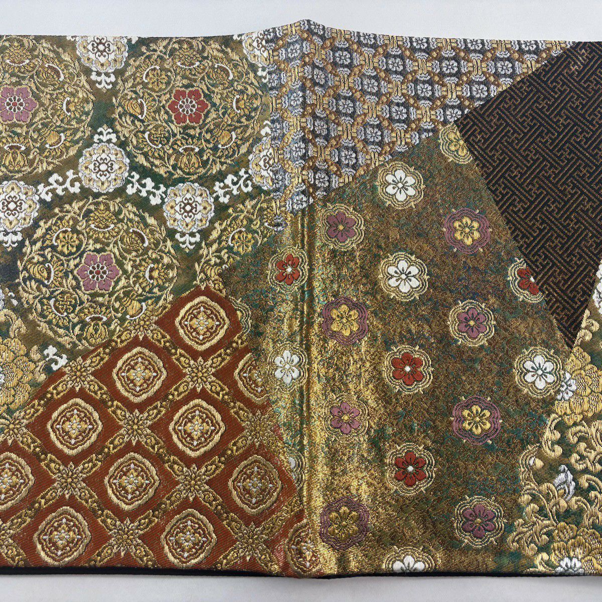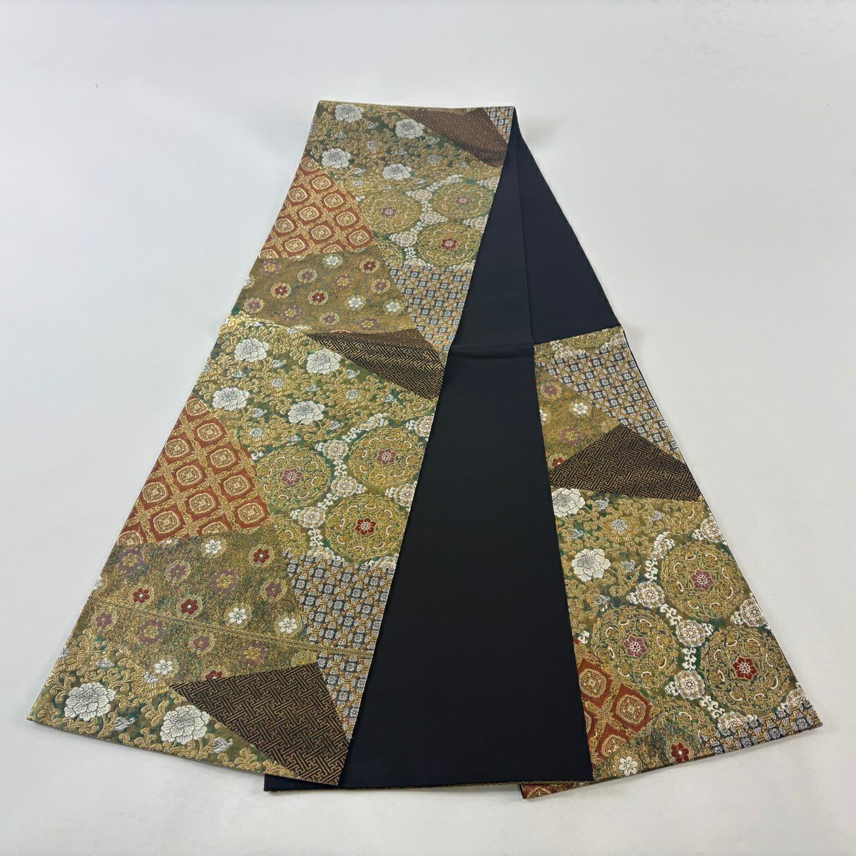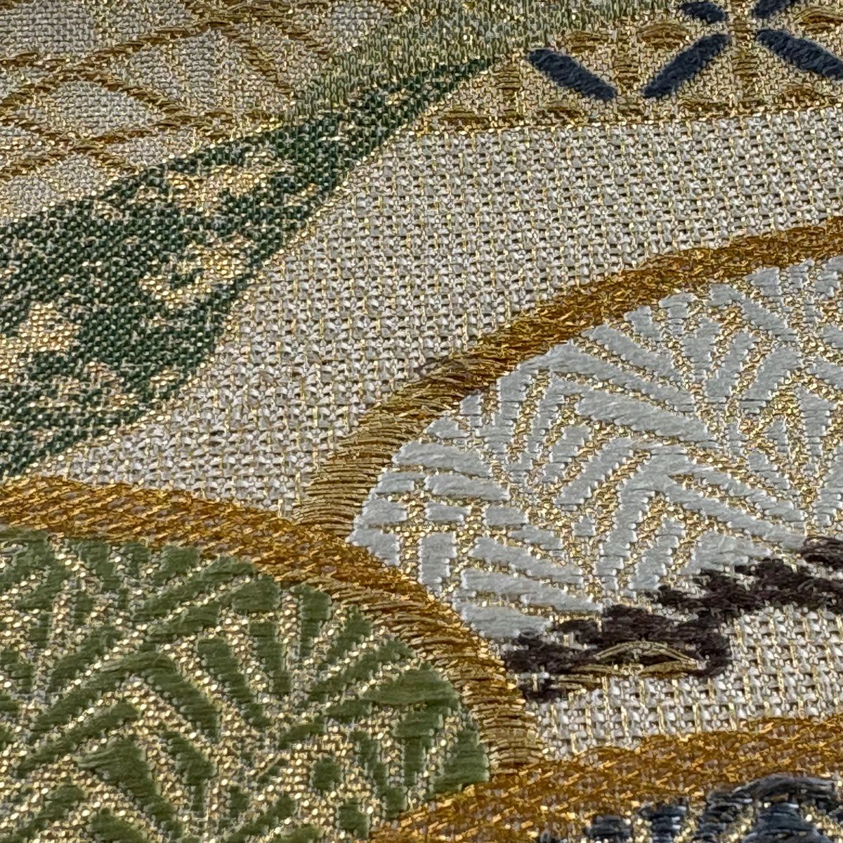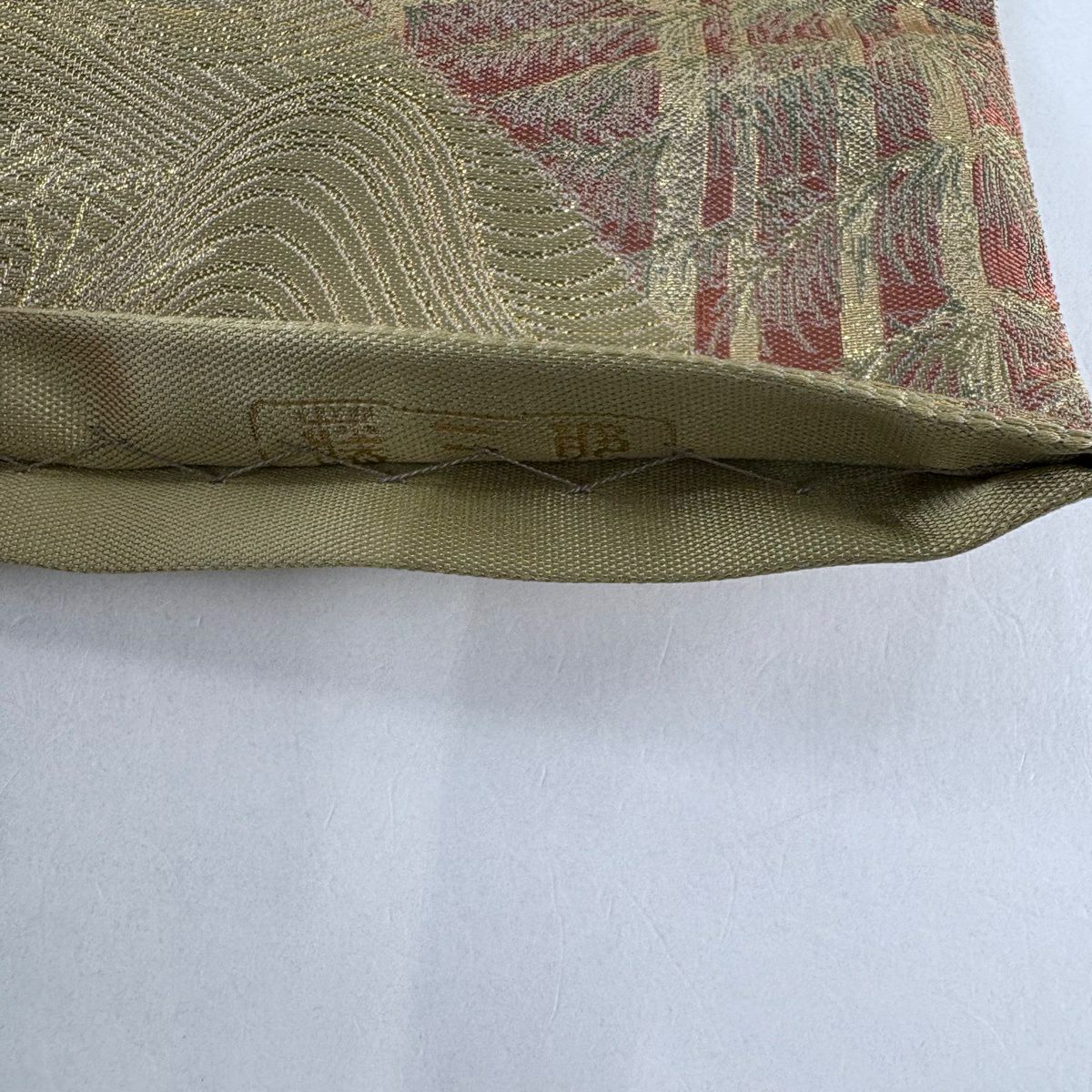 【美品】 袋帯 秀品 証紙あり 波 幾何学模様 金糸 箔 灰緑 六通 正絹