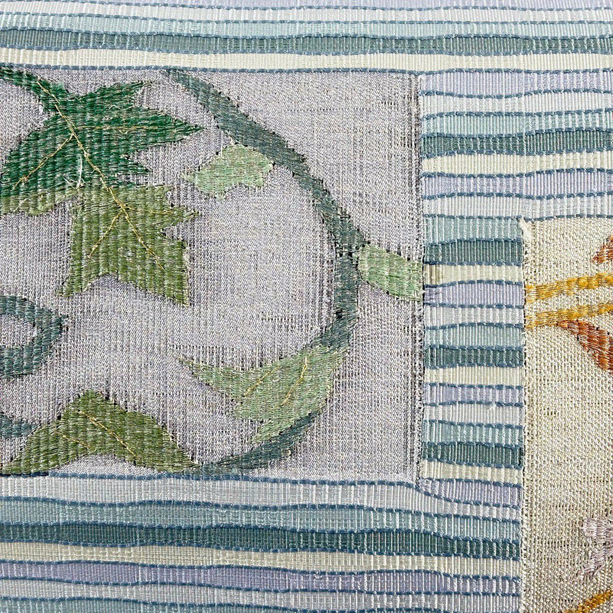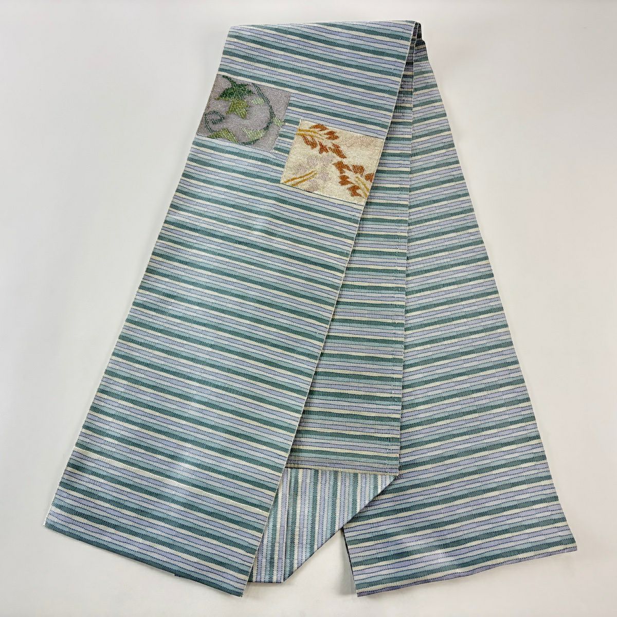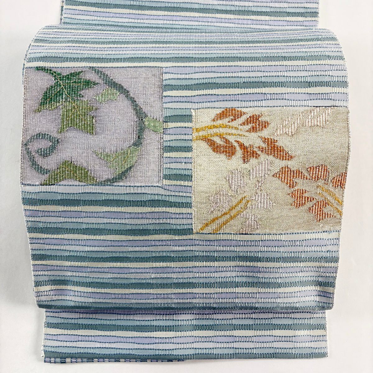 【美品】 名古屋帯 秀品 松葉仕立て 八寸名古屋帯 縞 葉柄 金銀糸 灰緑 正絹