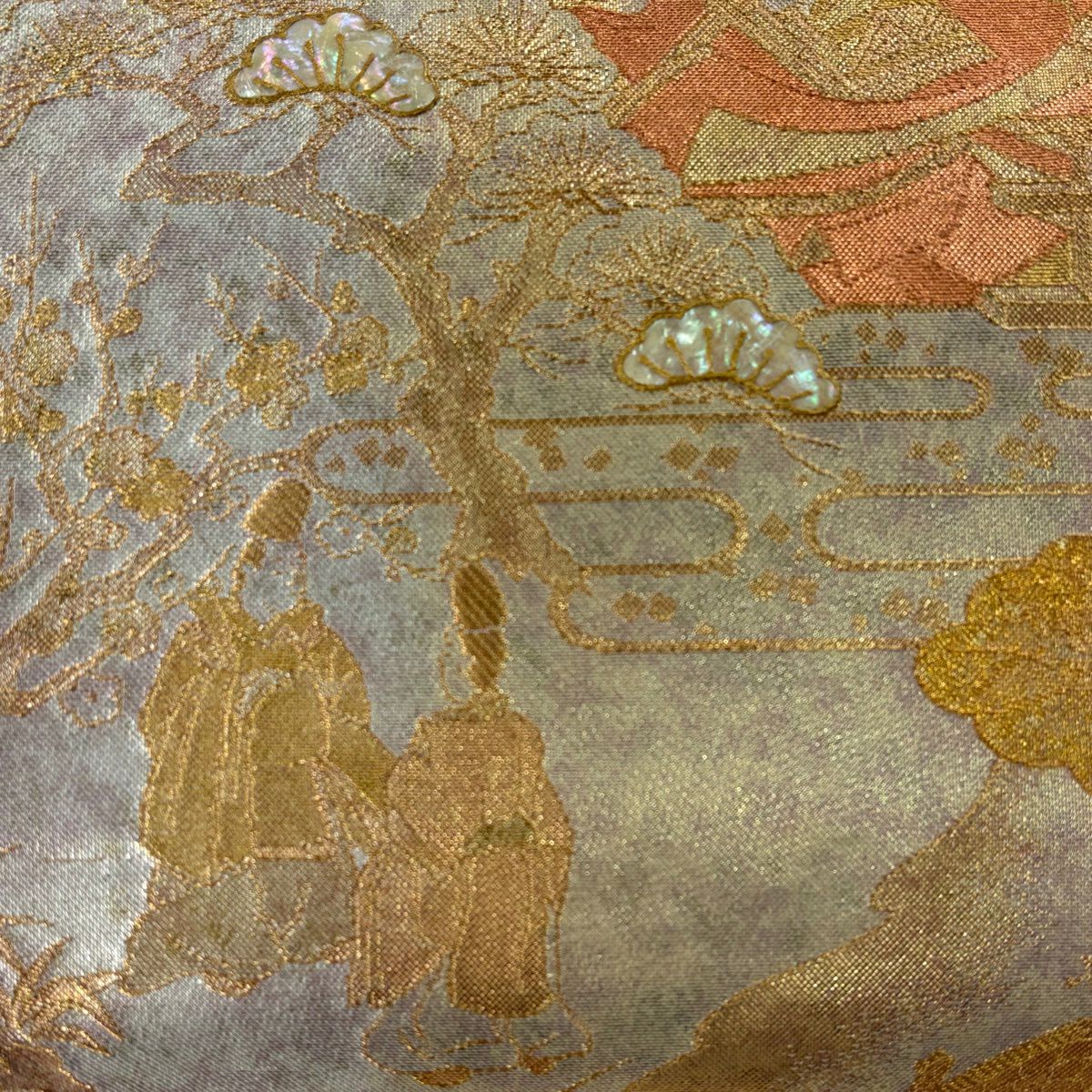 【美品】 袋帯 秀品 人物 草花 螺鈿 金糸 薄オレンジ お太鼓柄 正絹