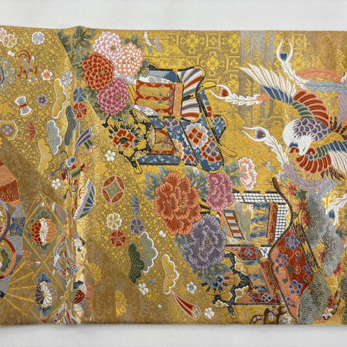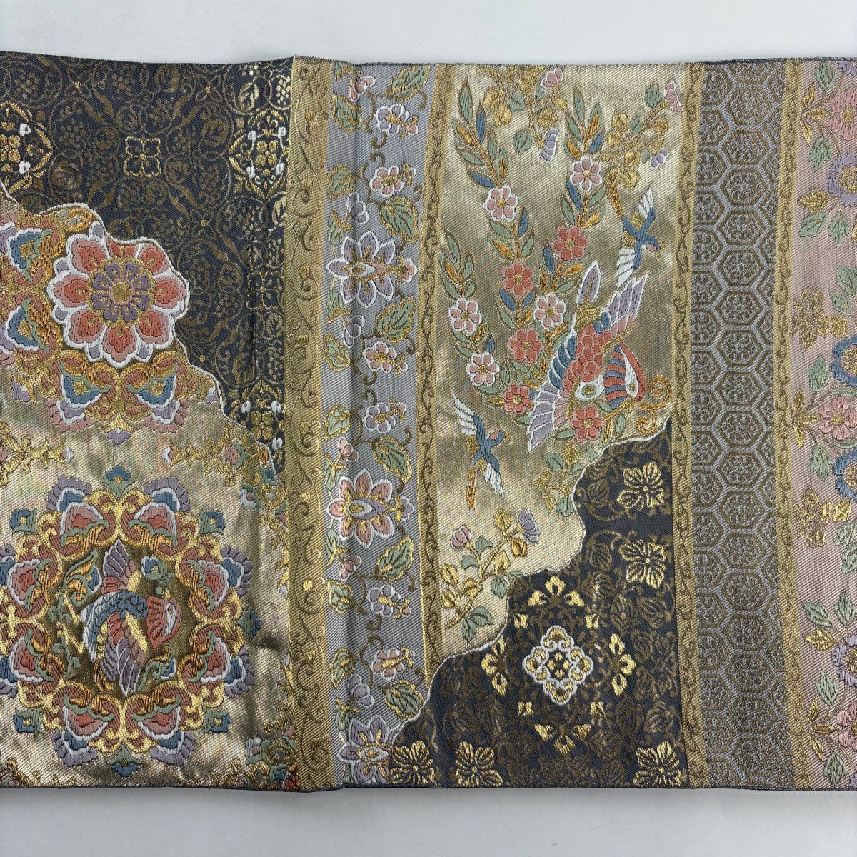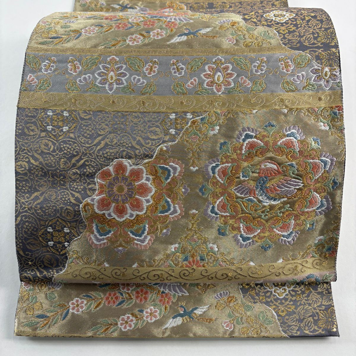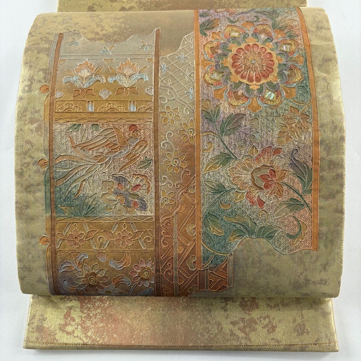 【美品】 袋帯 秀品 関西仕立て 華文 鳥 螺鈿 箔 金色 お太鼓柄 正絹