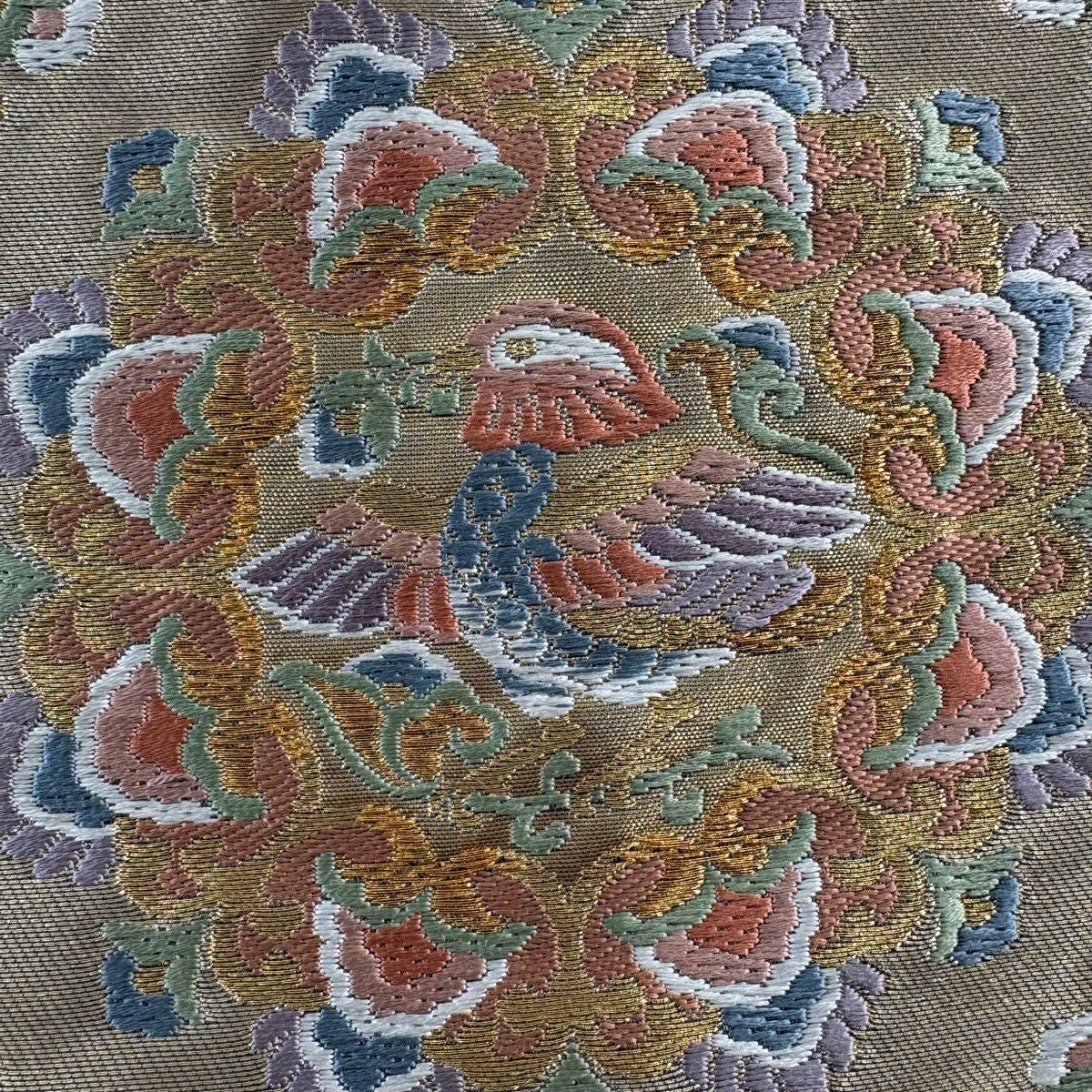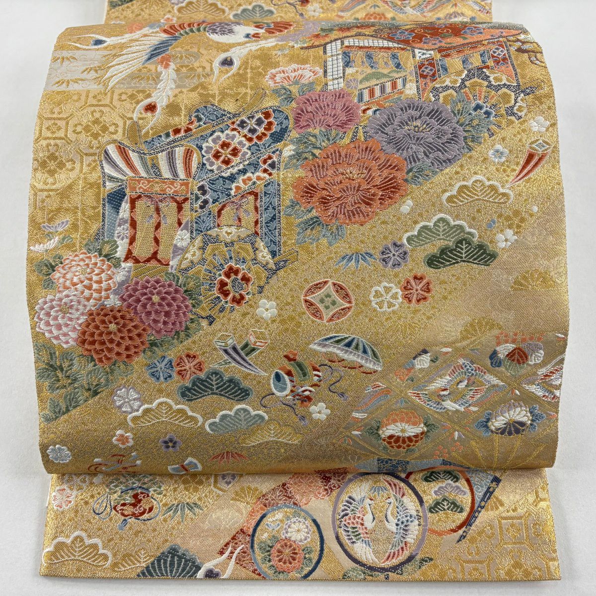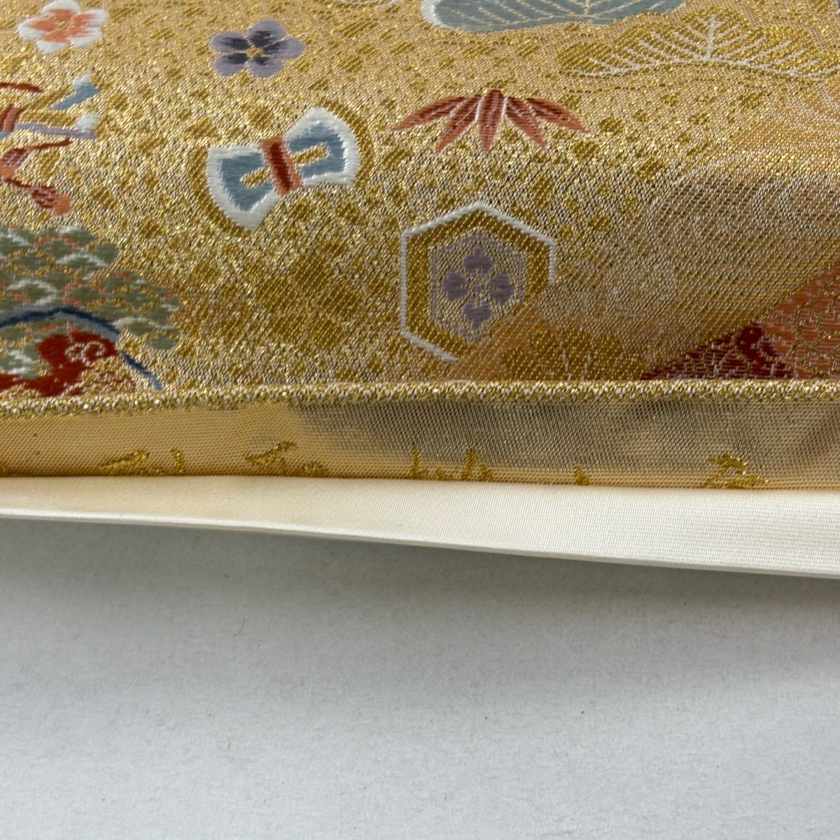 【美品】 袋帯 秀品 関西仕立て 華文 鳥 螺鈿 箔 金色 お太鼓柄 正絹