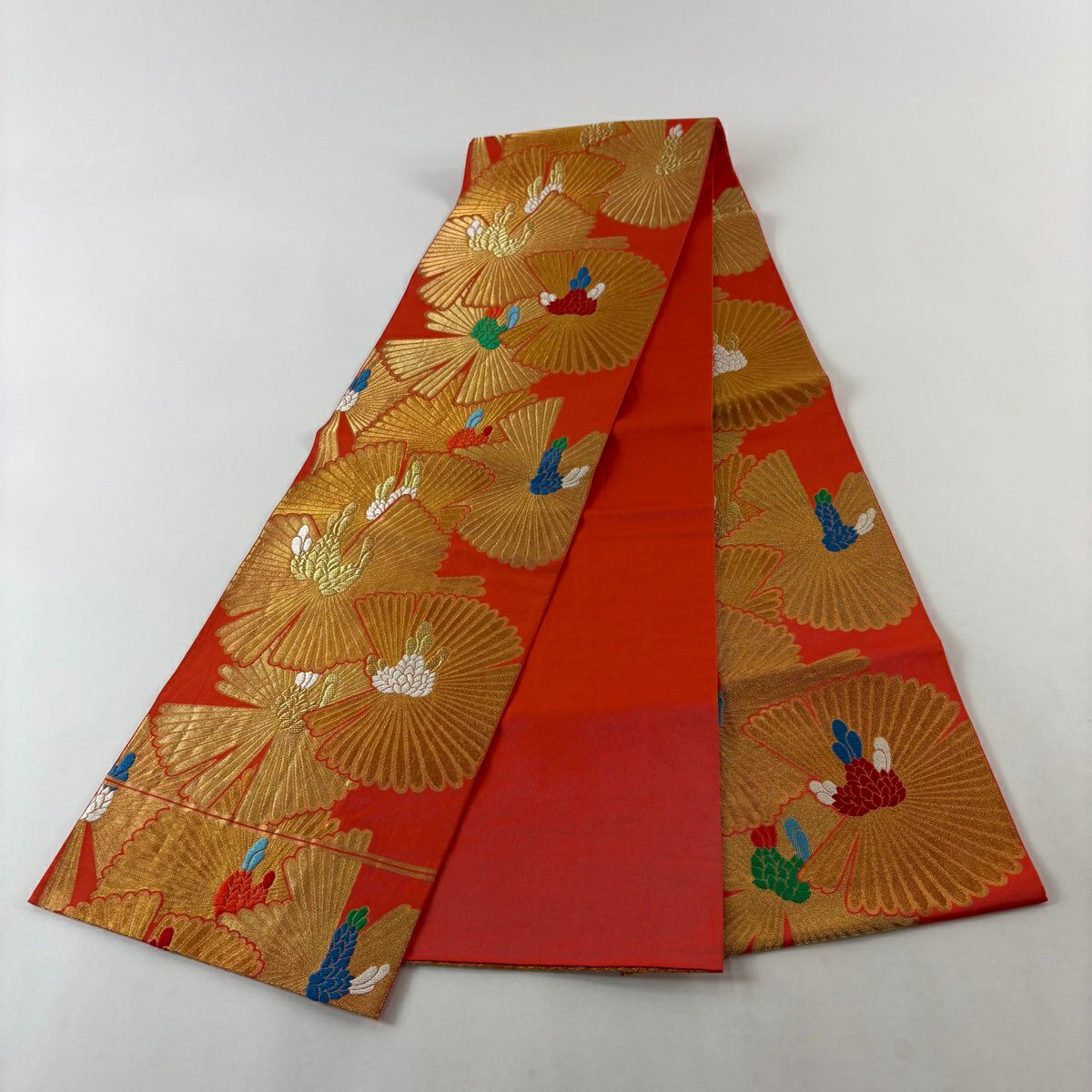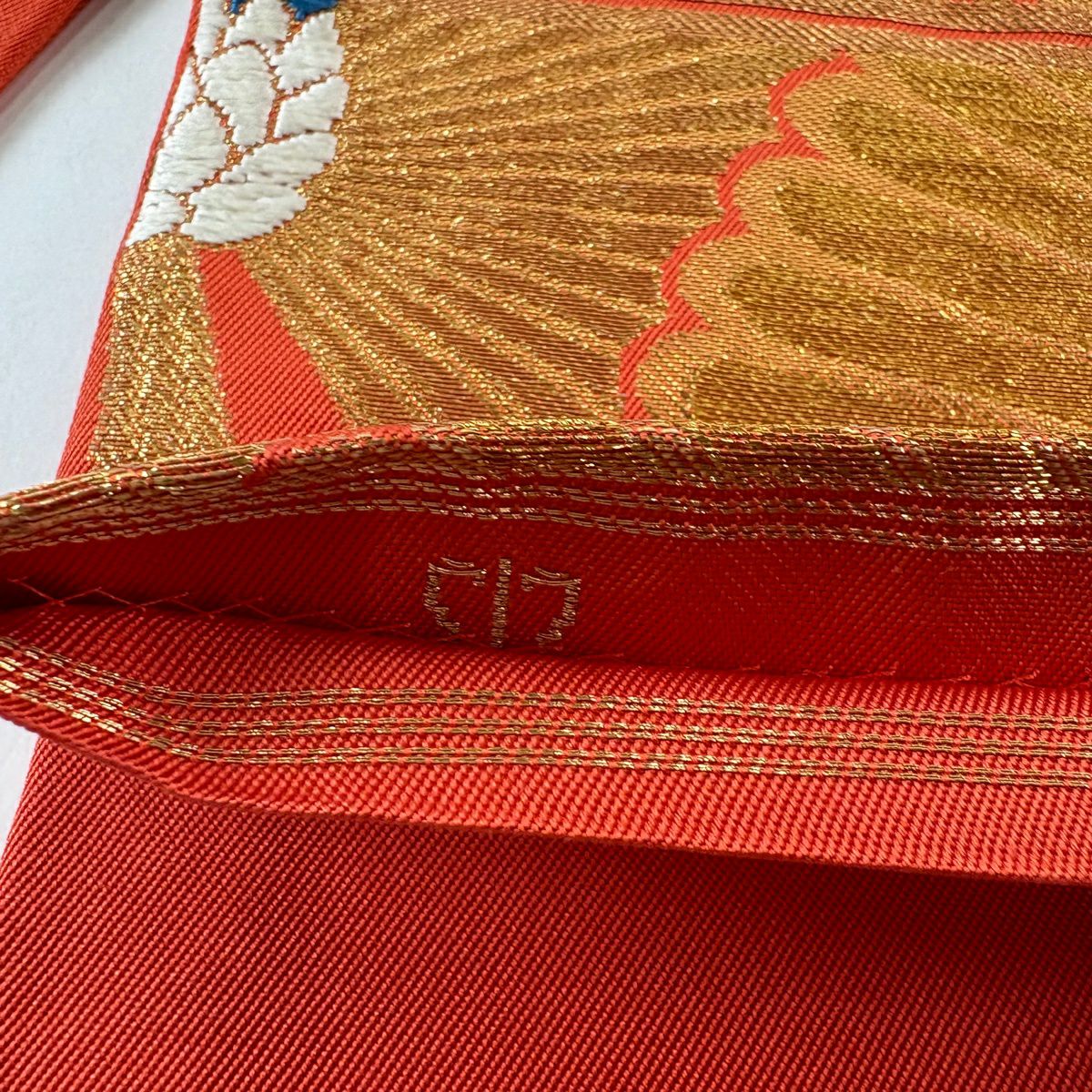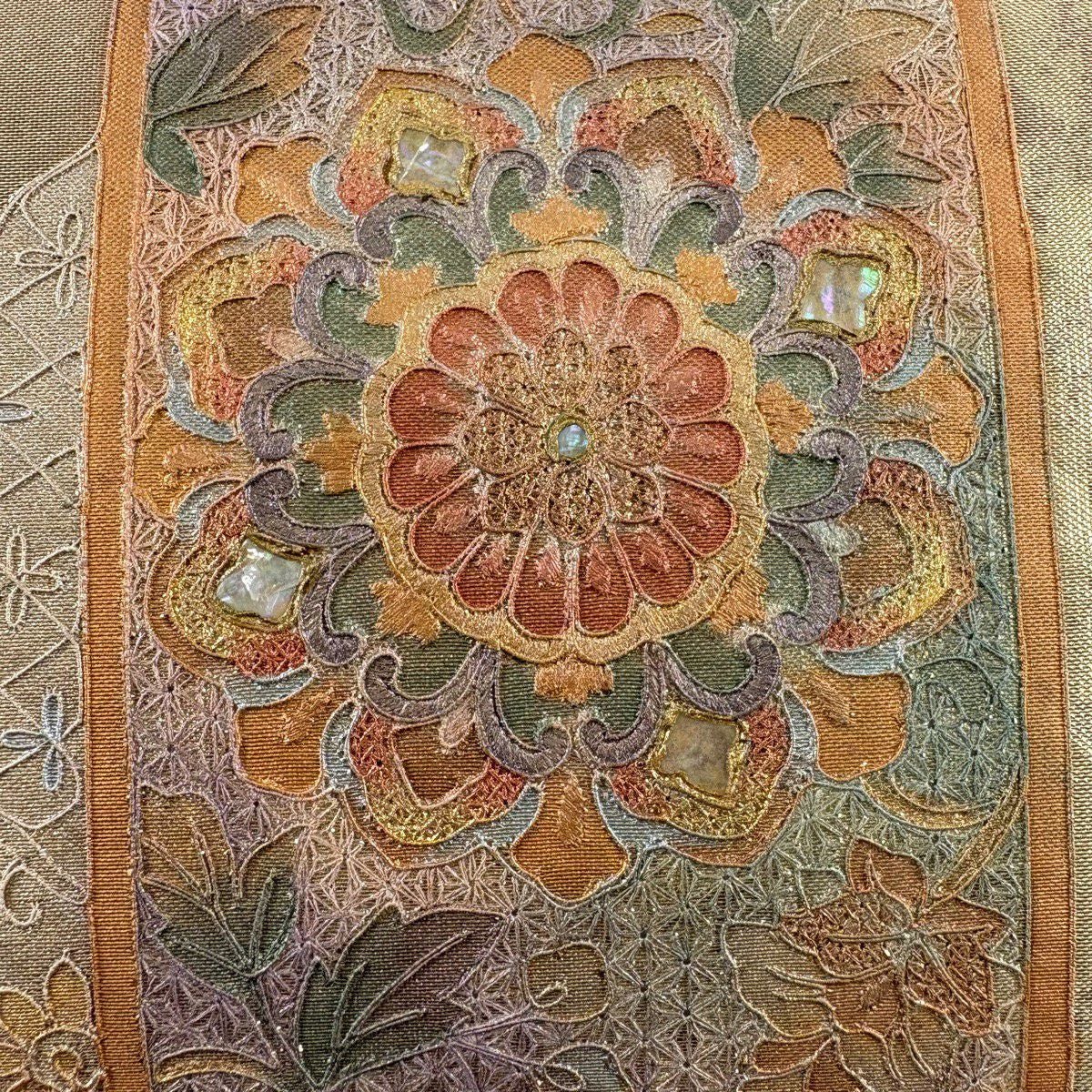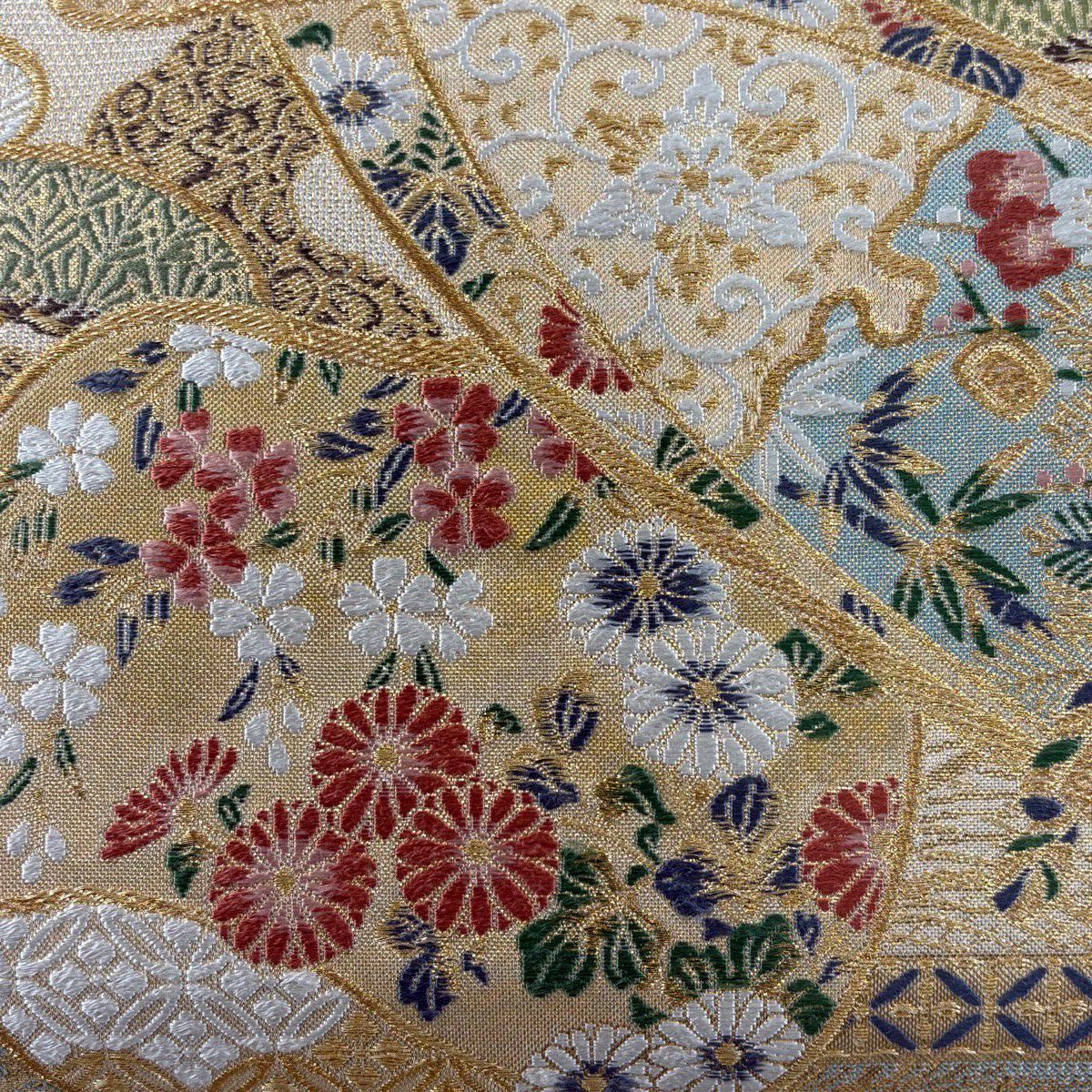 【美品】 袋帯 秀品 関西仕立て 華文 鳥 螺鈿 箔 金色 お太鼓柄 正絹