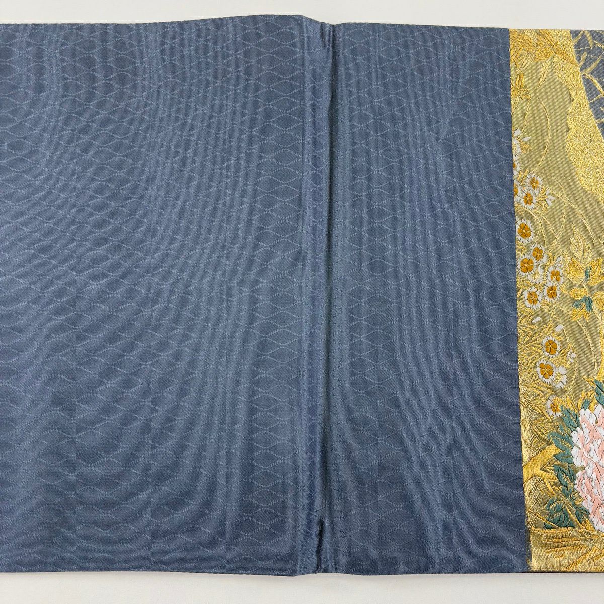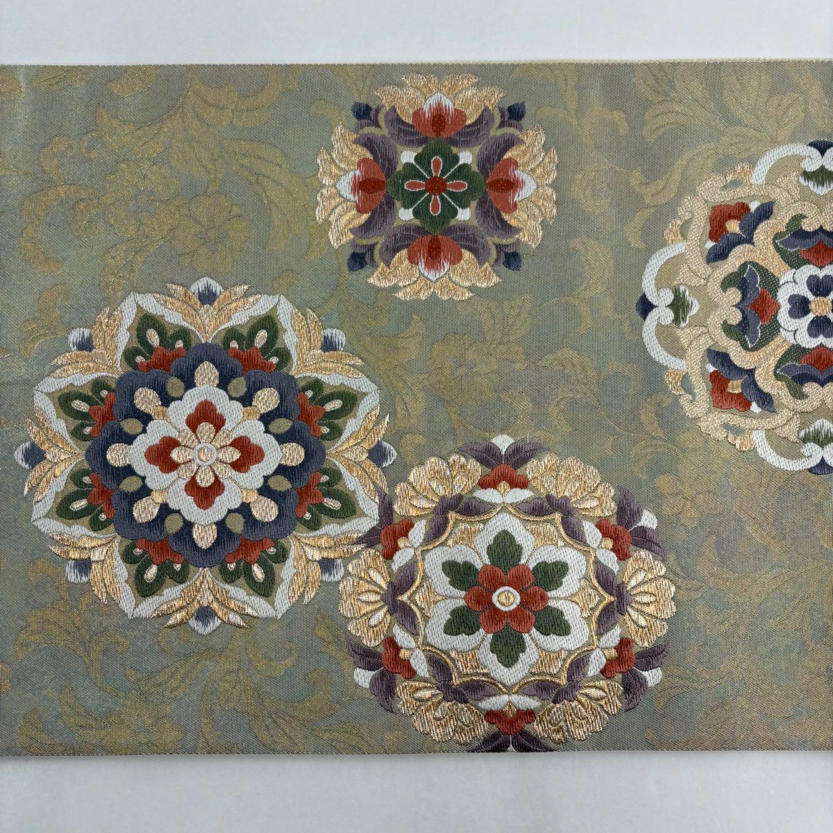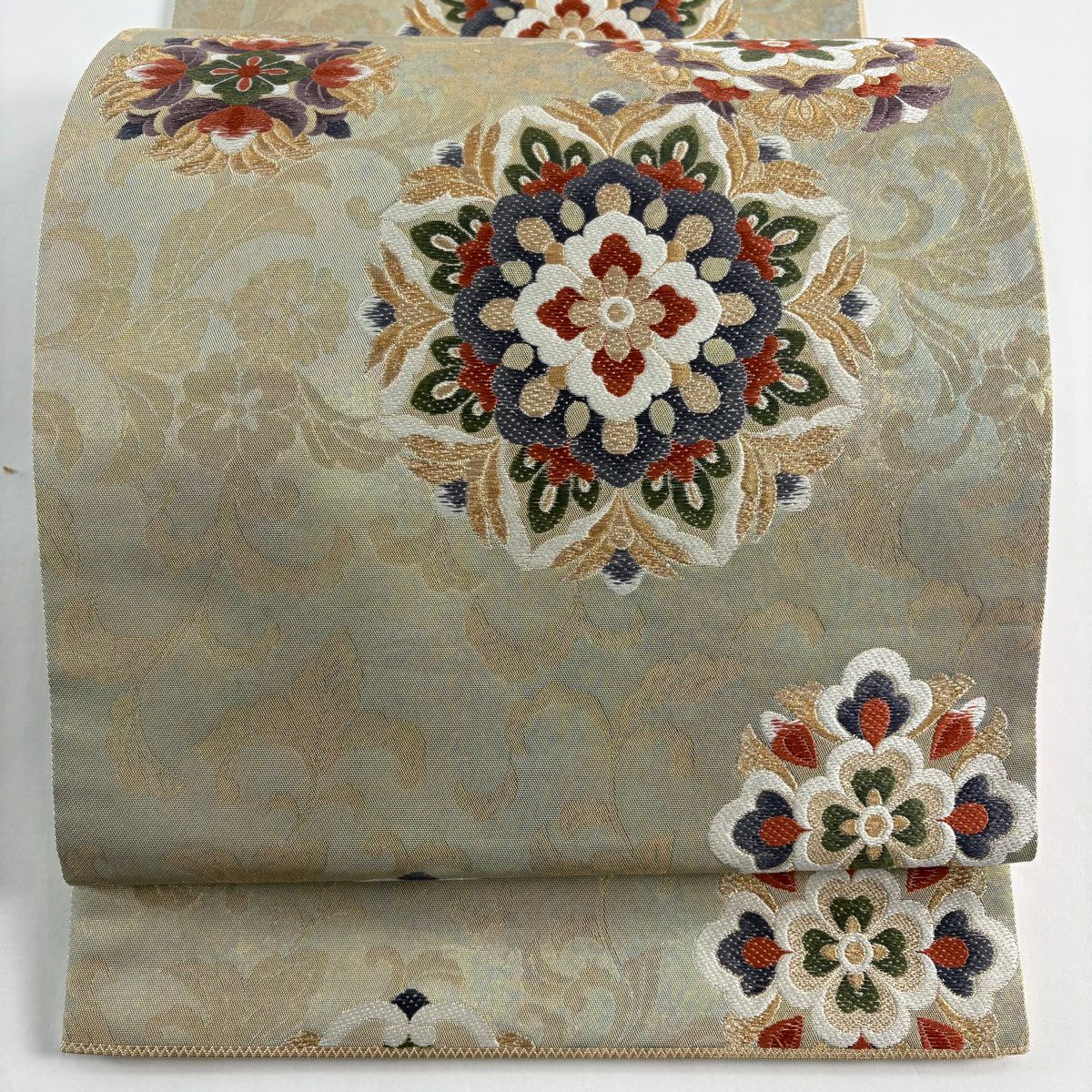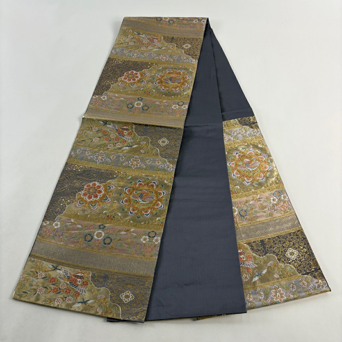 【美品】 袋帯 秀品 関西仕立て 華文 草花 刺繍 金糸 灰緑 六通 正絹