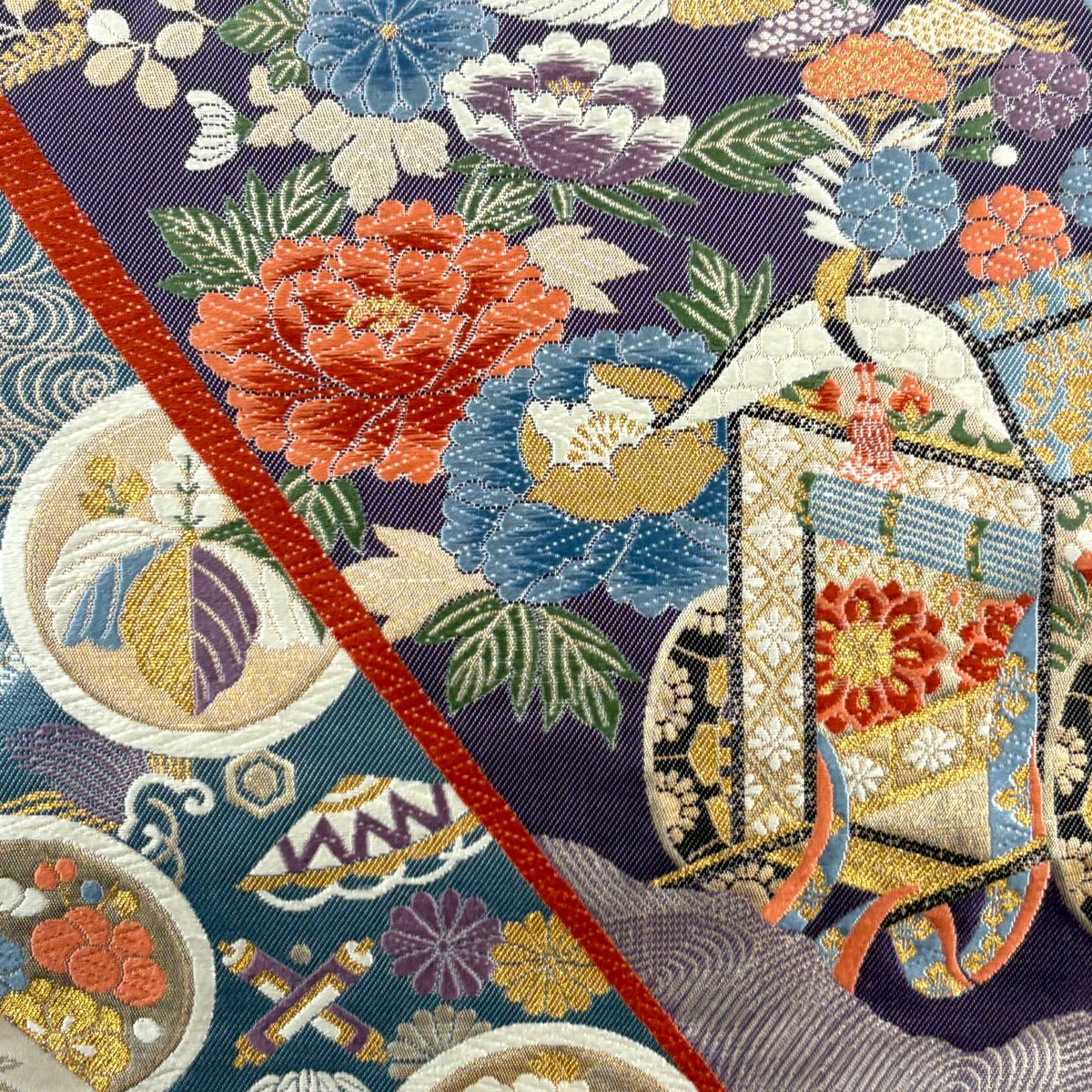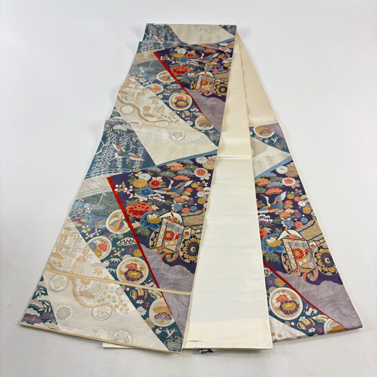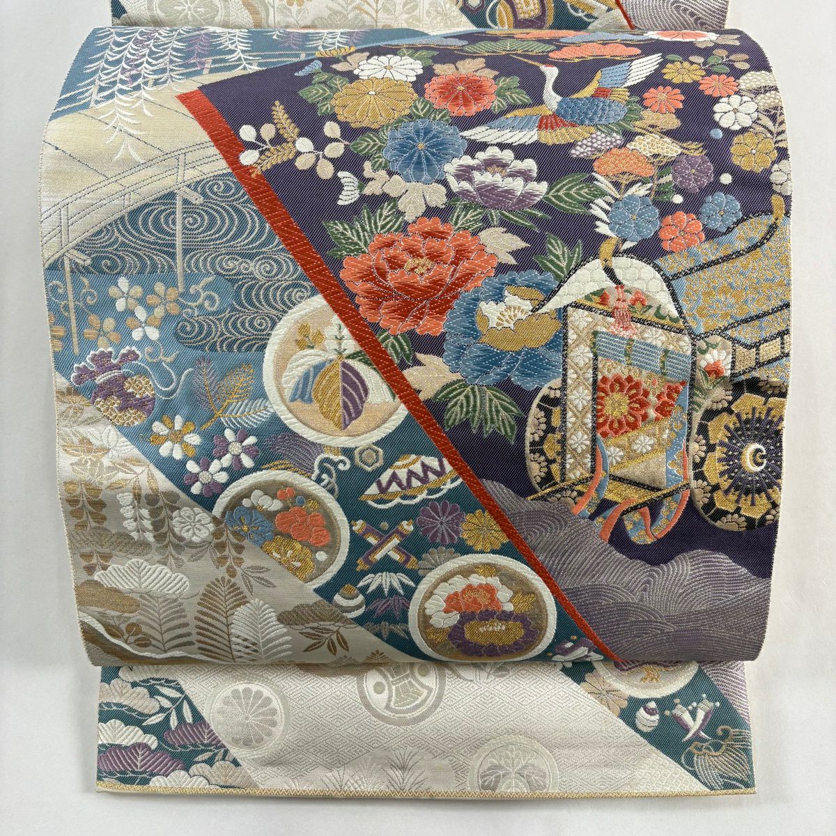 【美品】 袋帯 秀品 関西仕立て 御所車 草花 箔 金銀糸 紫 六通 正絹