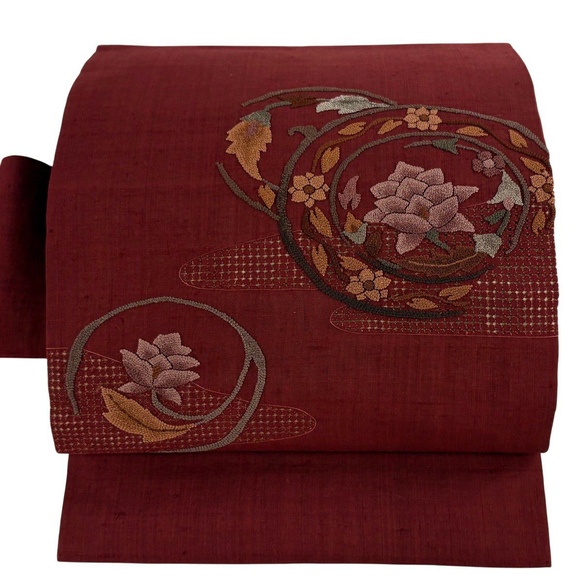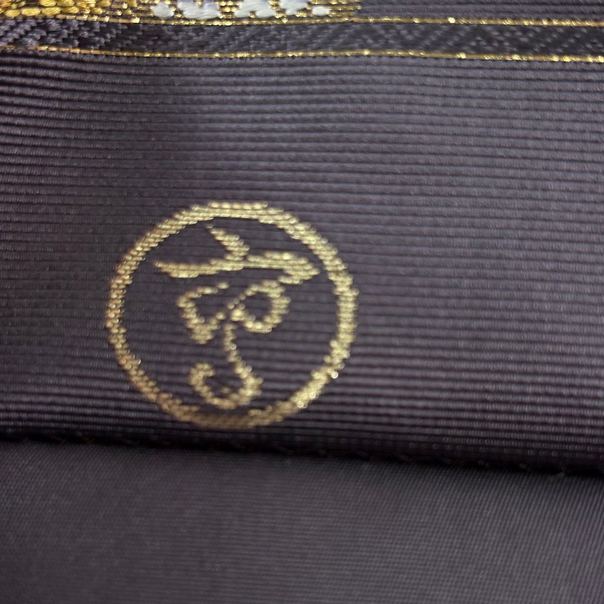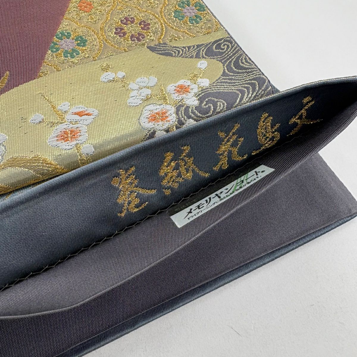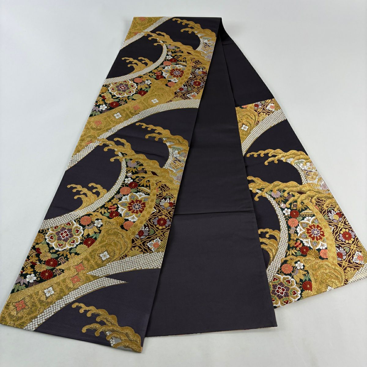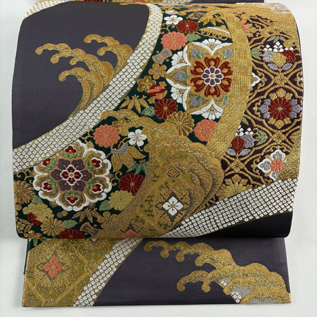 【美品】 袋帯 秀品 落款あり 華文 波頭 刺繍 金銀糸 濃紫 六通 正絹