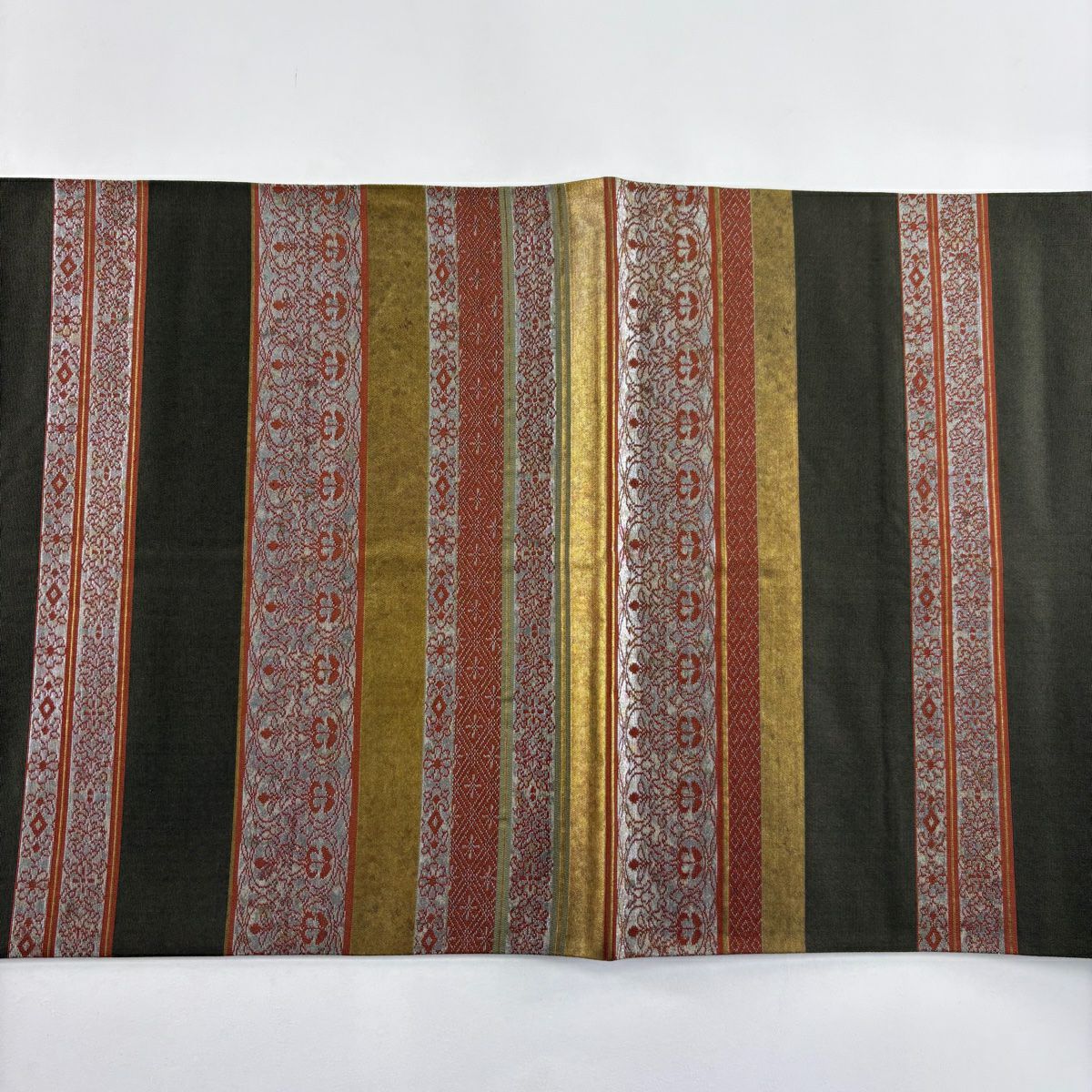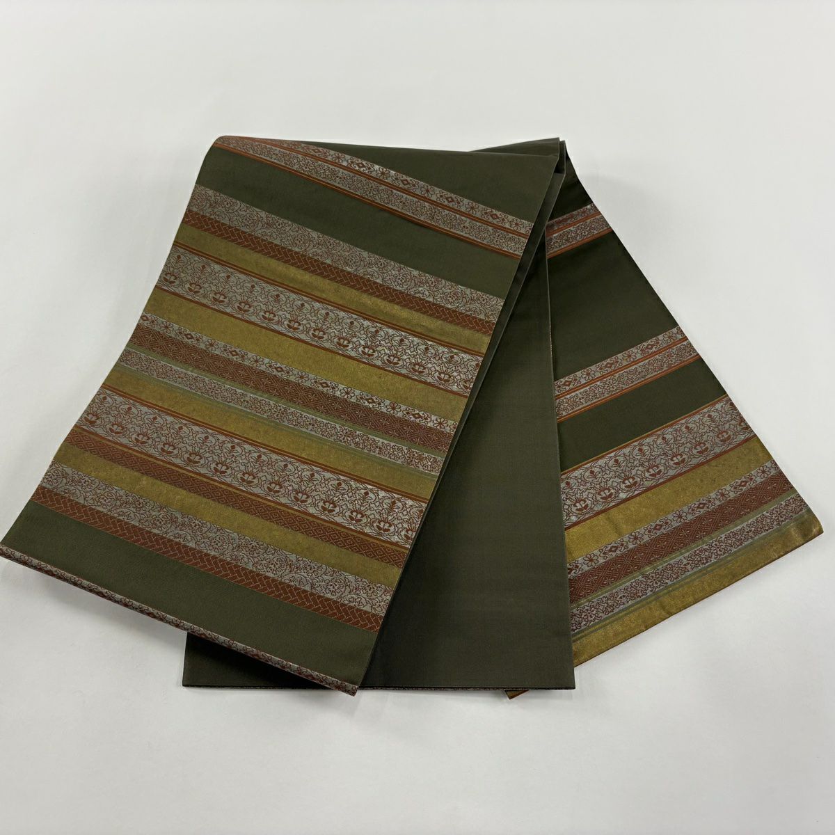 【美品】 袋帯 秀品 段唐草小紋詰 段縞 花唐草 箔 茶緑色 お太鼓柄 正絹