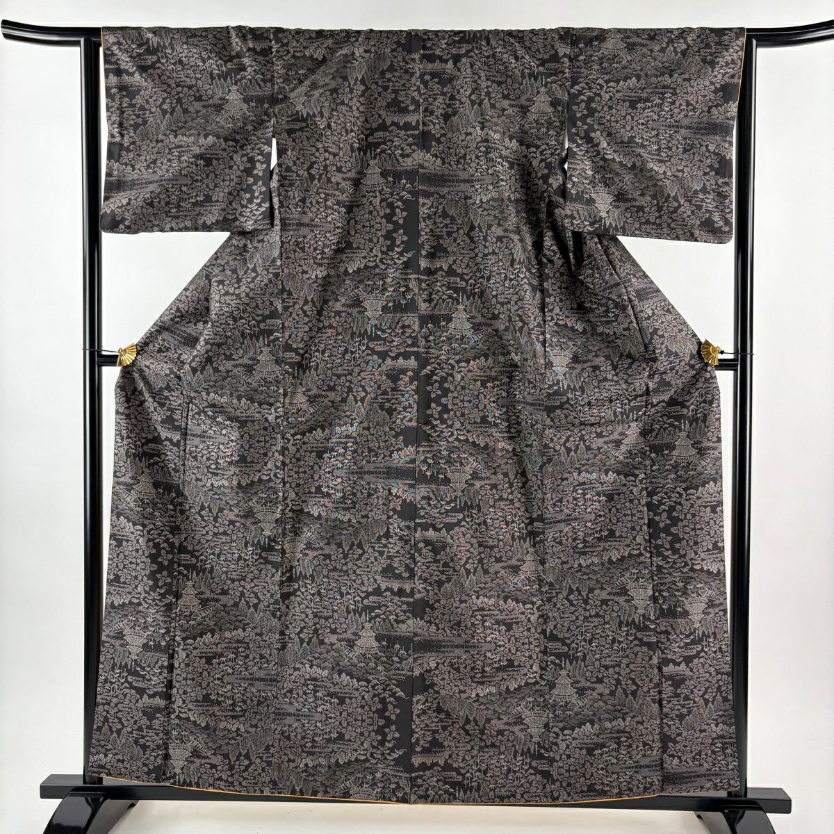 紬 身丈160.5cm 裄丈64cm M 袷 建物 樹木 焦茶色 正絹 秀品