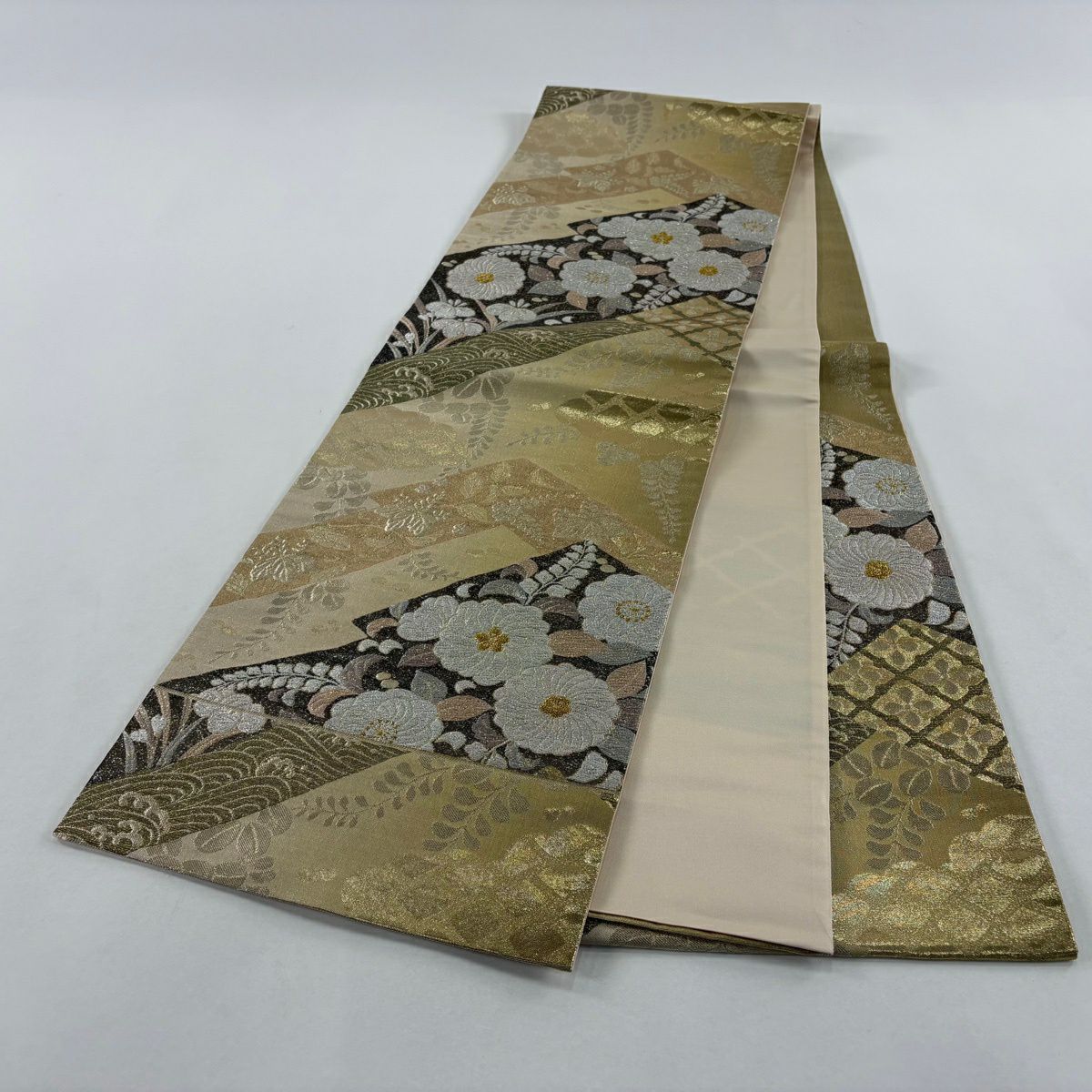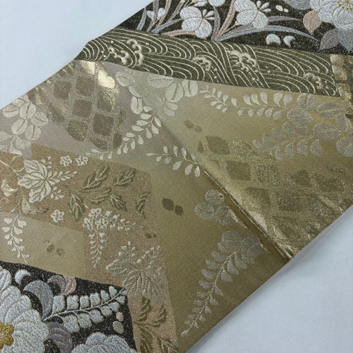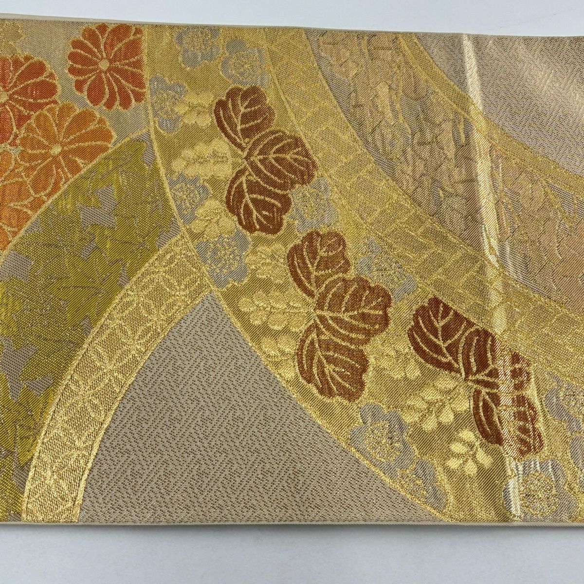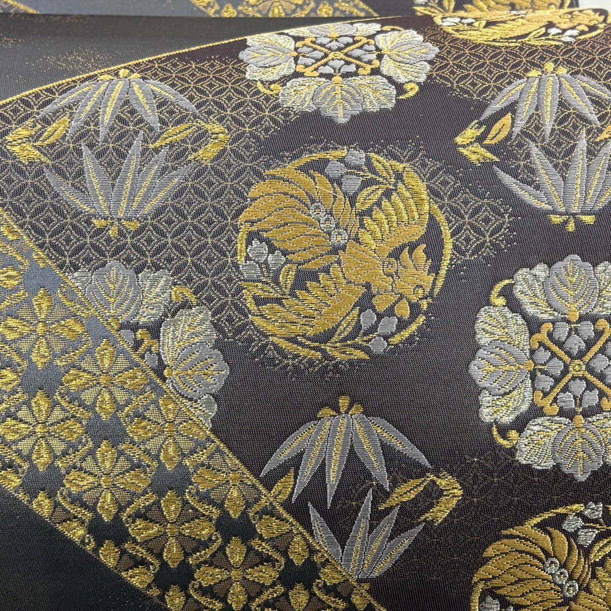 【美品】 袋帯 秀品 関西仕立て 草花 斜め格子 箔 金糸 金色 六通 正絹