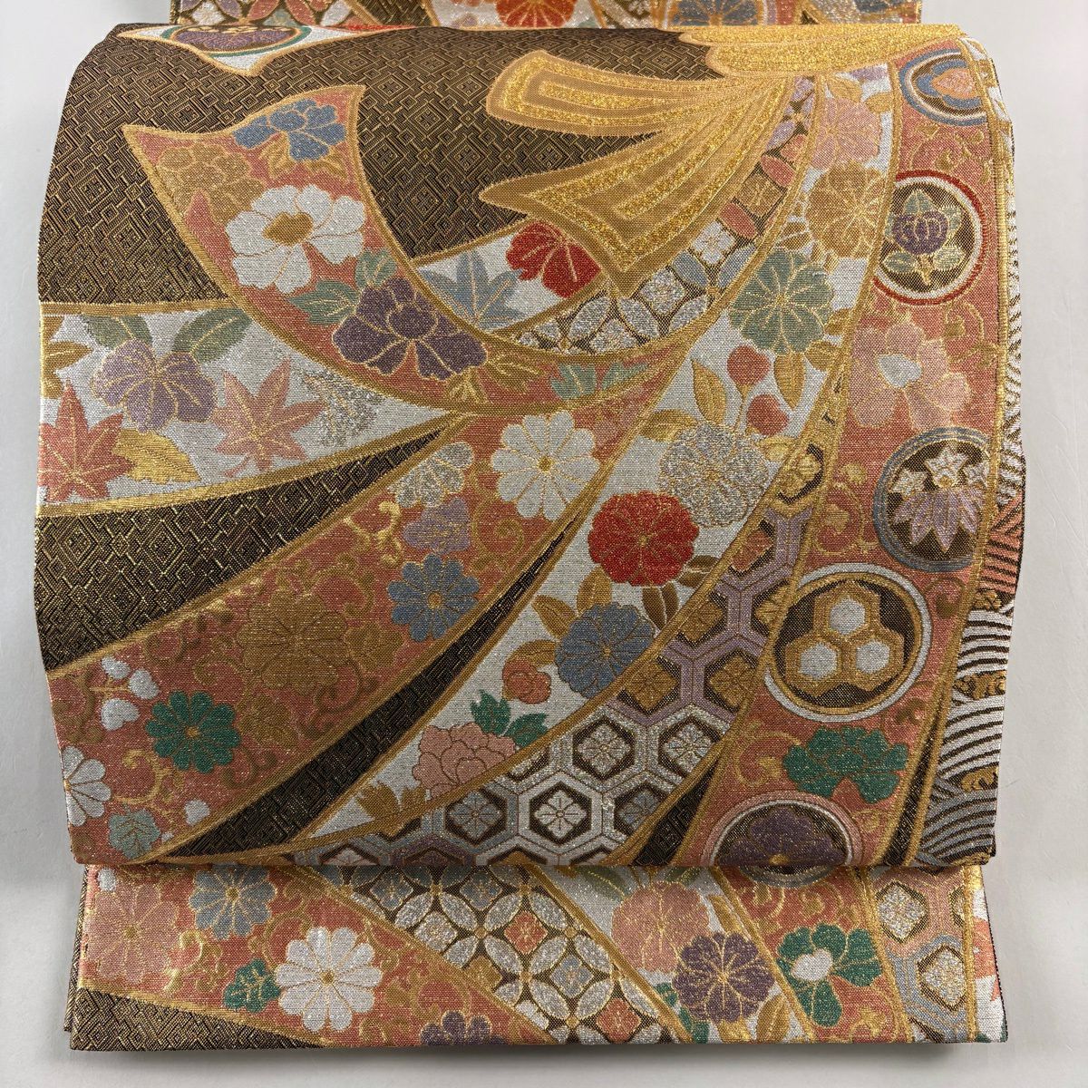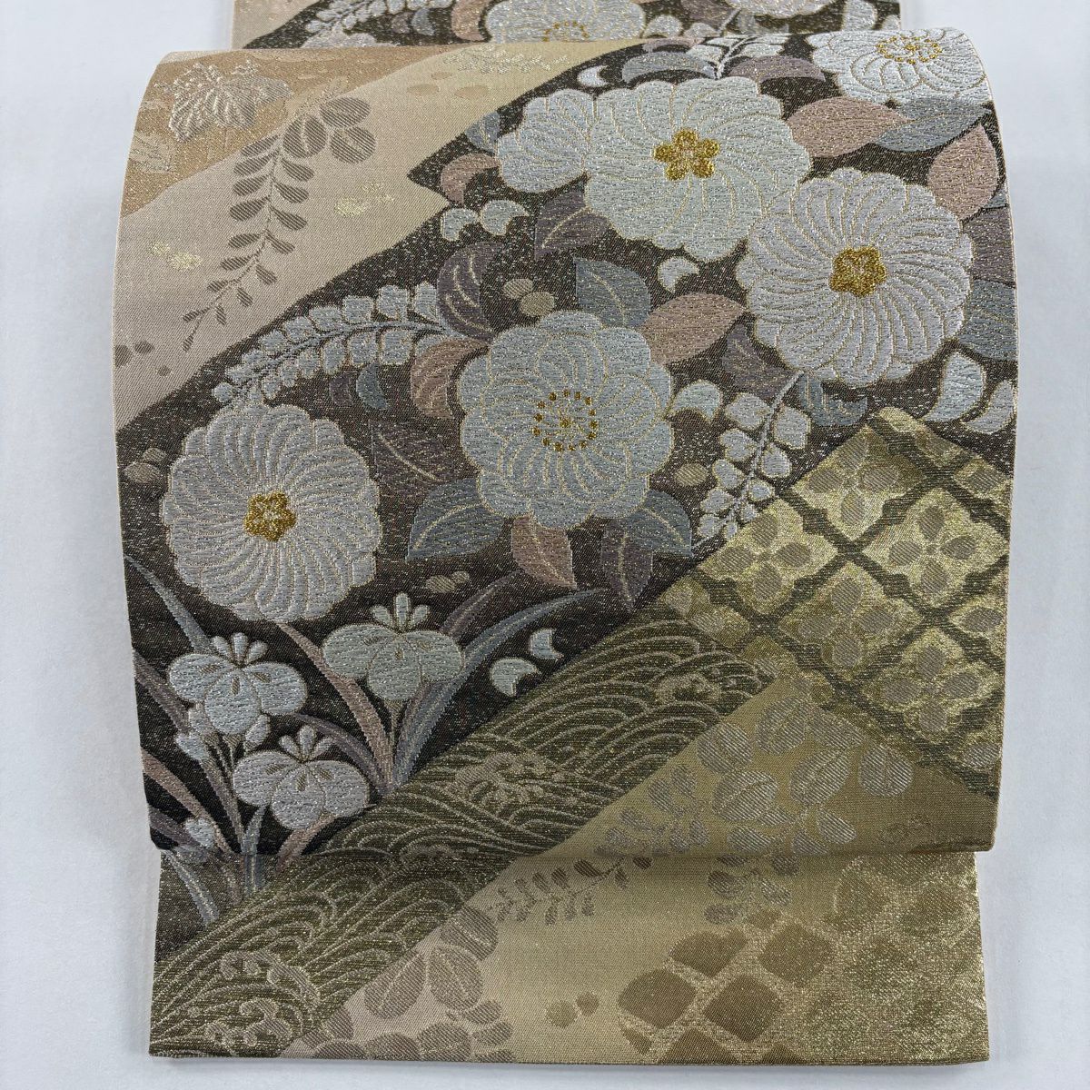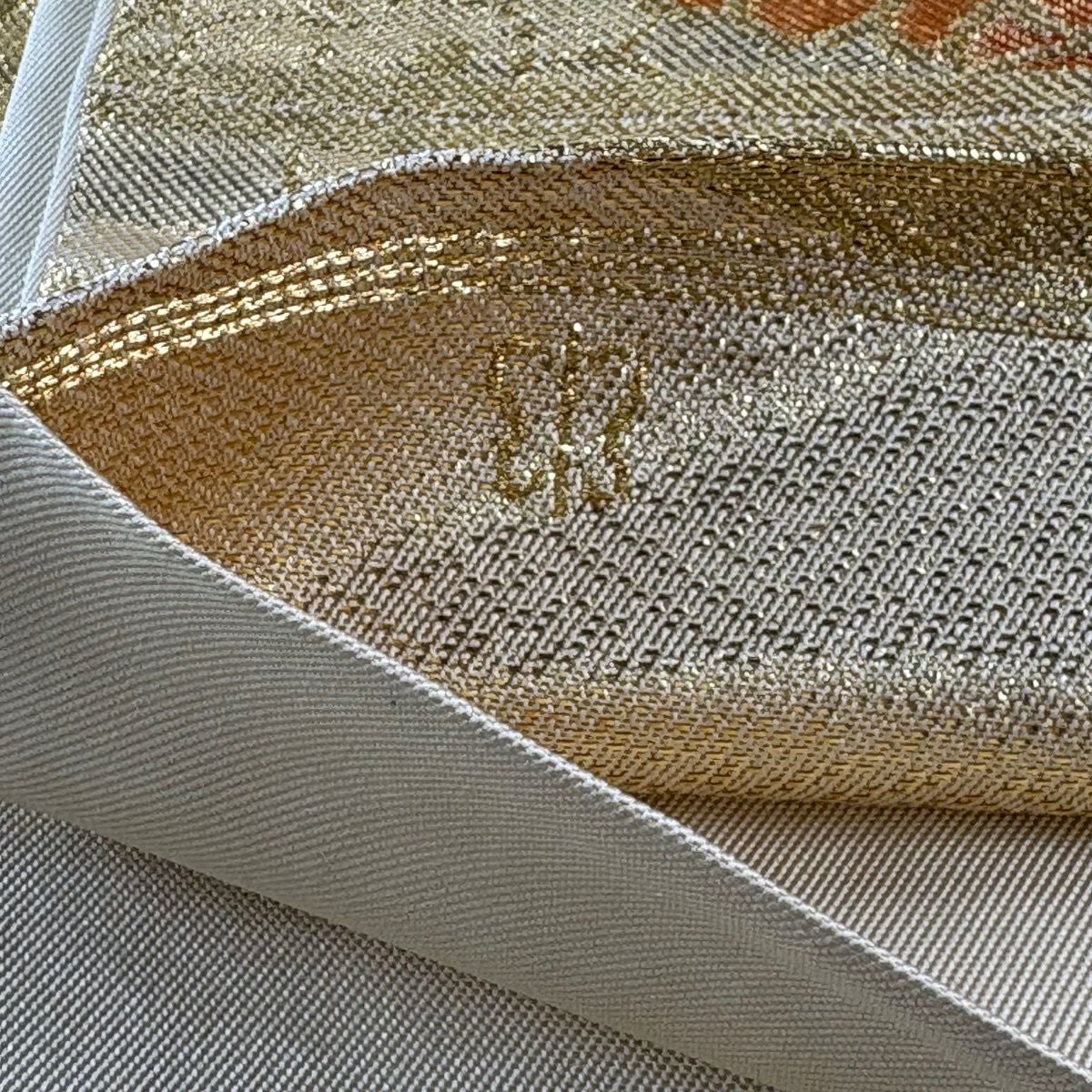 【美品】 袋帯 秀品 関西仕立て 草花 斜め格子 箔 金糸 金色 六通 正絹