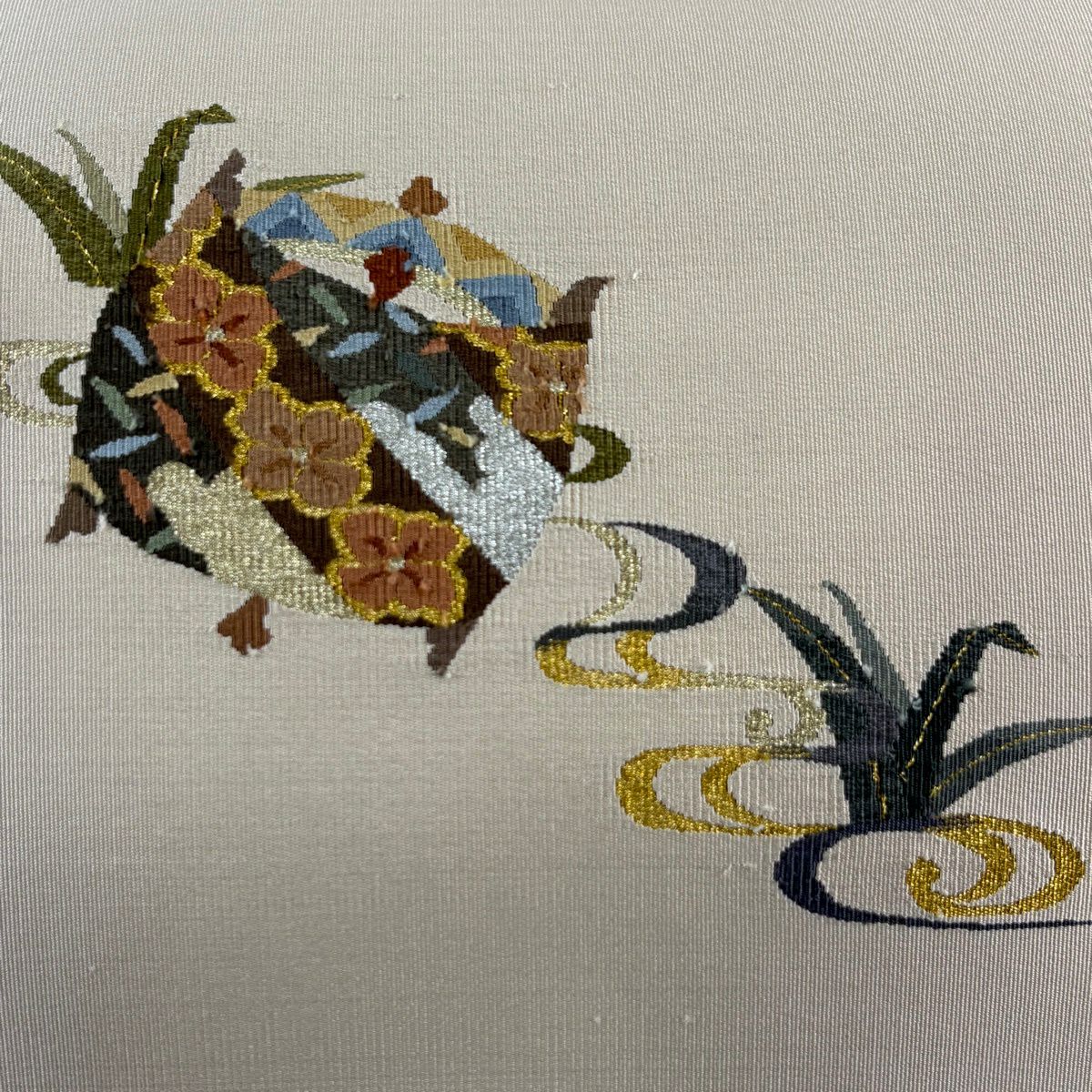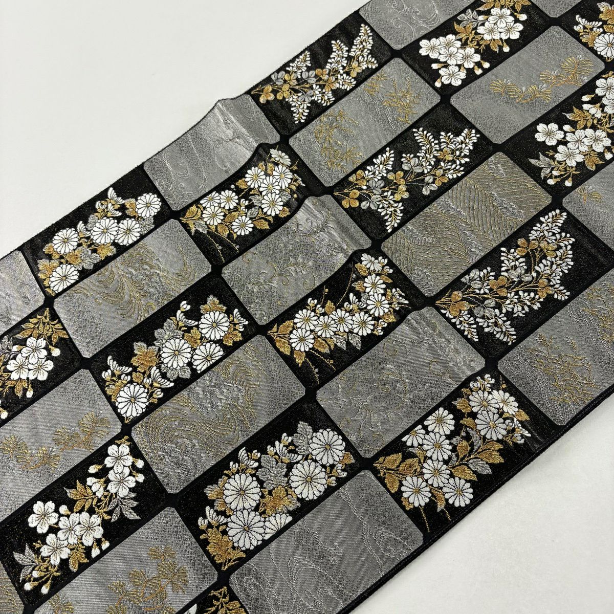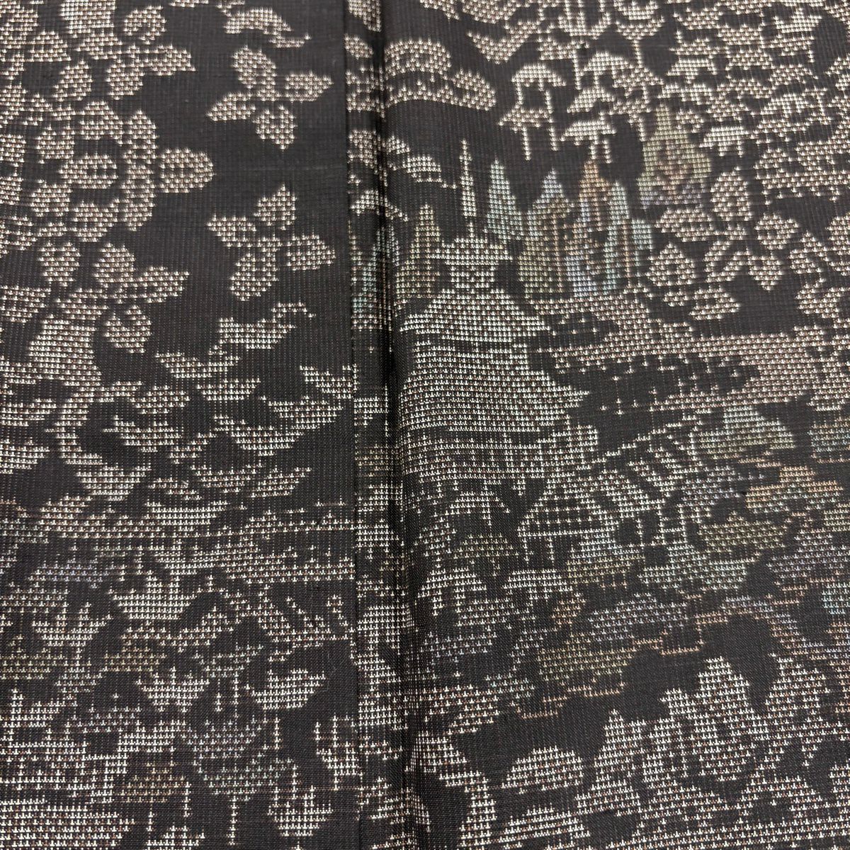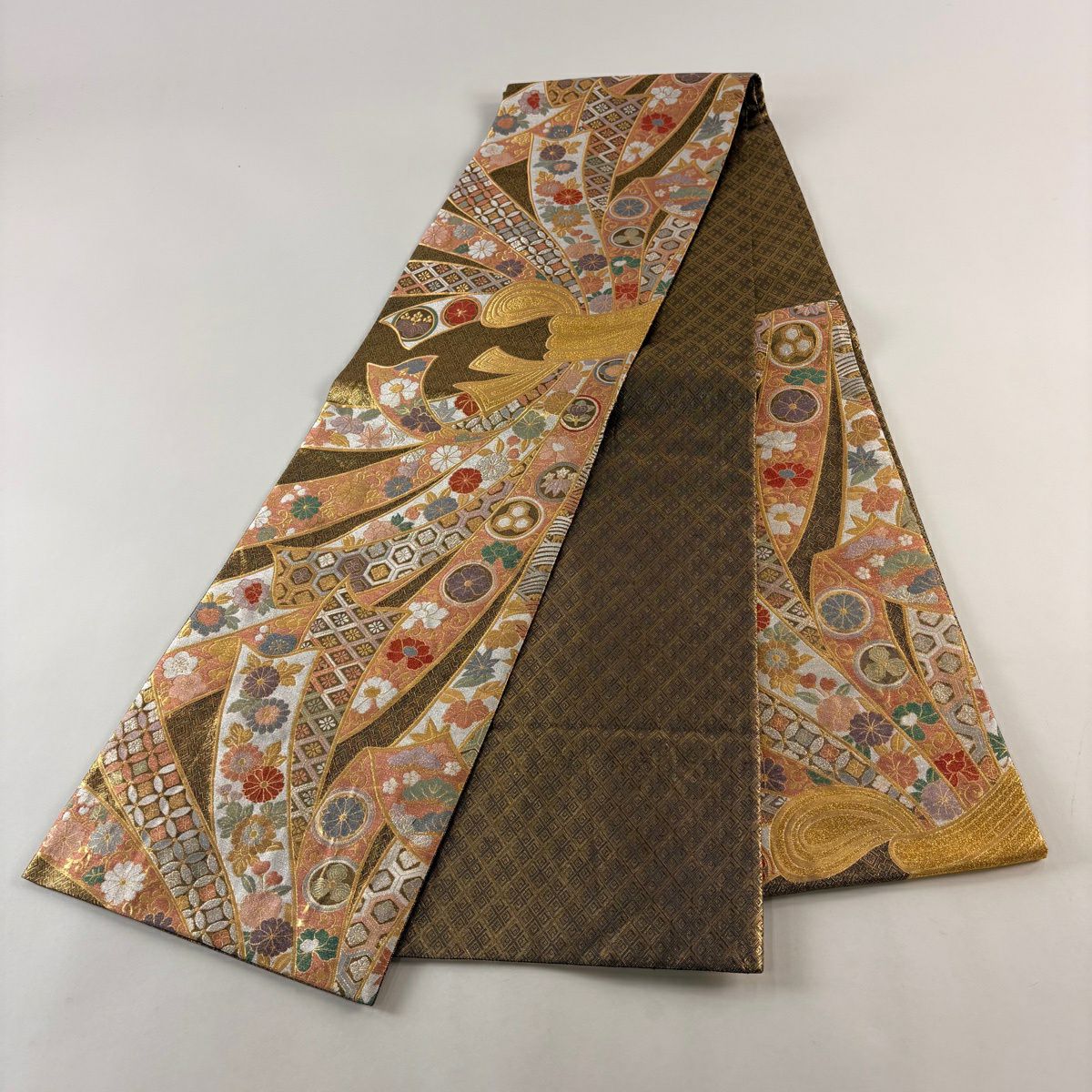 【美品】 袋帯 秀品 関西仕立て 草花 斜め格子 箔 金糸 金色 六通 正絹