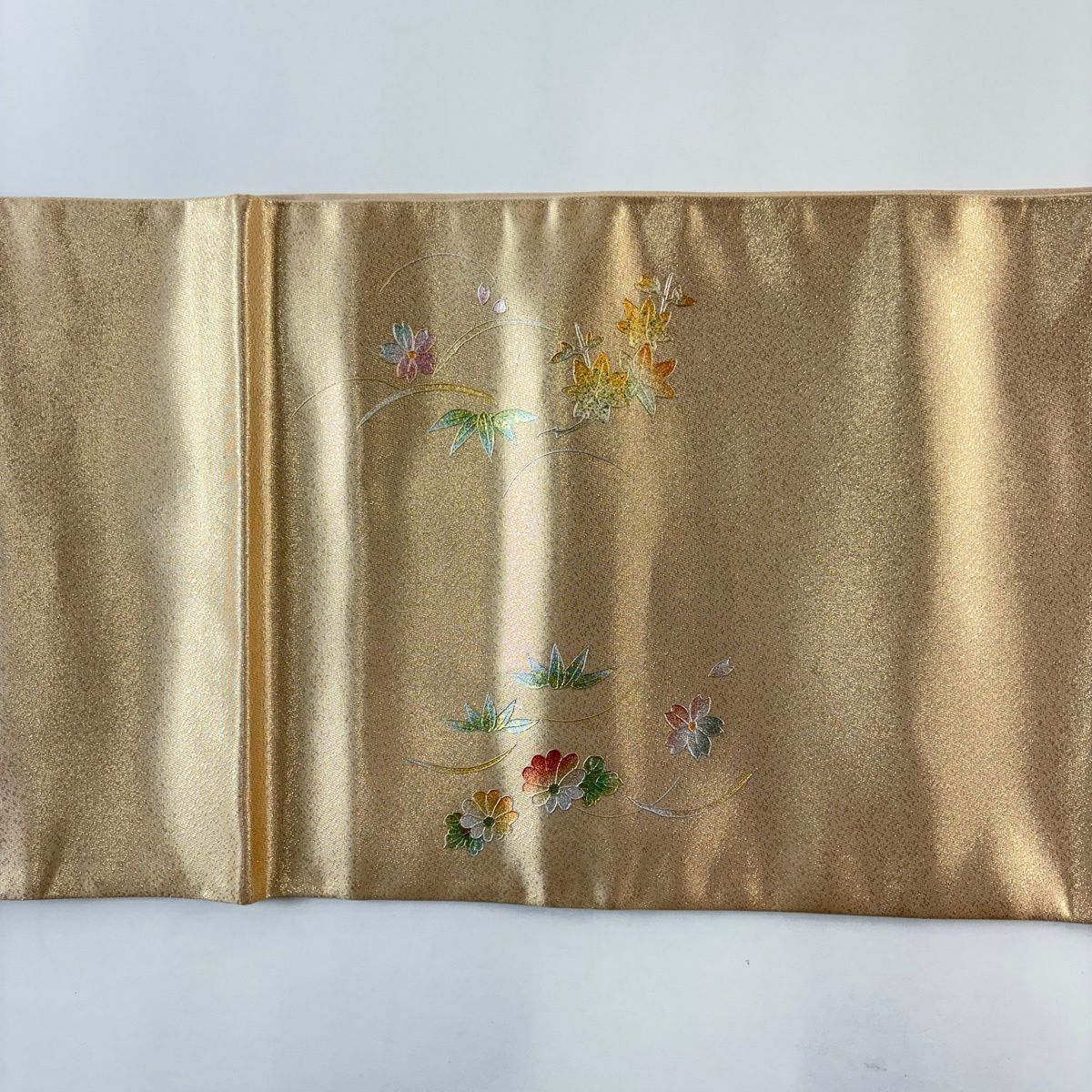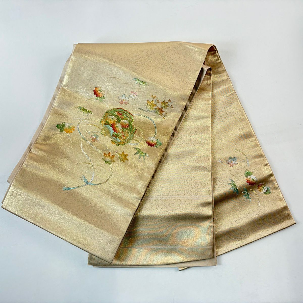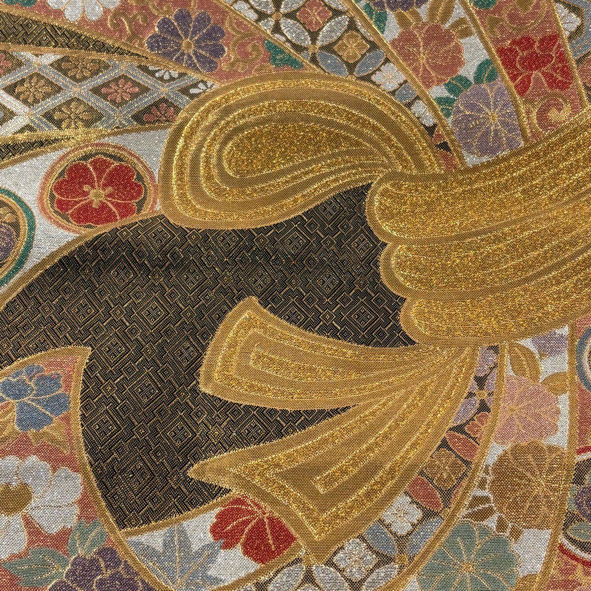 【美品】 袋帯 秀品 振袖向き 束ね熨斗 草花 金銀糸 箔 金色 六通 正絹