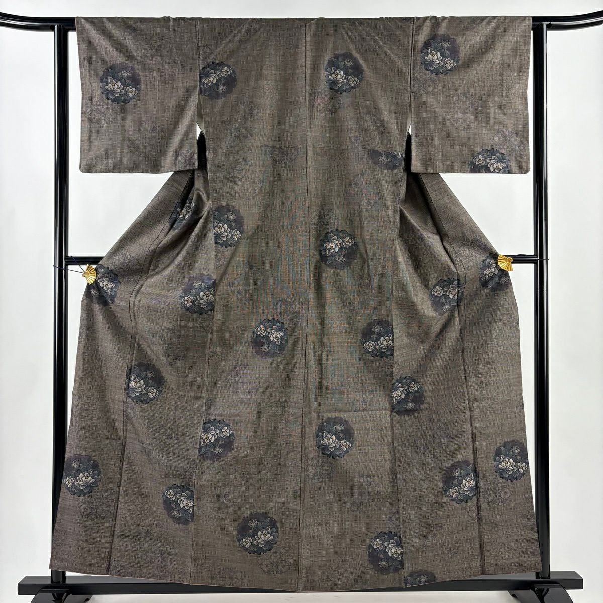 紬 身丈160cm 裄丈61.5cm S 袷 草花 雪輪 焦茶色 正絹 秀品