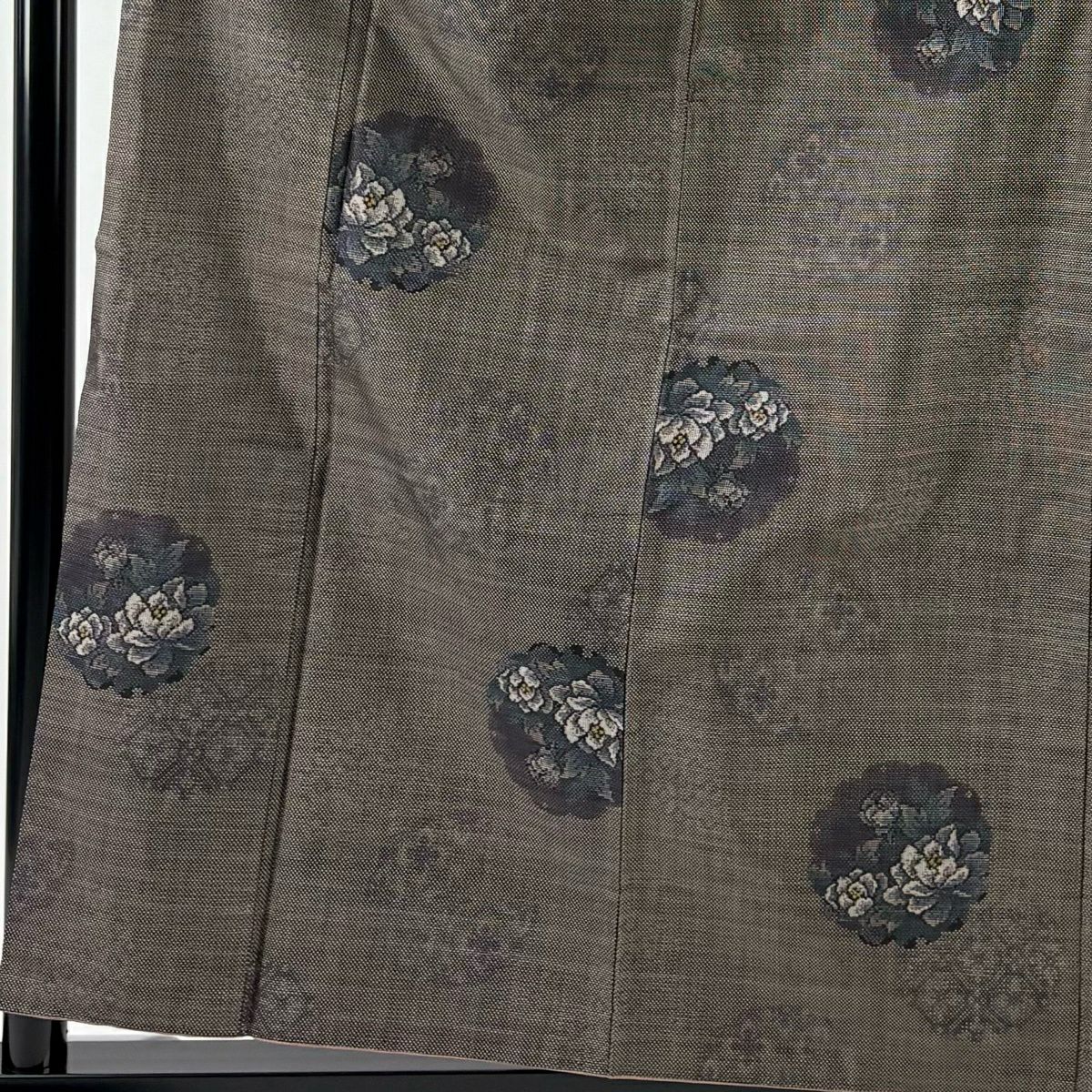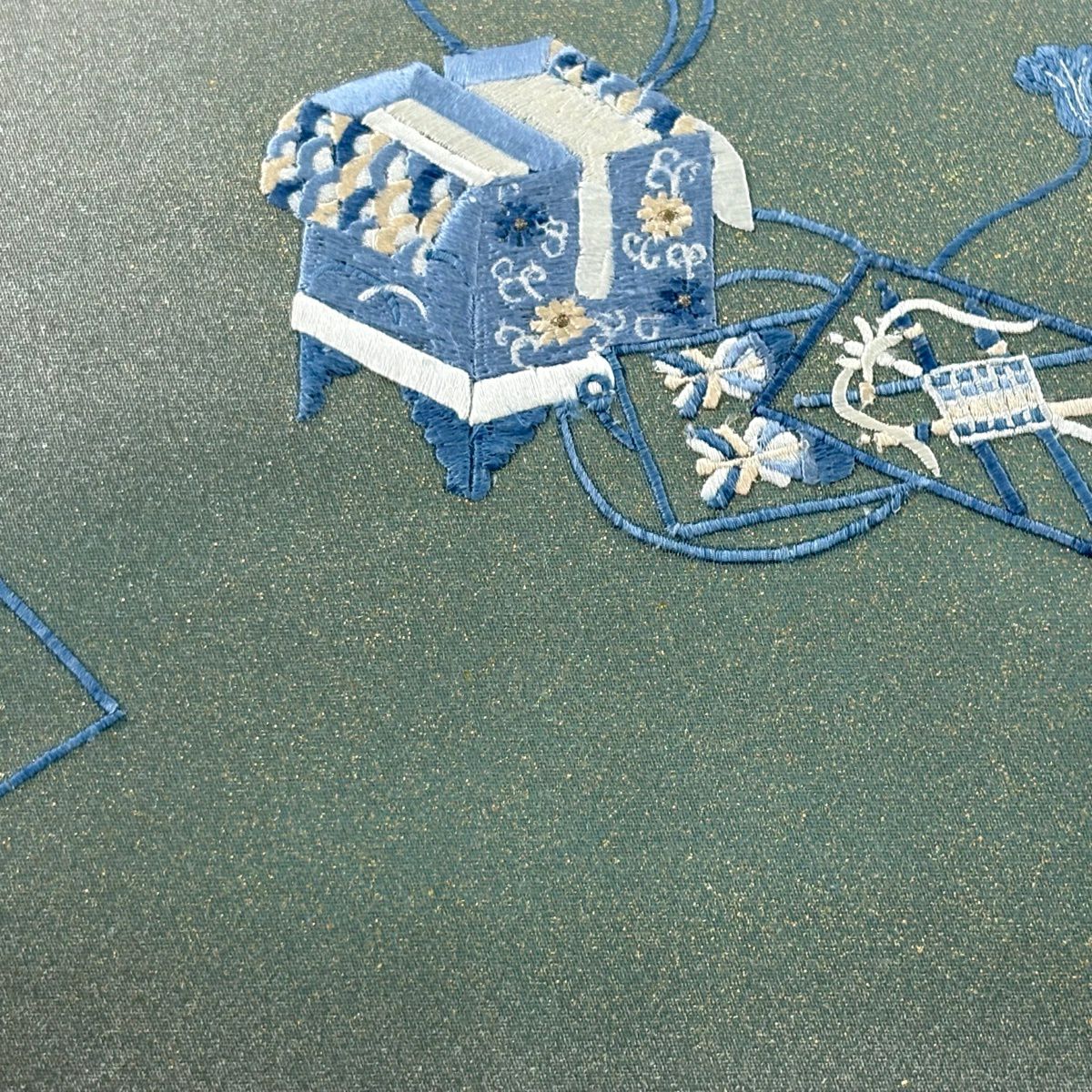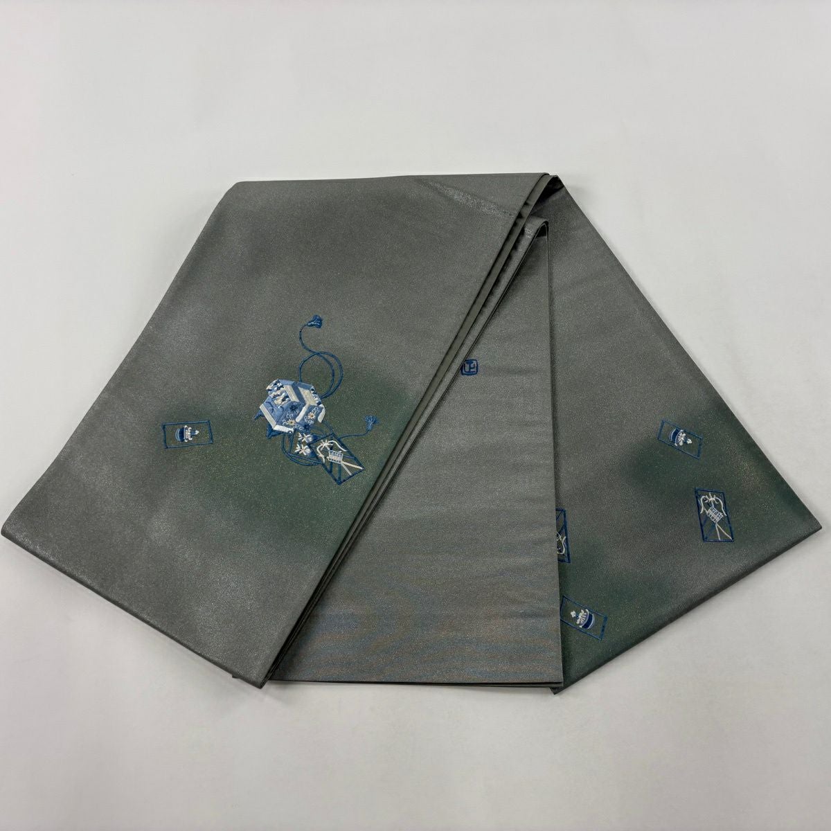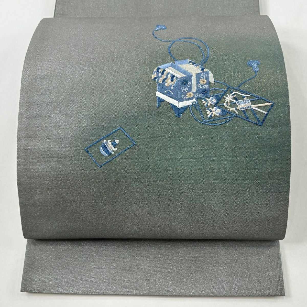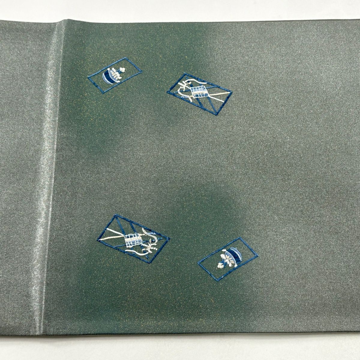 【美品】 袋帯 秀品 落款あり 道具箱 菊 刺繍 箔 灰緑 お太鼓柄 正絹