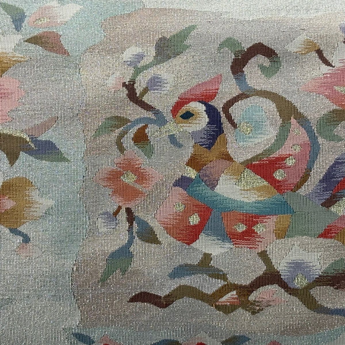 袋帯 秀品 関西仕立て 蜀江紋 華文 刺繍 金銀彩 青灰色 お太鼓柄 正絹