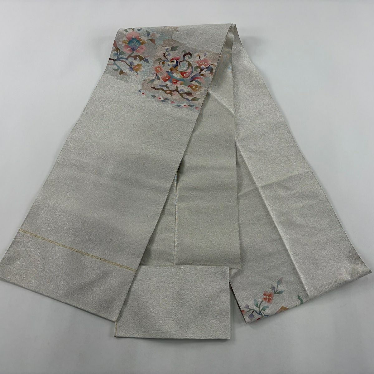 名古屋帯 秀品 八寸名古屋帯 松葉仕立て トンネル仕立て 草花 鳥 金銀糸 白 正絹