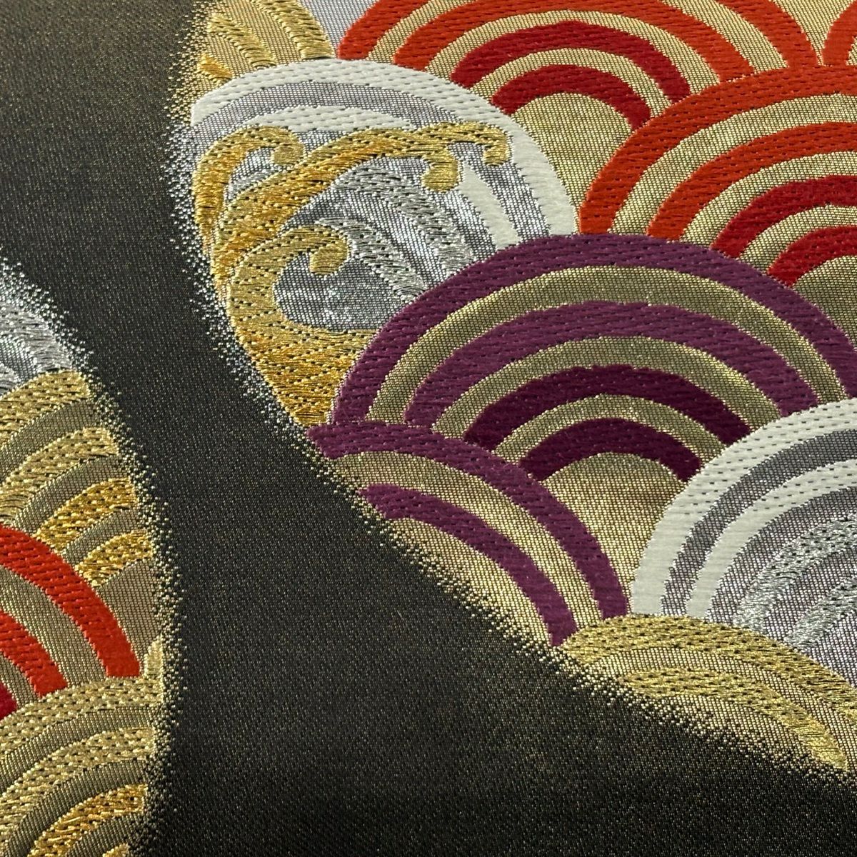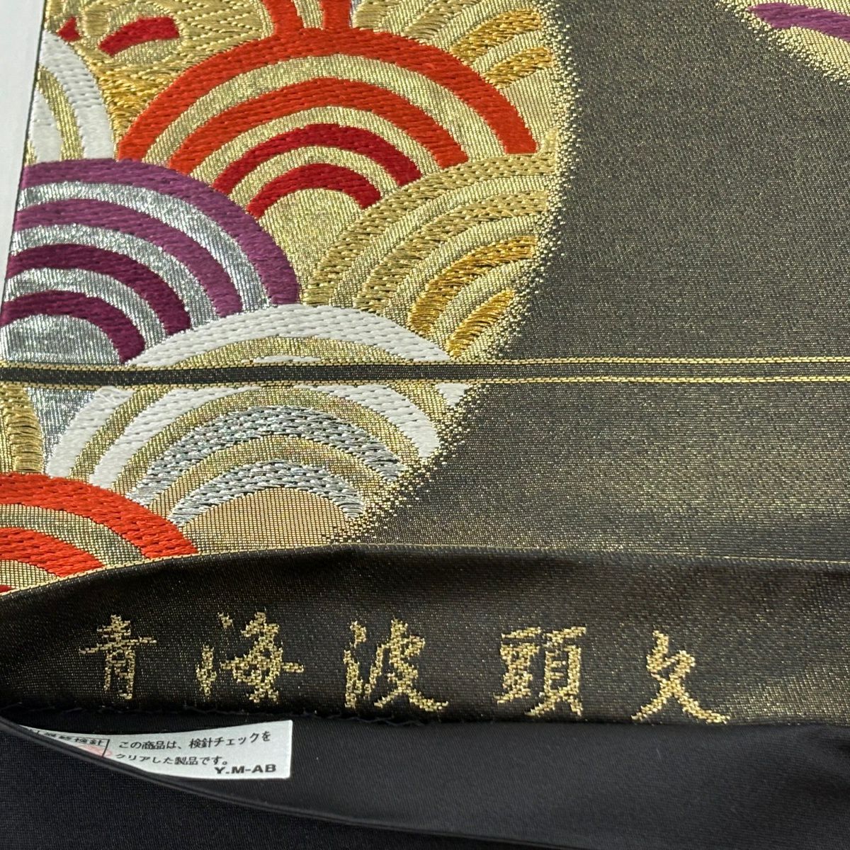 【美品】 袋帯 秀品 関西仕立て 青海波 波頭 箔 金通し 黒 六通 正絹