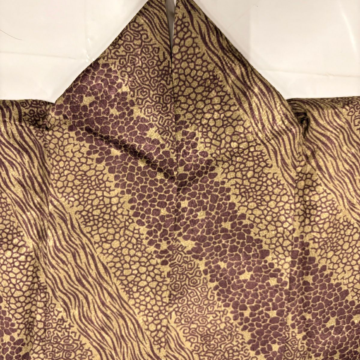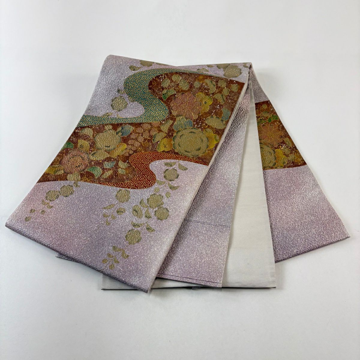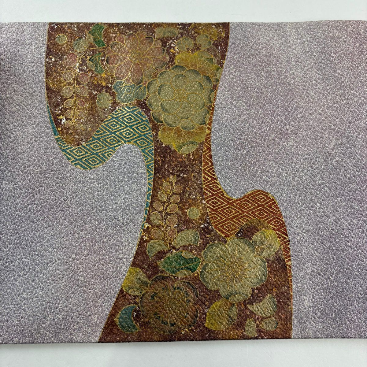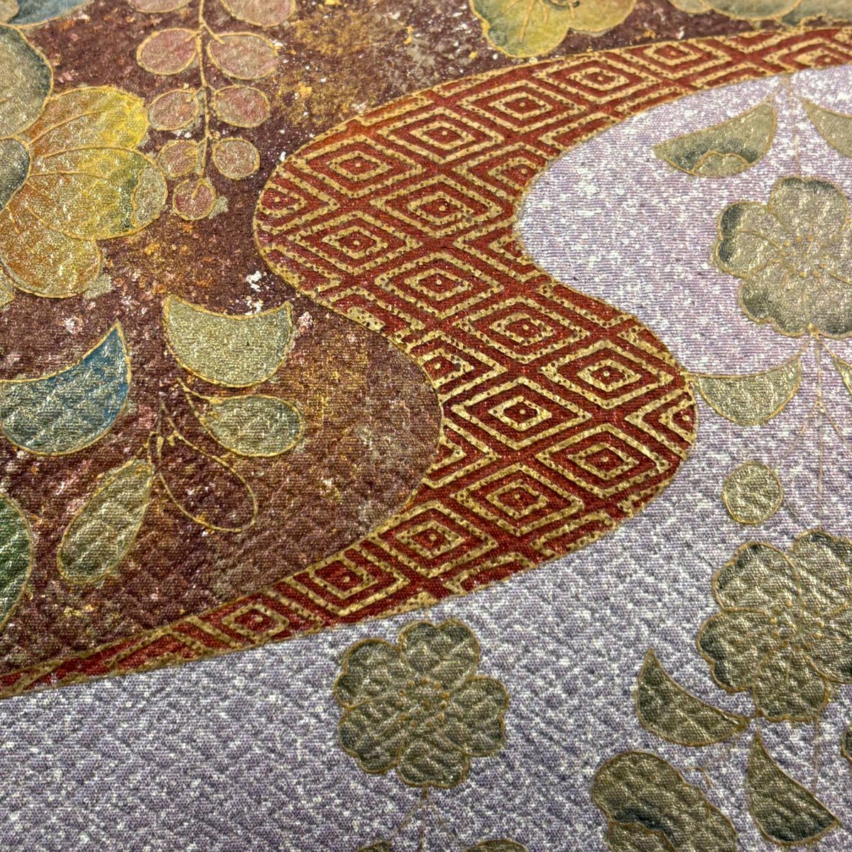 【美品】 袋帯 秀品 辻が花柄 幾何学模様 金糸 箔 灰紫 お太鼓柄 正絹