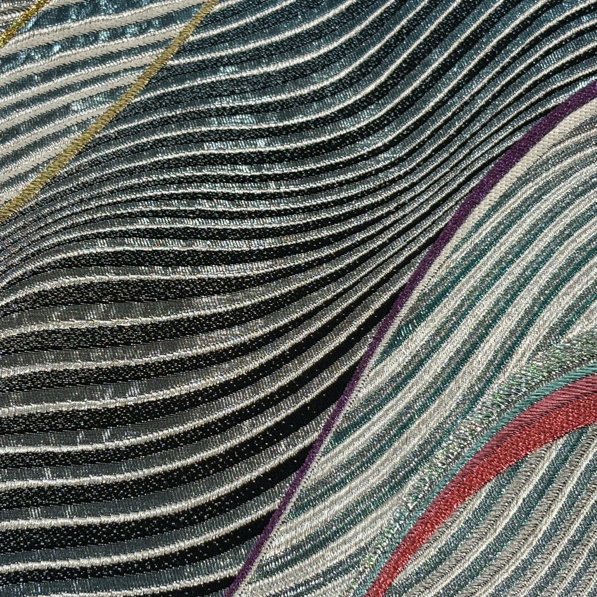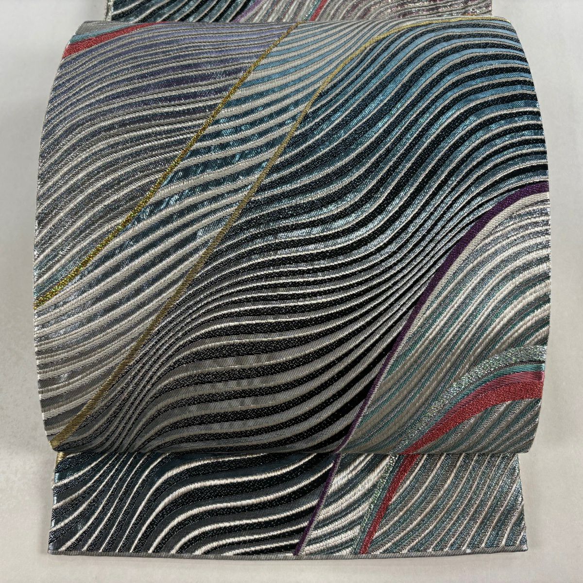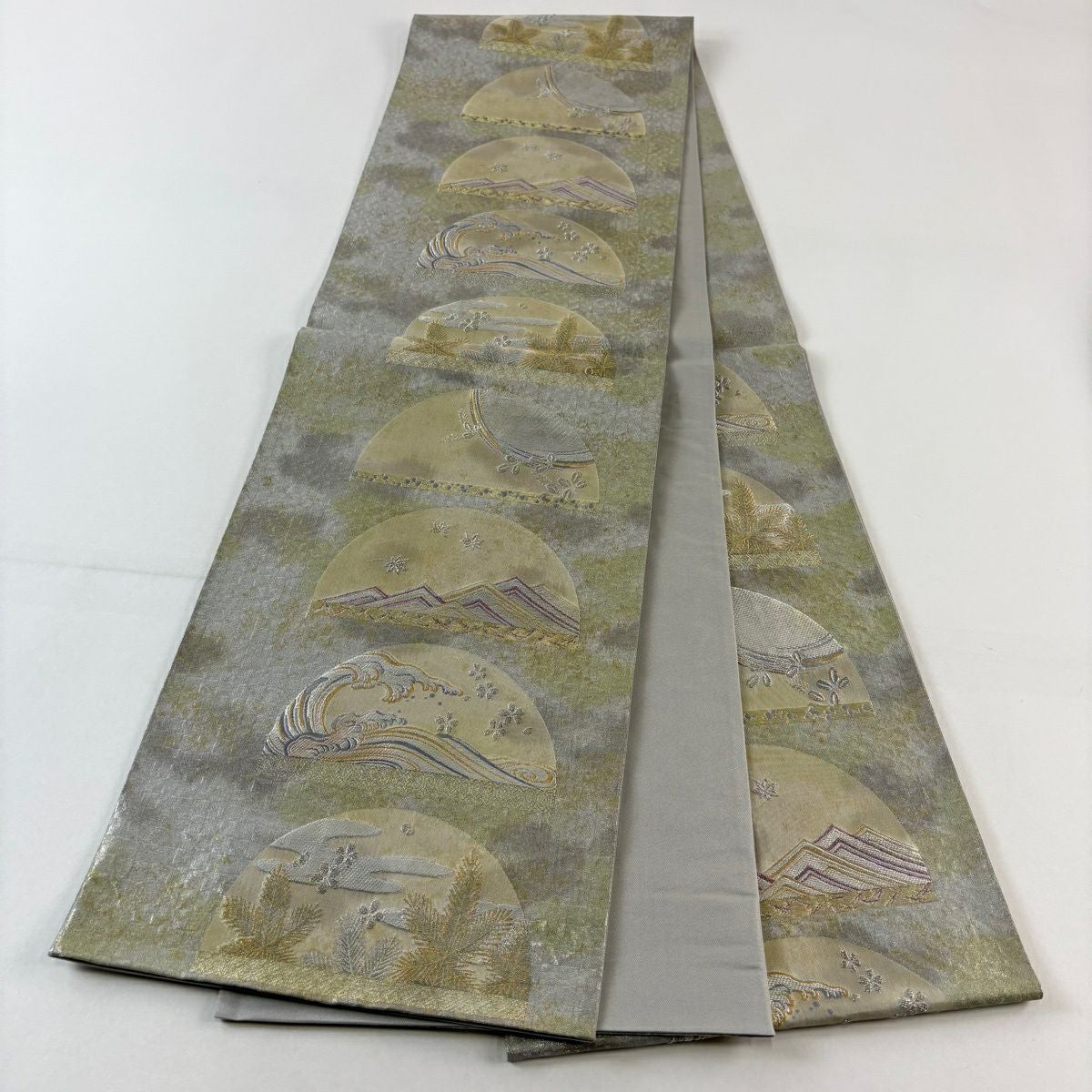 【美品】 袋帯 秀品 ワンポイント柄 松 波 箔 螺鈿 灰緑 六通 正絹