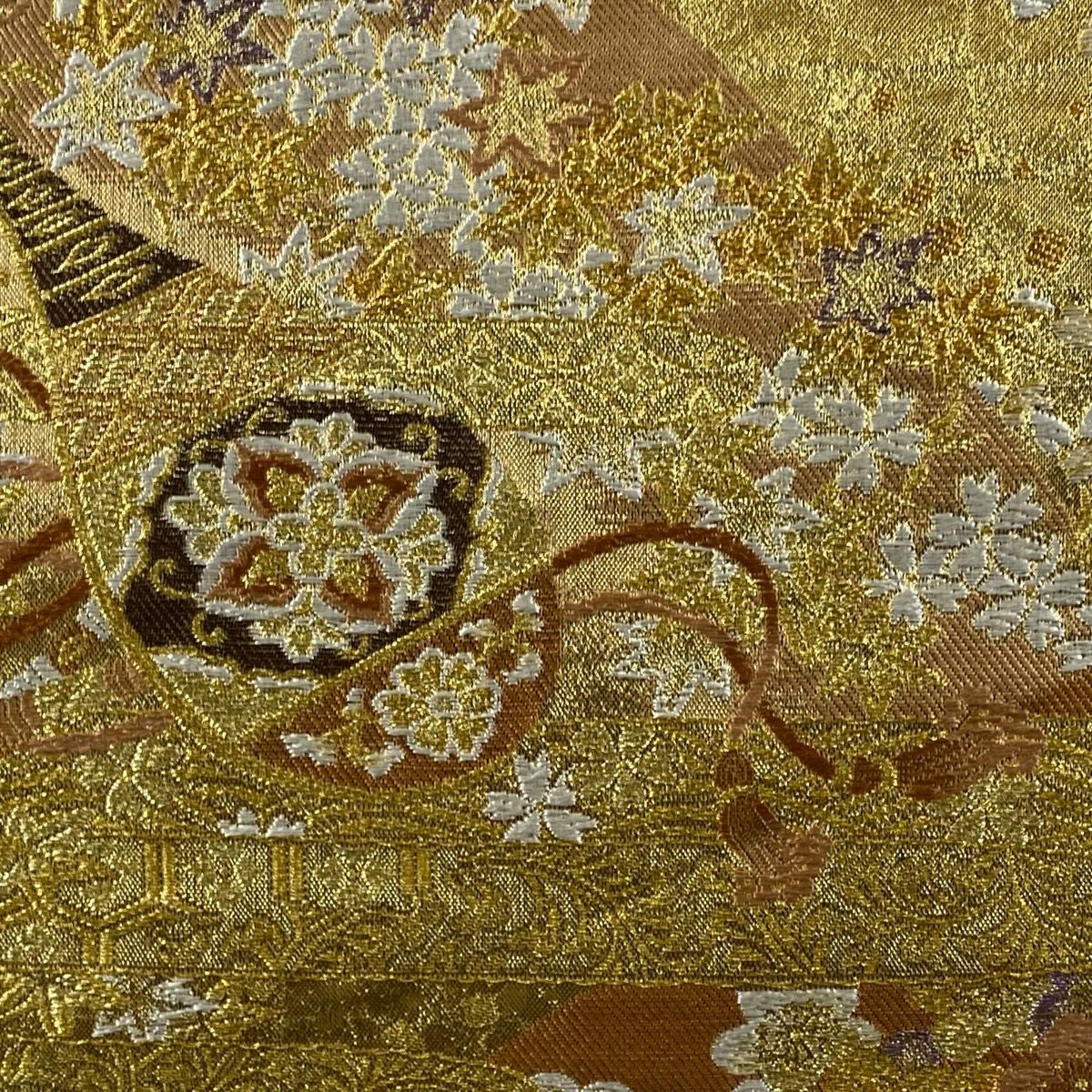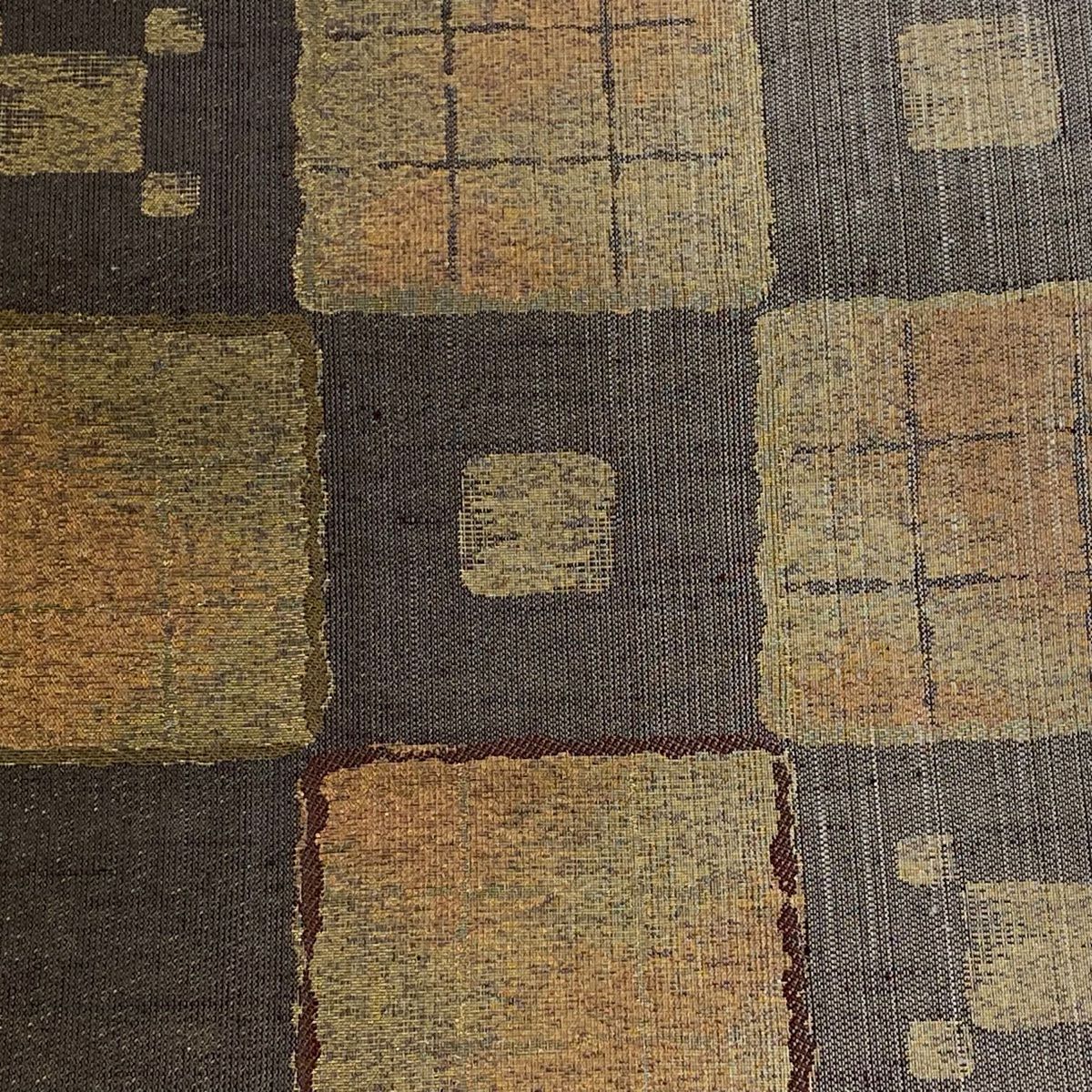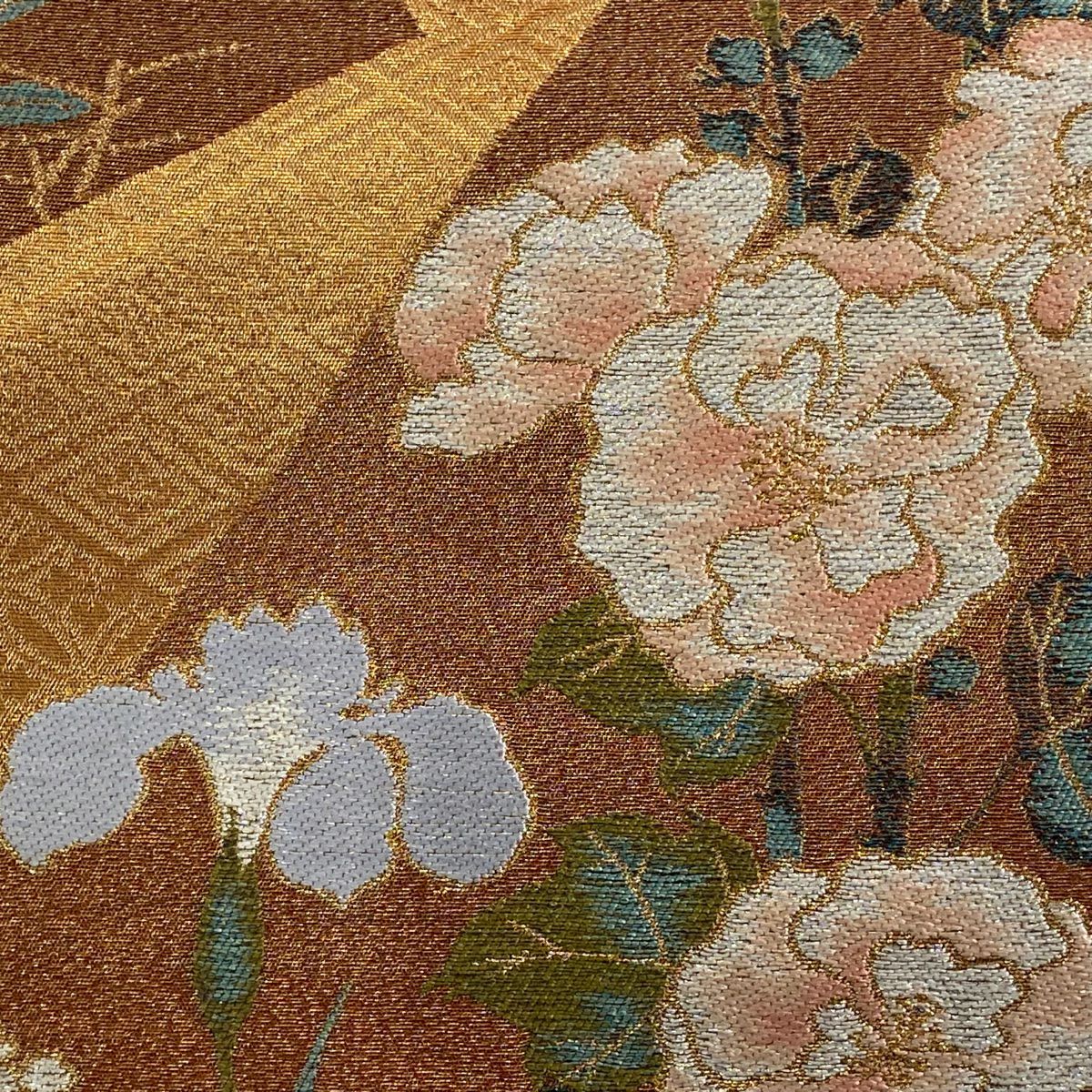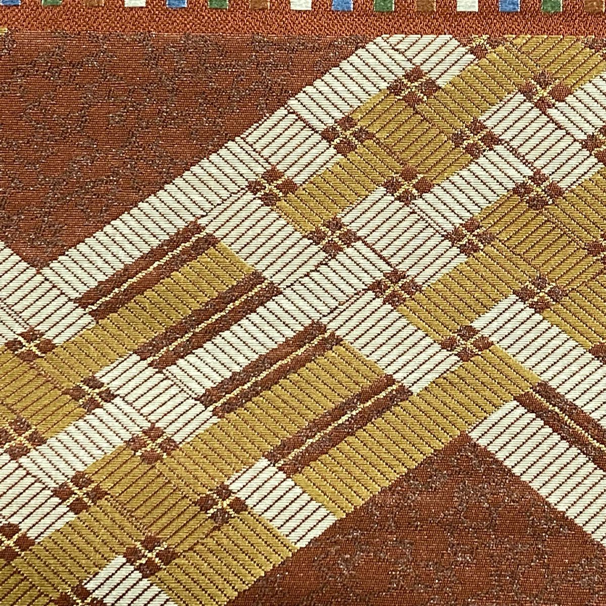【在庫一掃】 袋帯 秀品 落款あり 幾何学 金彩 箔 茶色 お太鼓柄 正絹