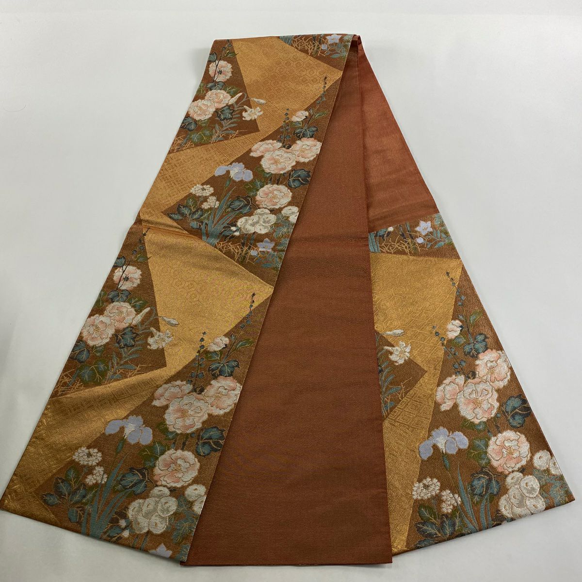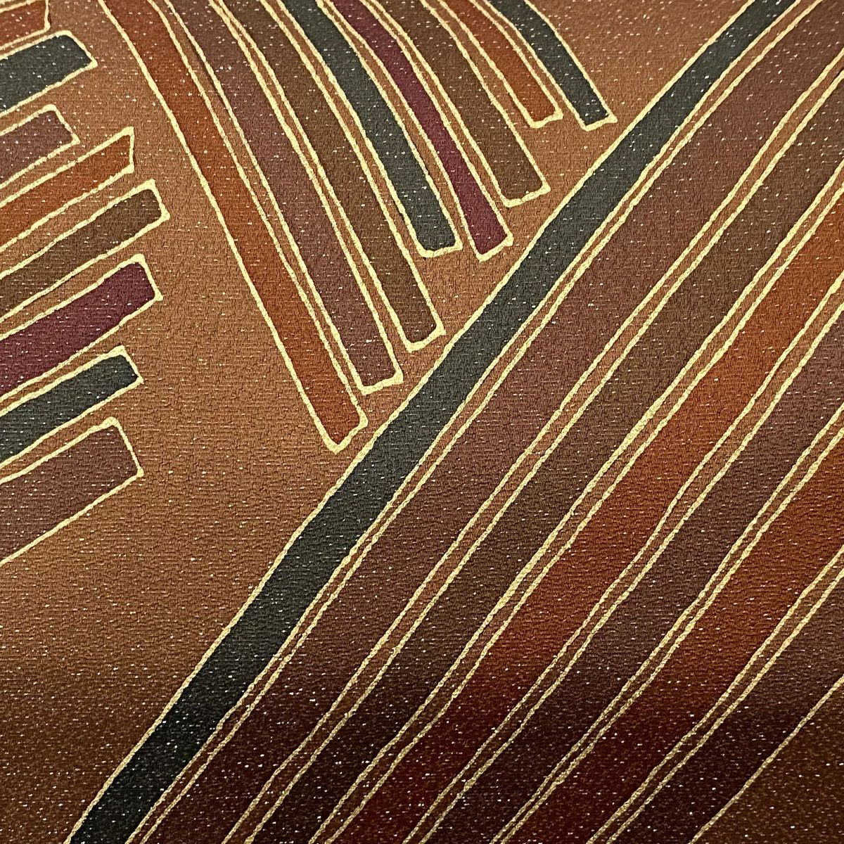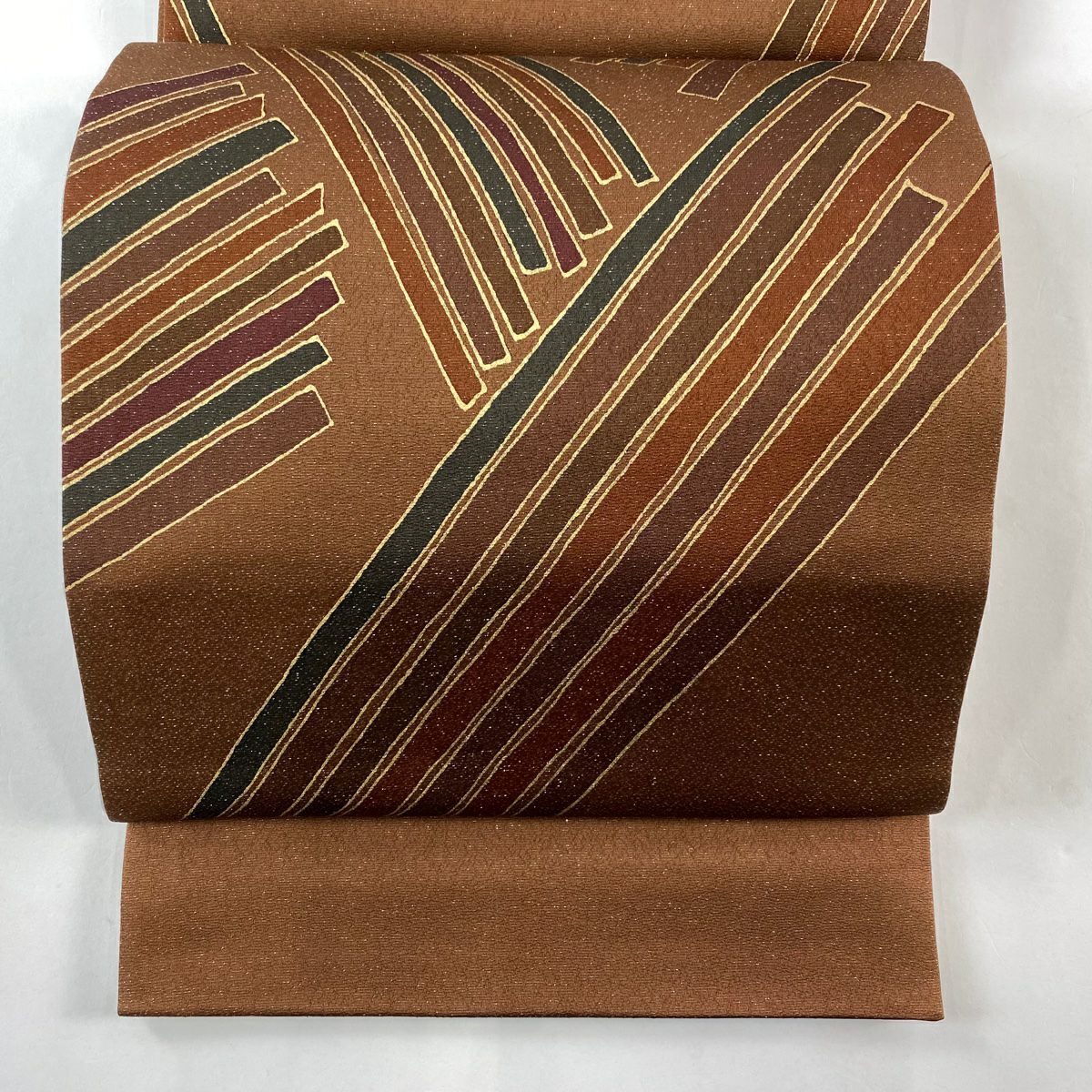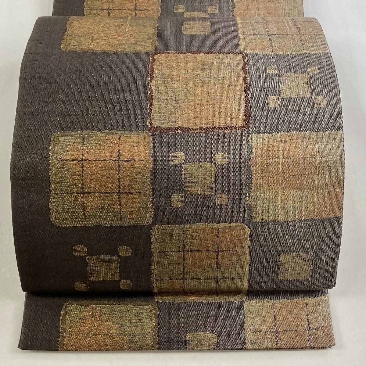【在庫一掃】 袋帯 秀品 落款あり 幾何学 金彩 箔 茶色 お太鼓柄 正絹