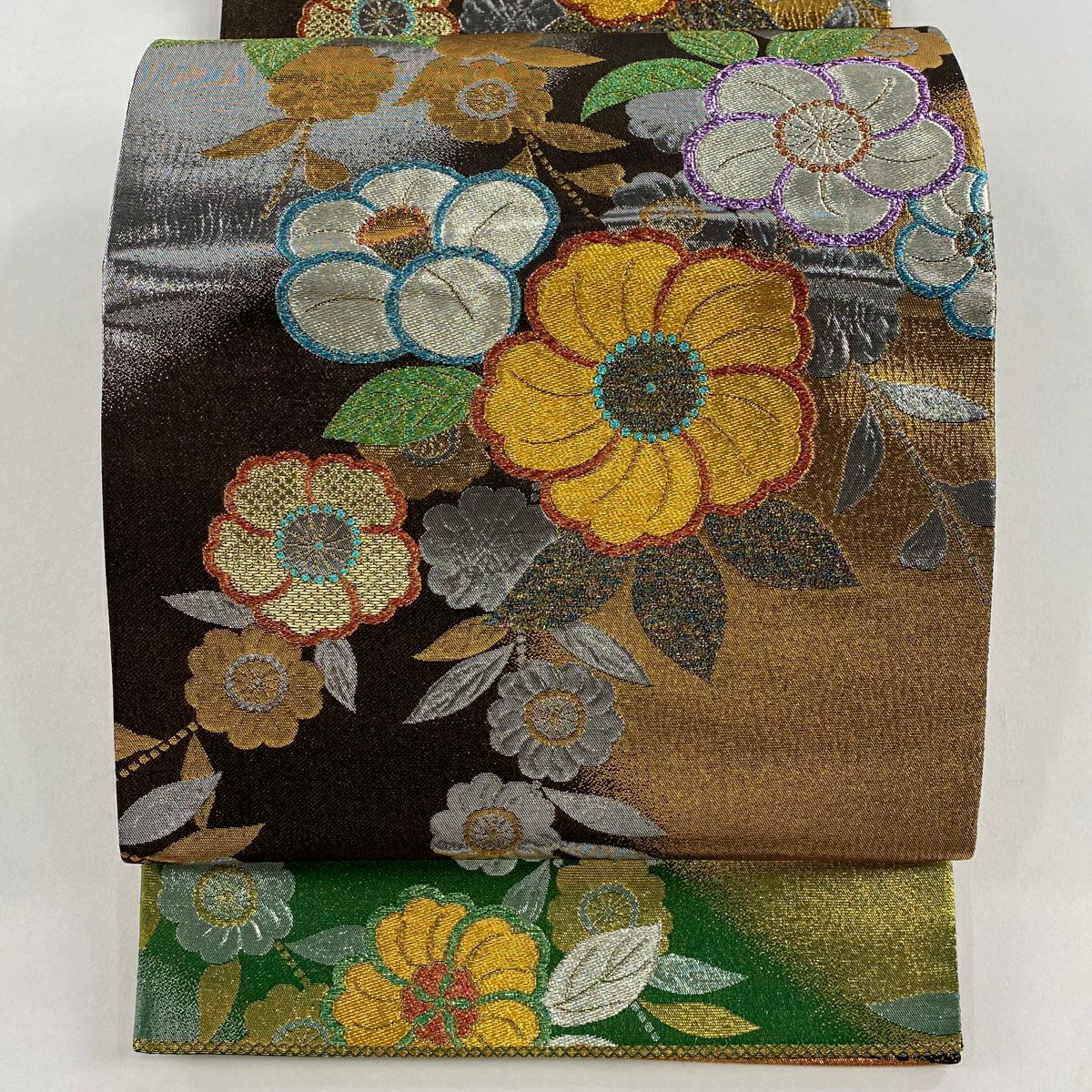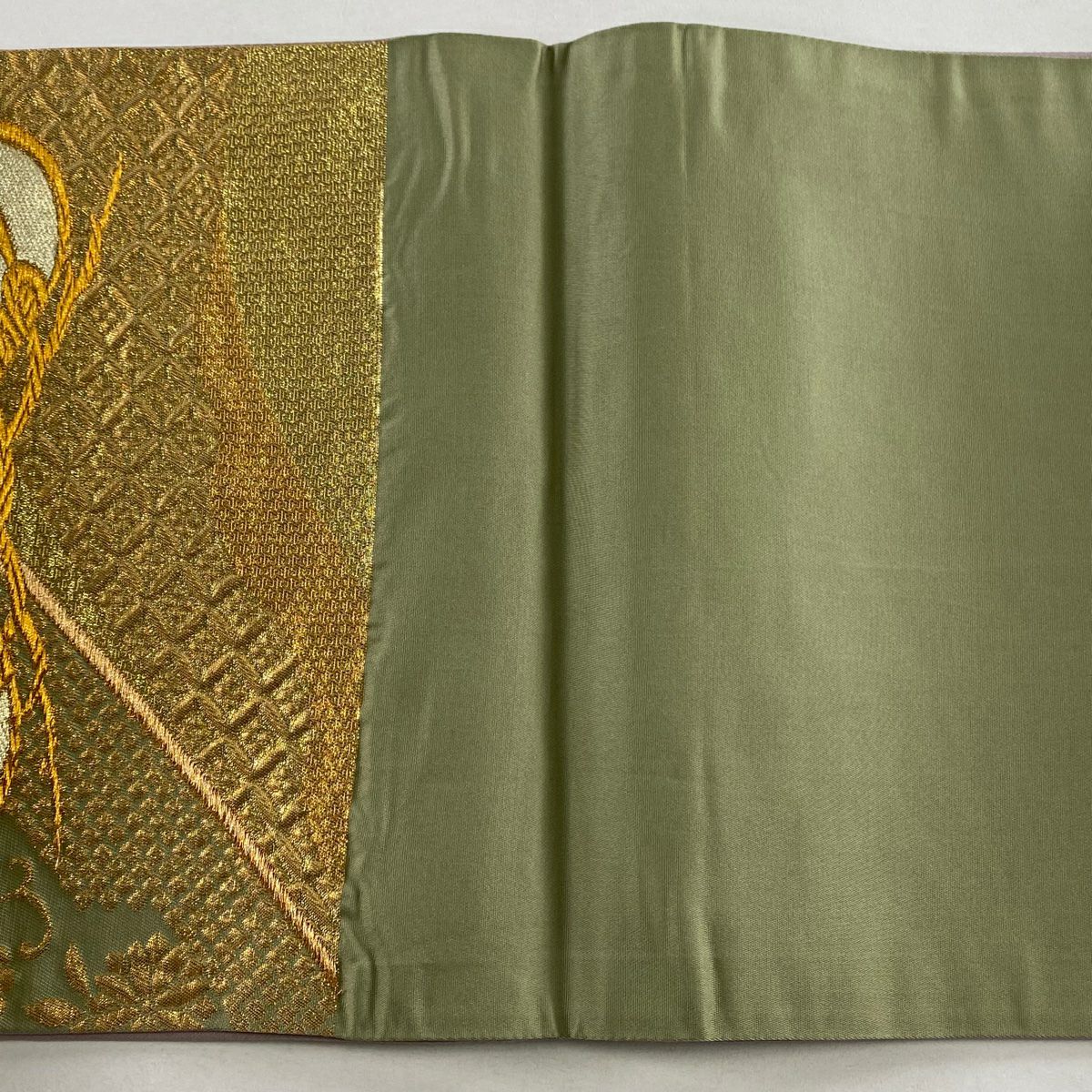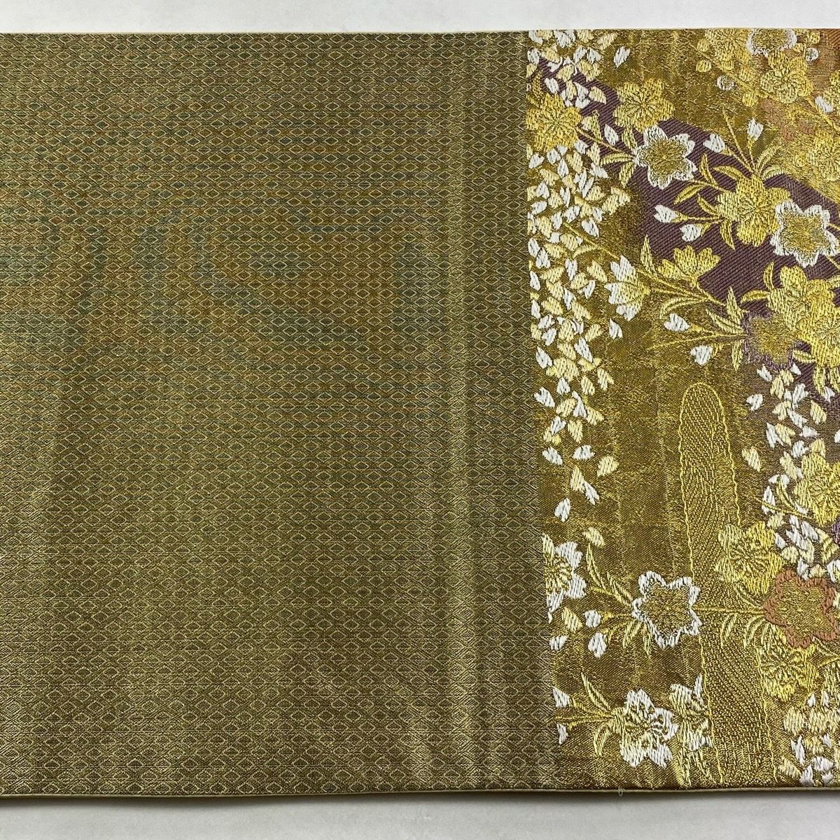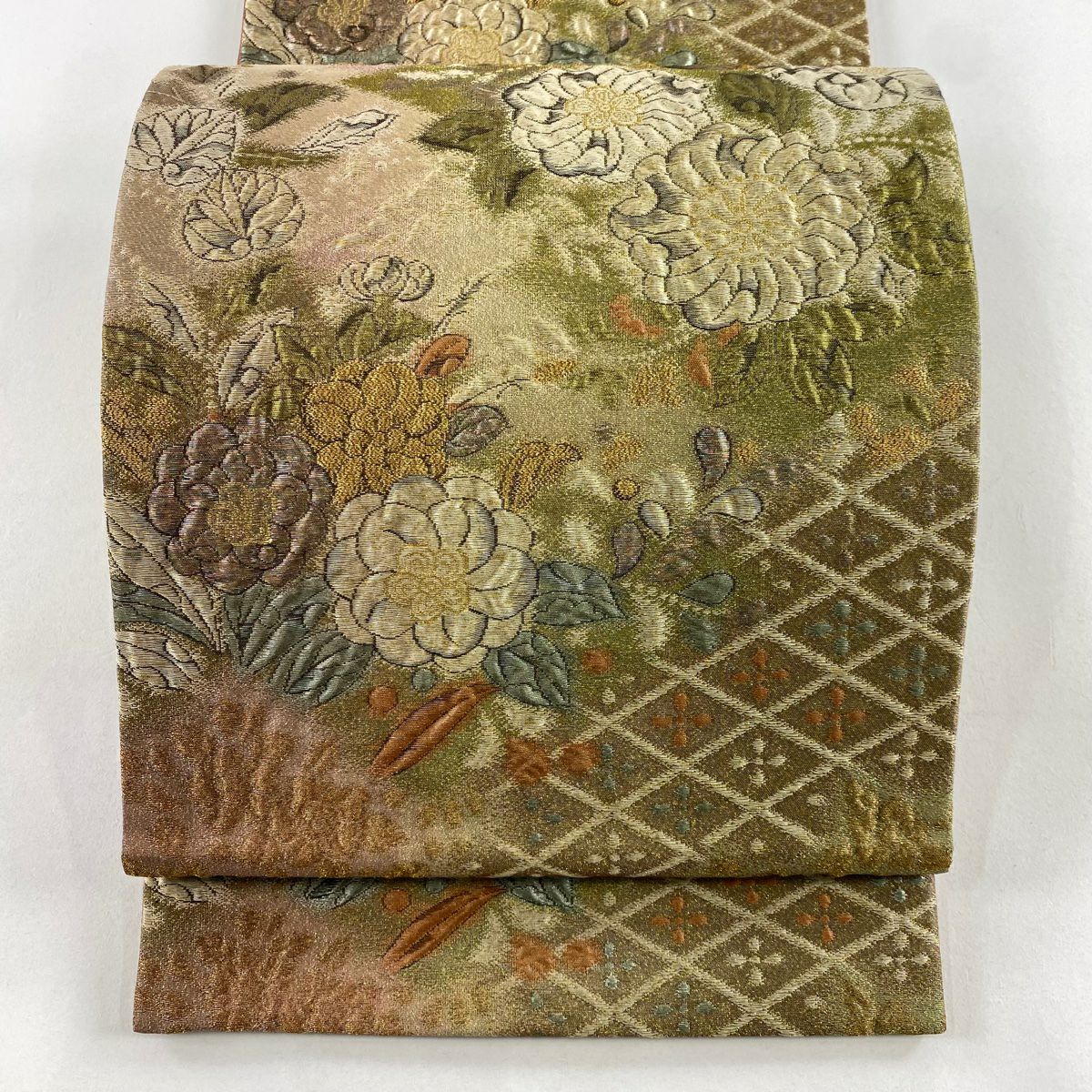 【在庫一掃】 【美品】 袋帯 秀品 草花 花菱 金糸 箔 茶緑色 六通 正絹