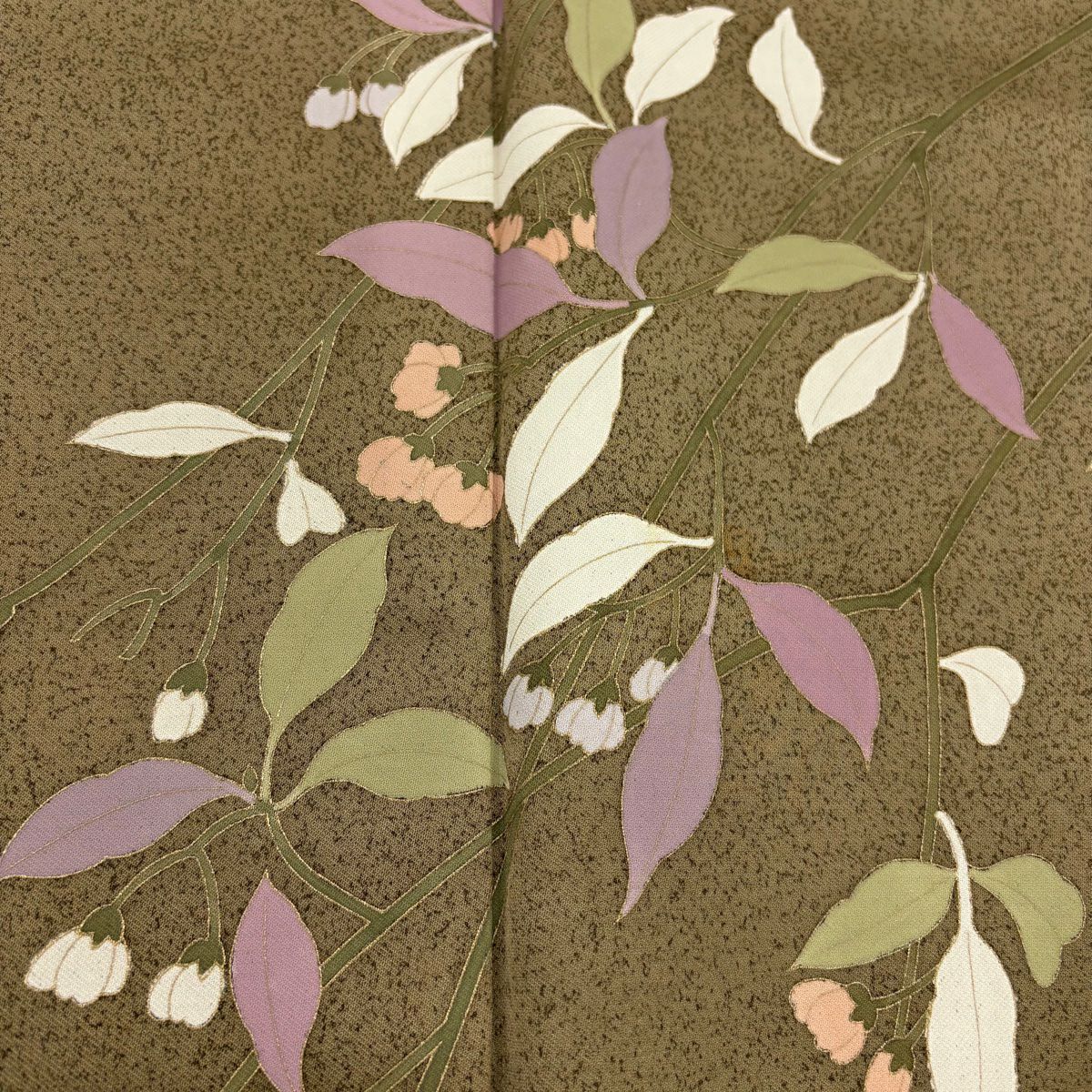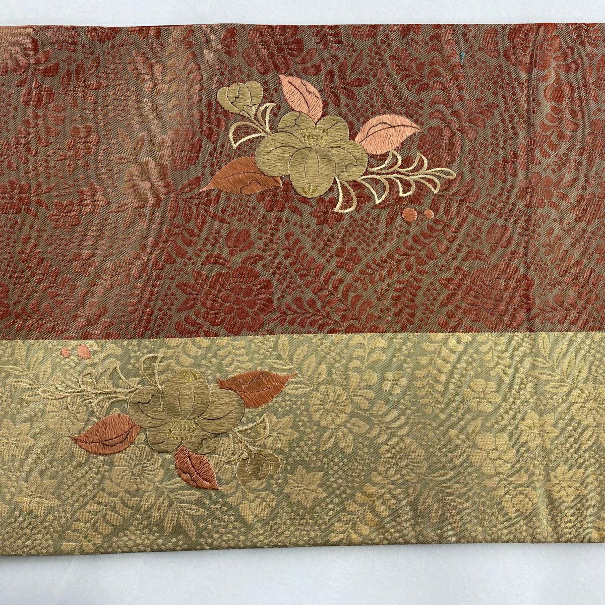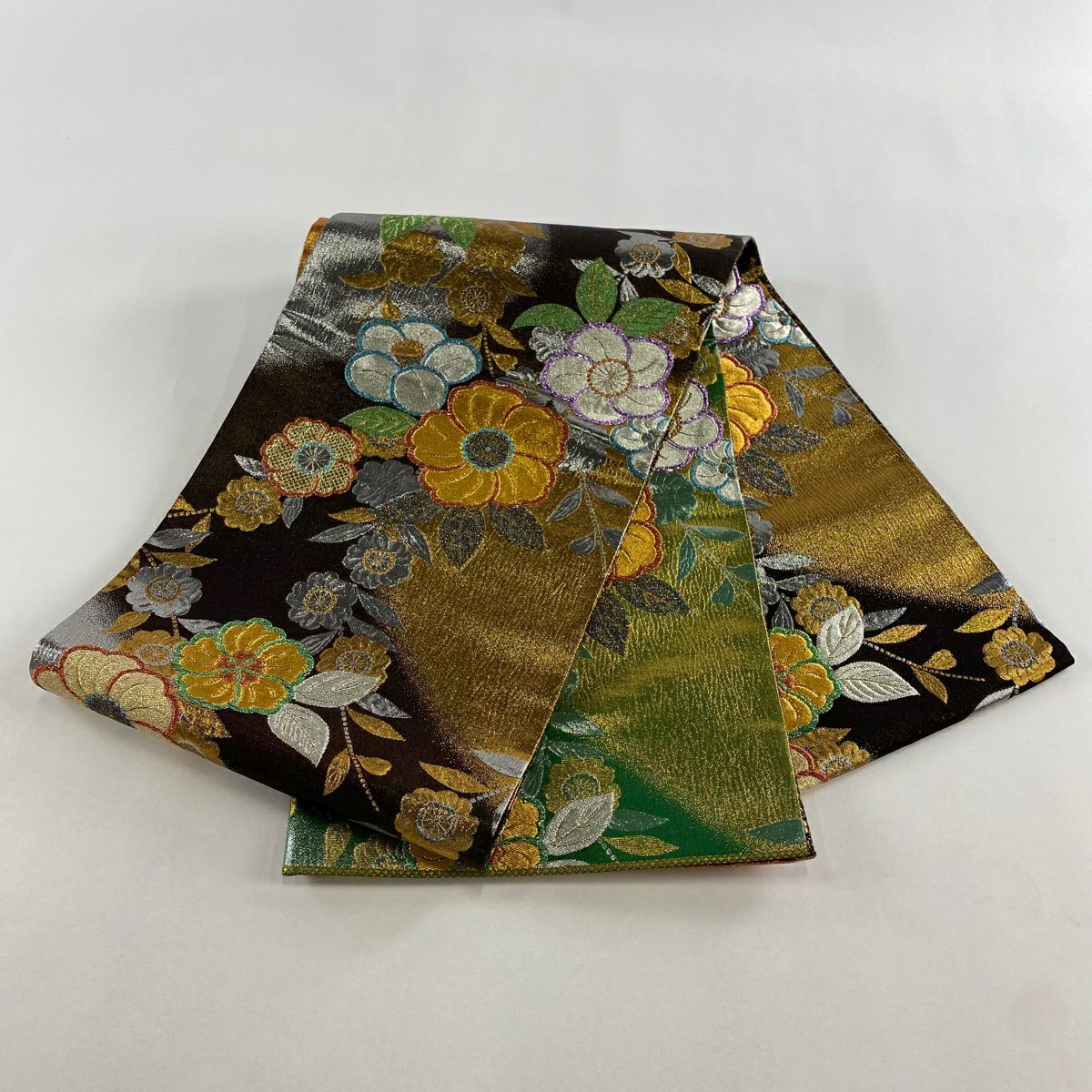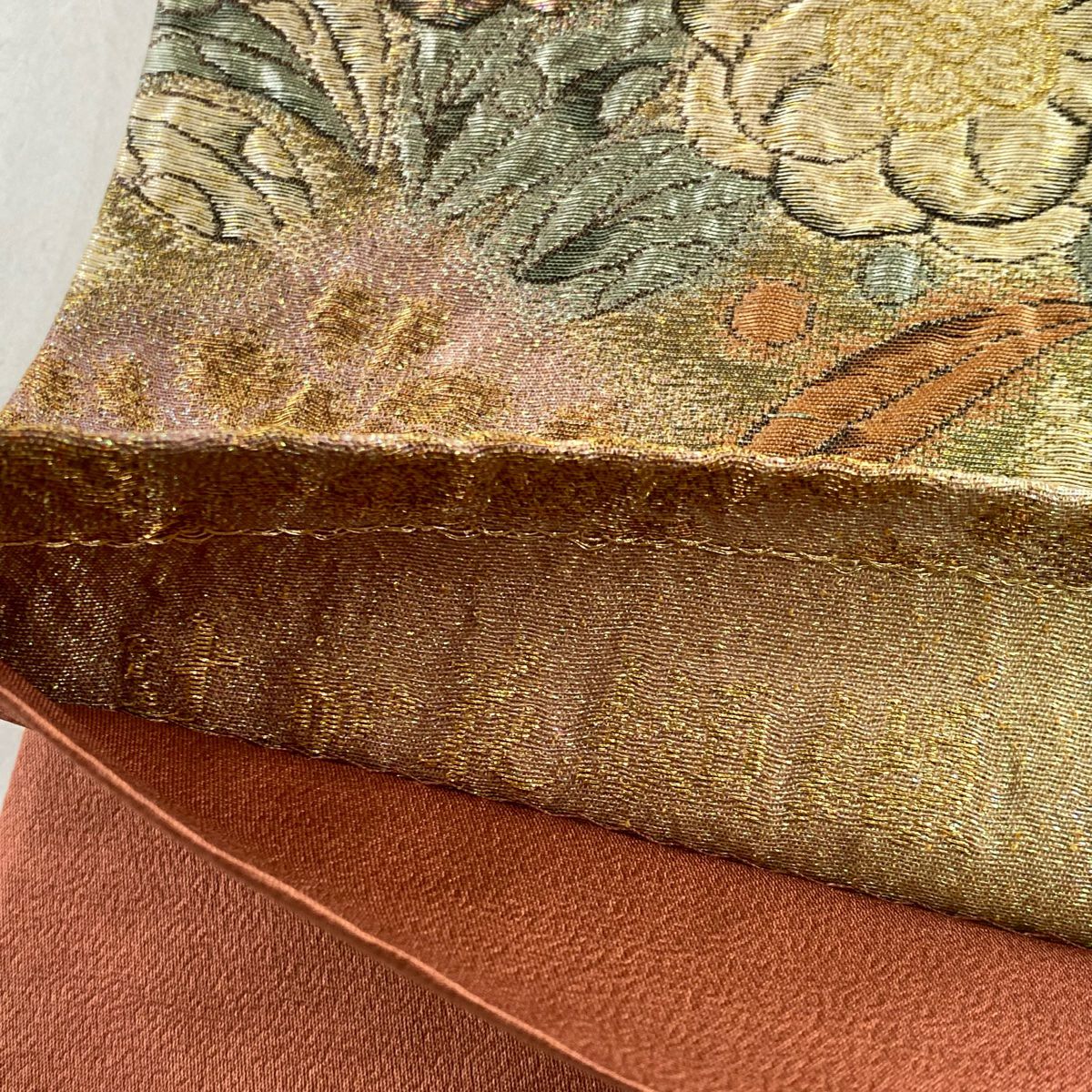 【在庫一掃】 【美品】 袋帯 秀品 草花 花菱 金糸 箔 茶緑色 六通 正絹