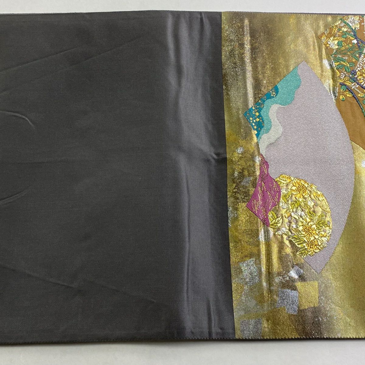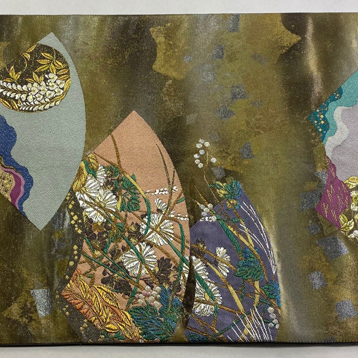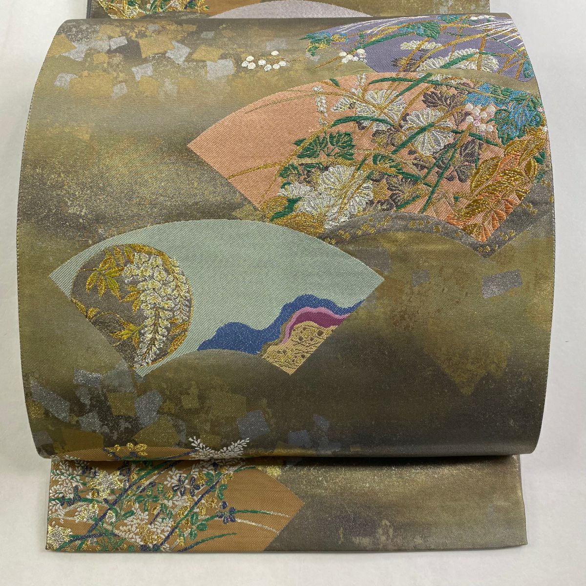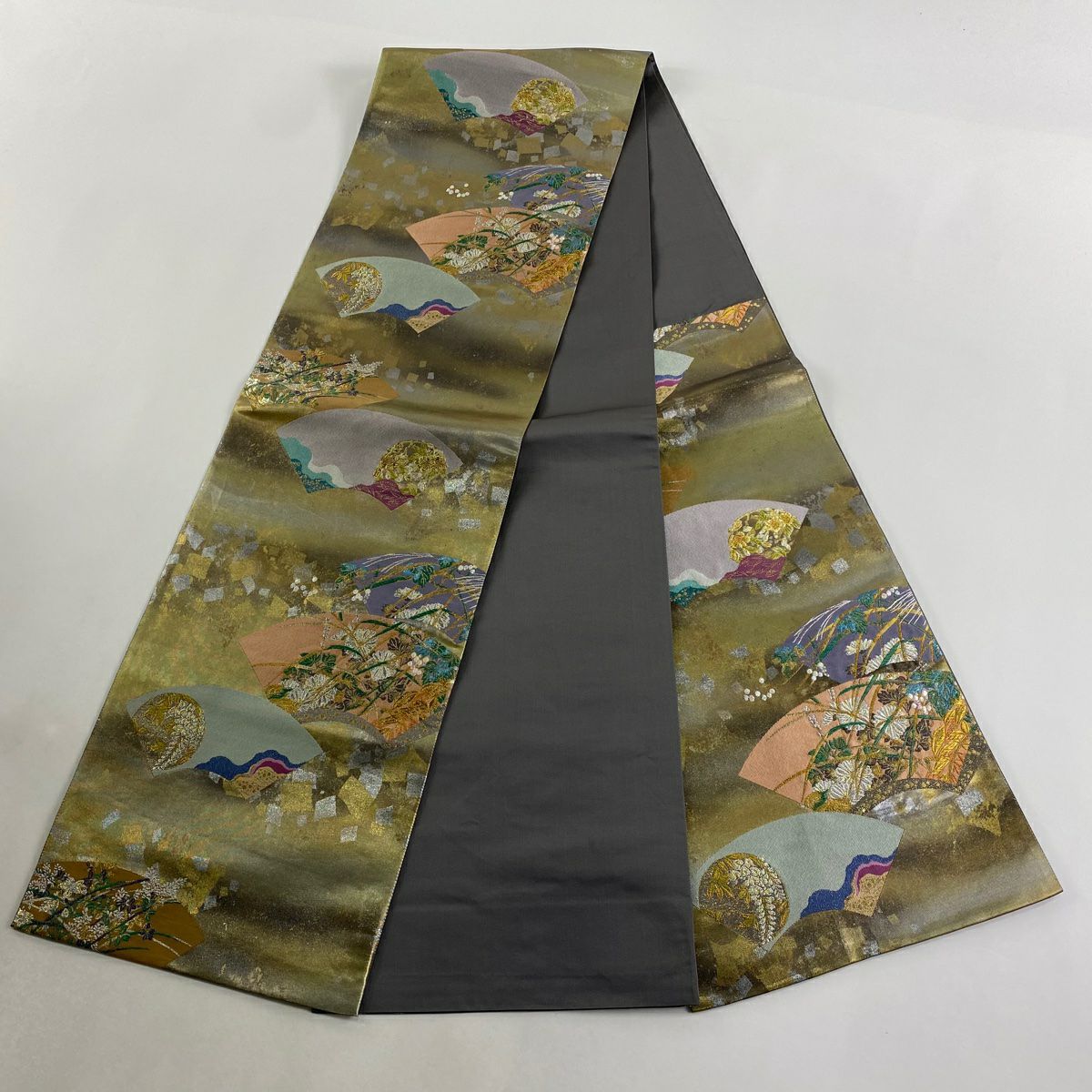 【在庫一掃】 【美品】 袋帯 秀品 扇面 草花 金銀糸 箔 灰茶 六通 正絹