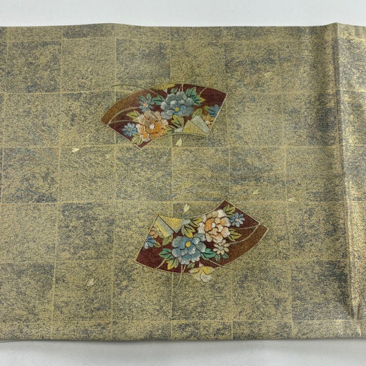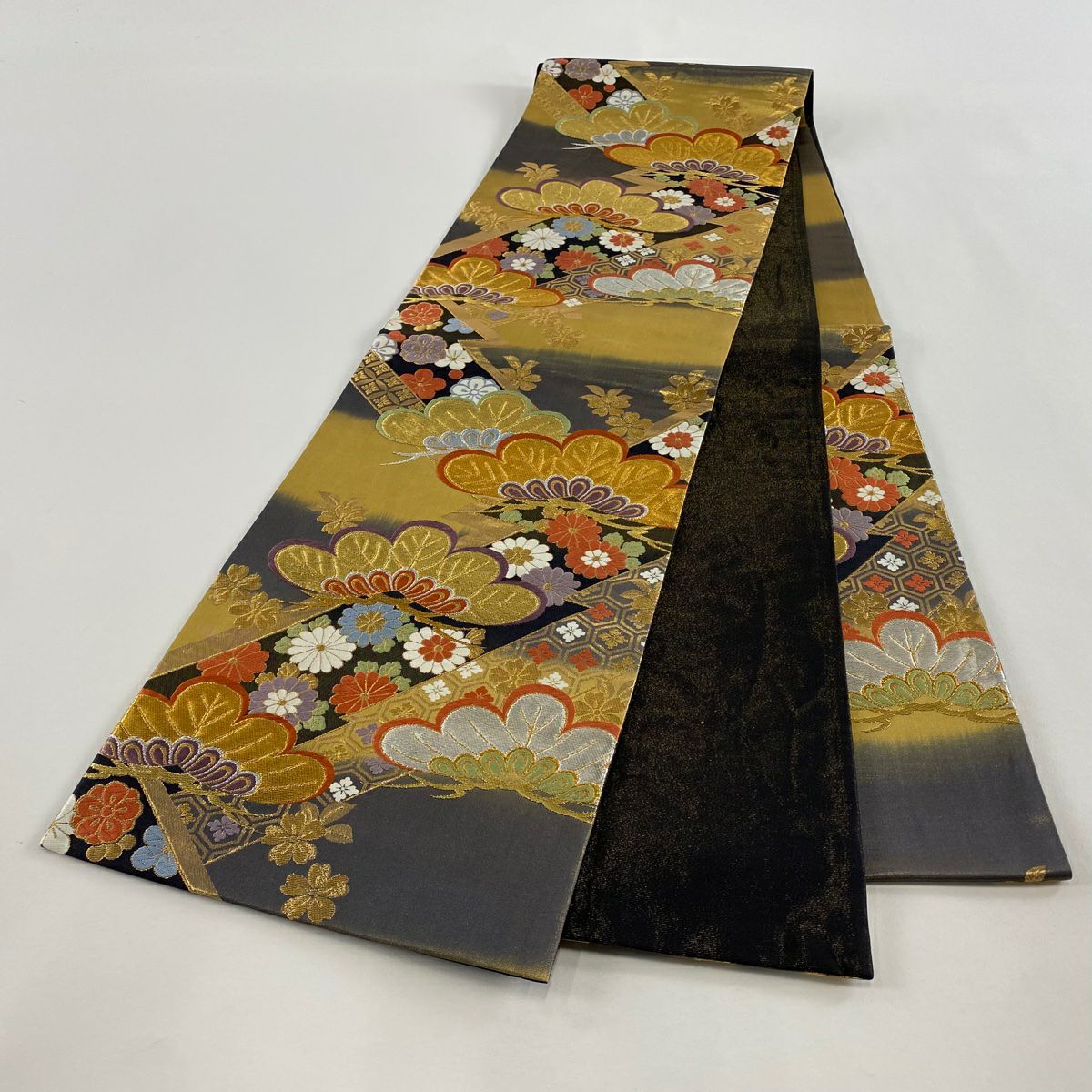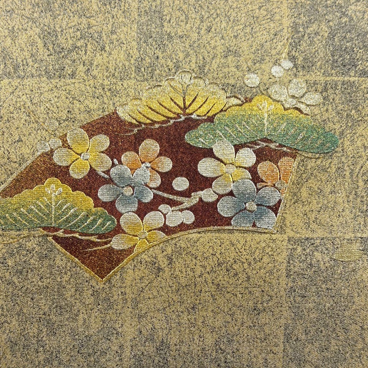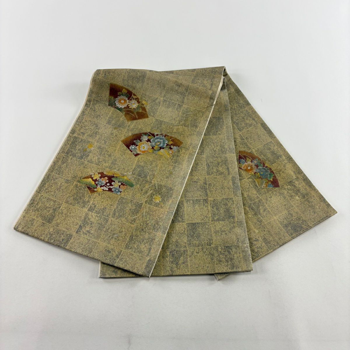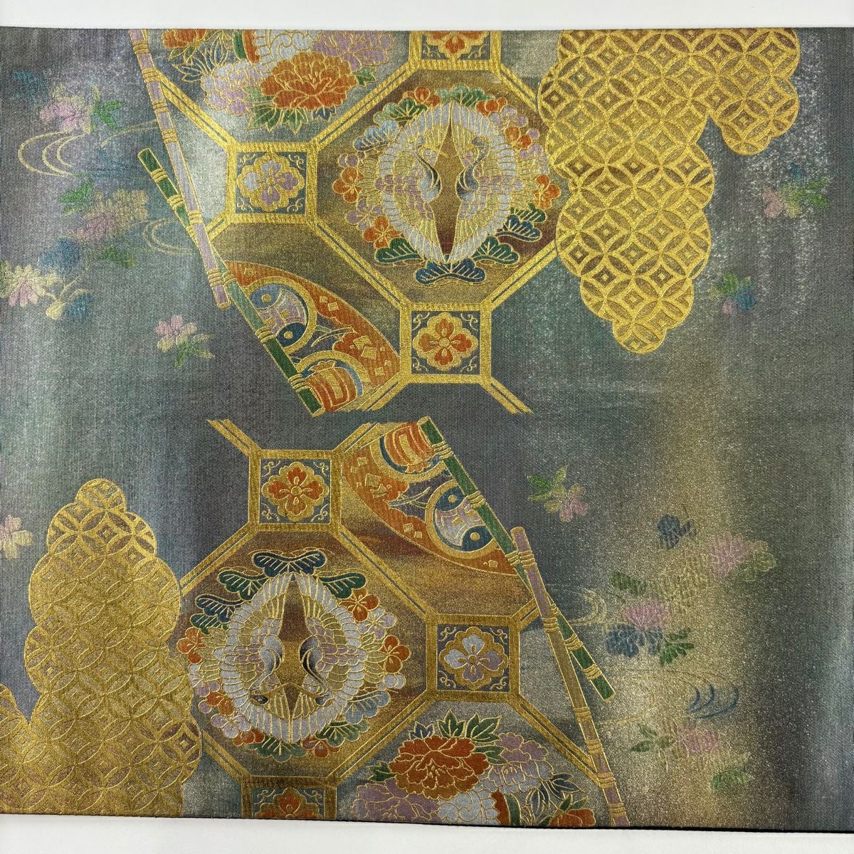 【在庫一掃】 【美品】 袋帯 秀品 扇面 草花 金銀糸 箔 灰茶 六通 正絹