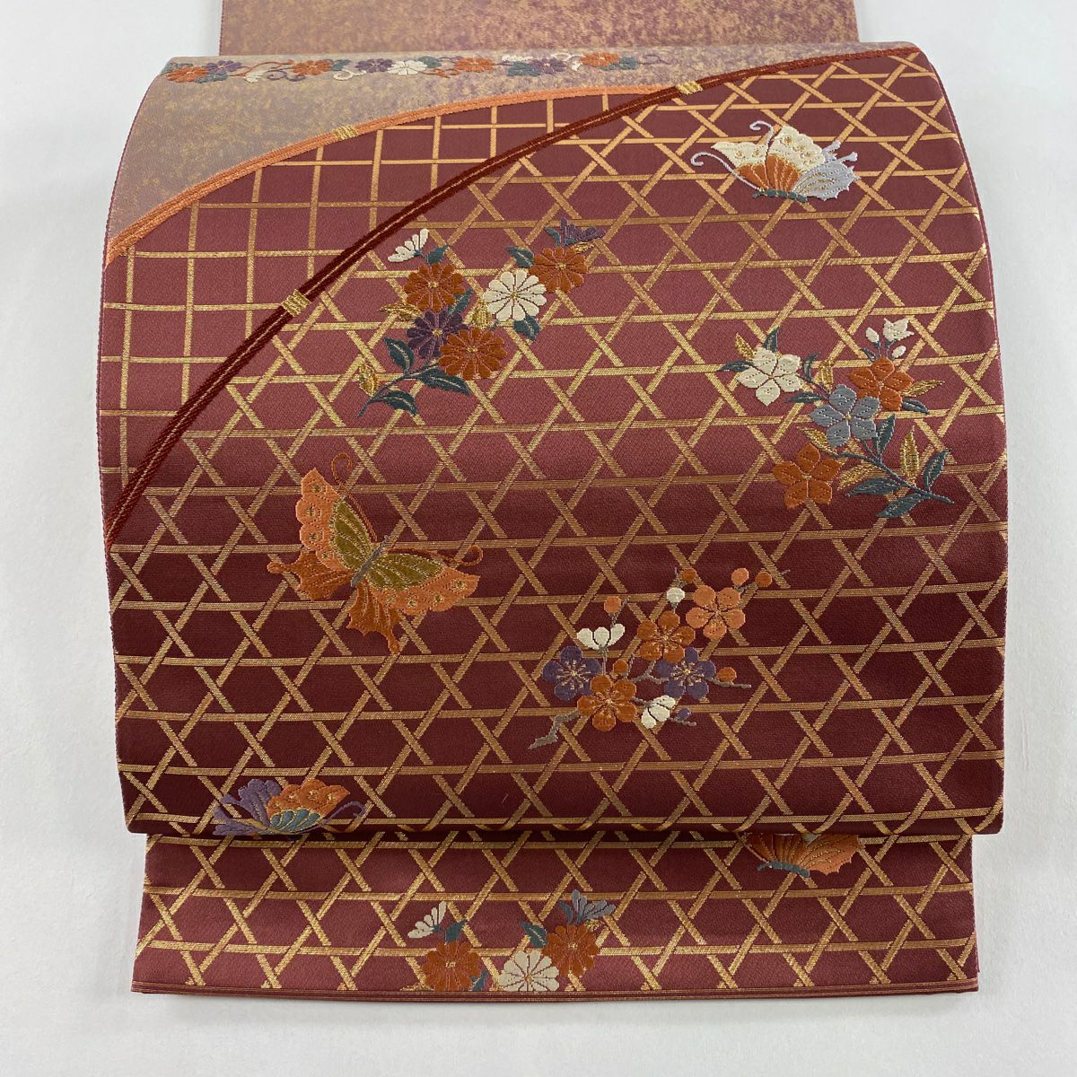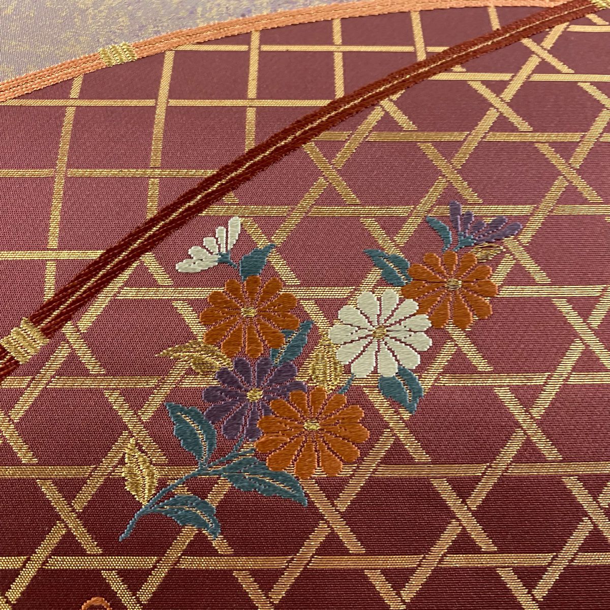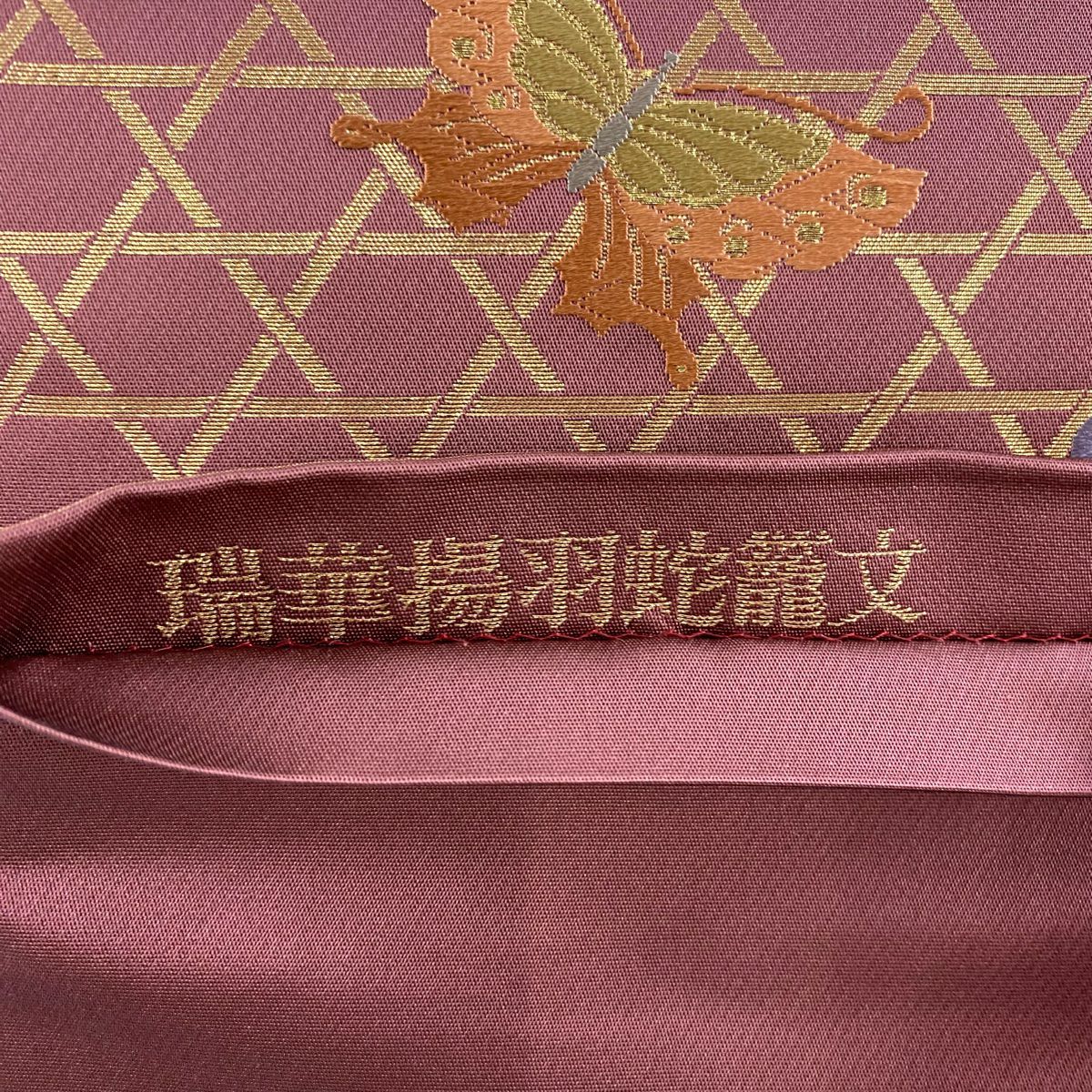 【在庫一掃】 【美品】 袋帯 秀品 蝶 籠目 刺繍 箔 えんじ色 六通 正絹
