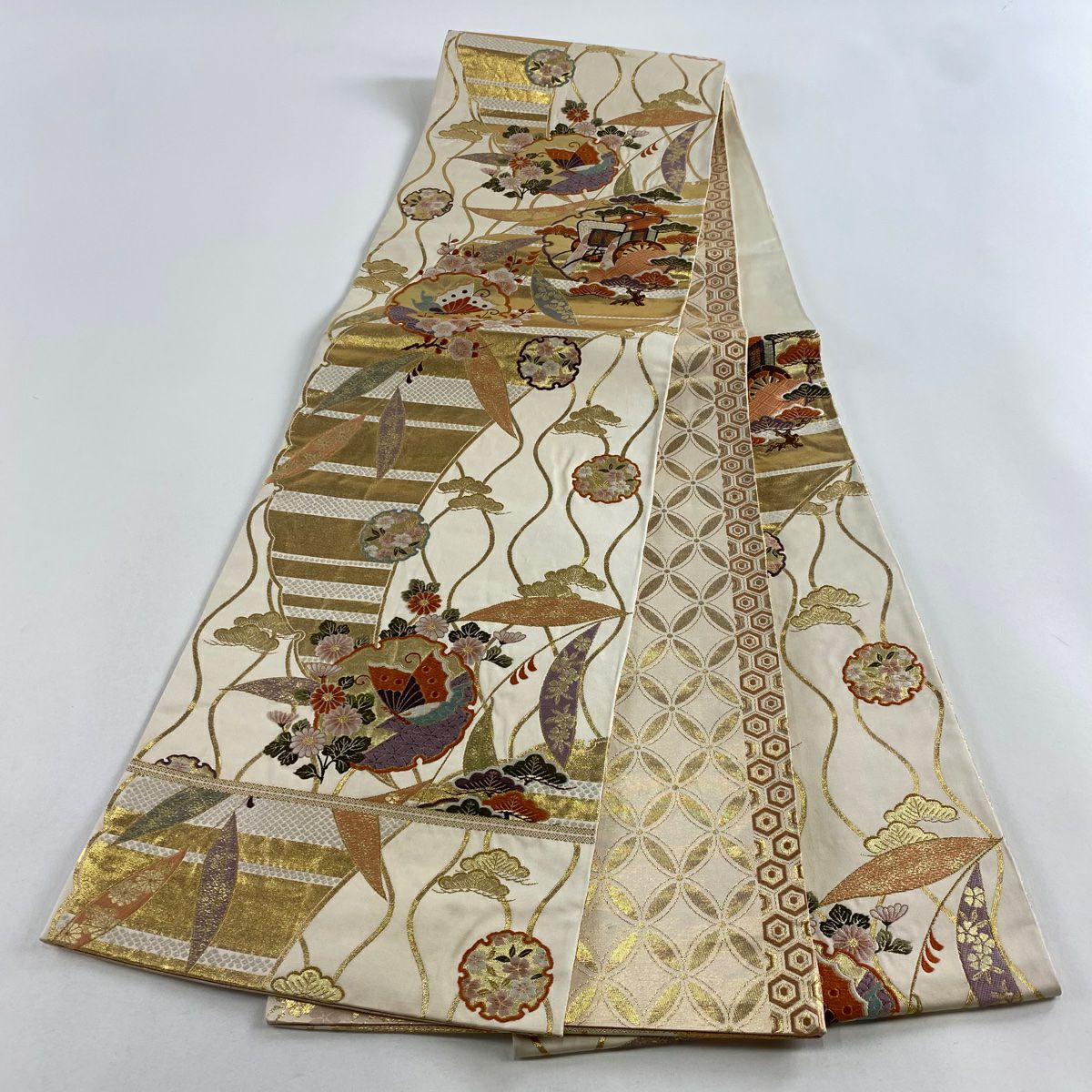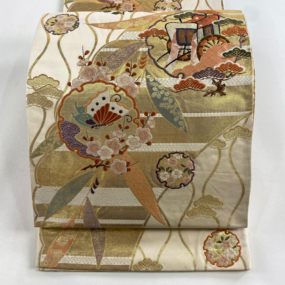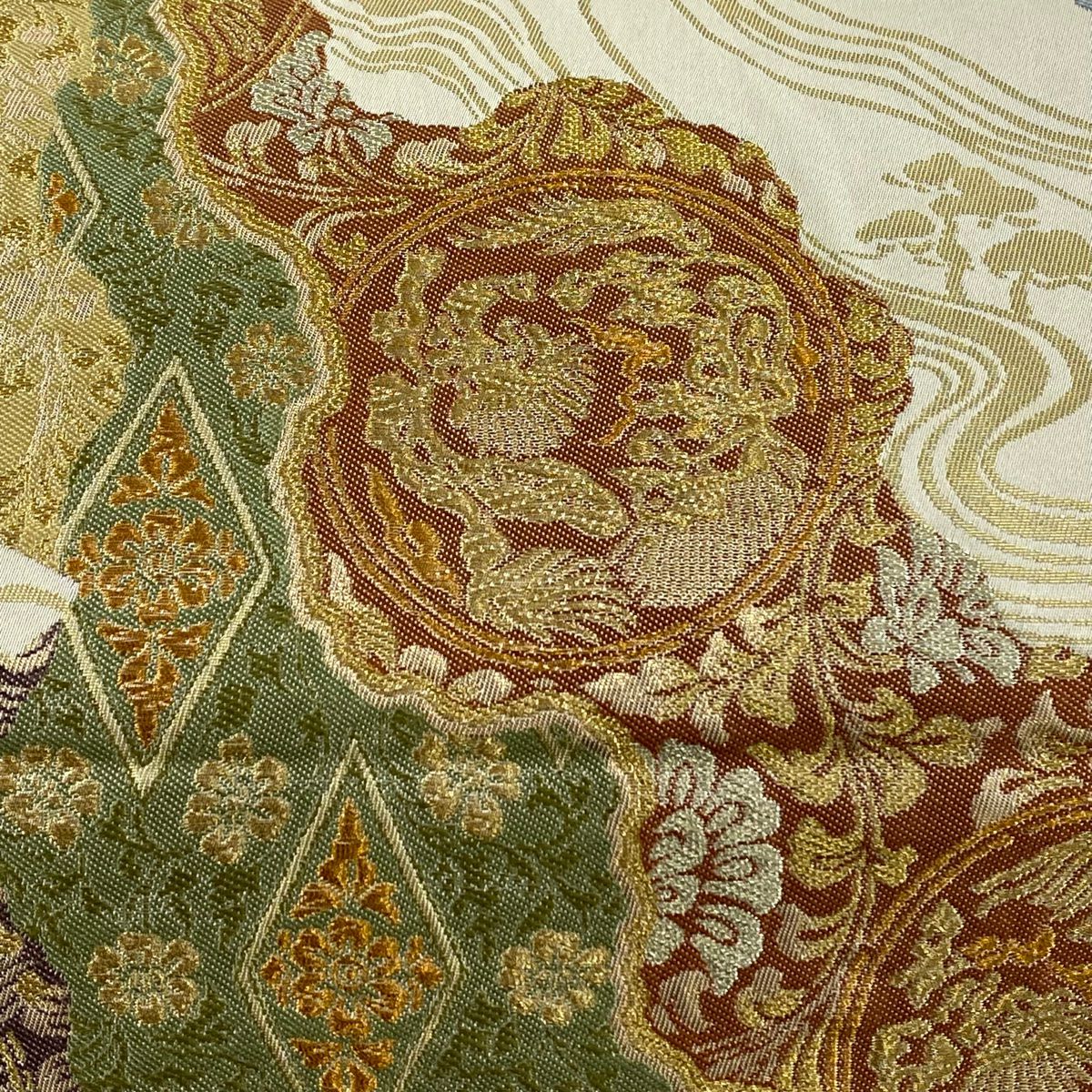 【在庫一掃】 袋帯 秀品 雪輪 松竹梅 箔 金糸 ベージュ 六通 正絹