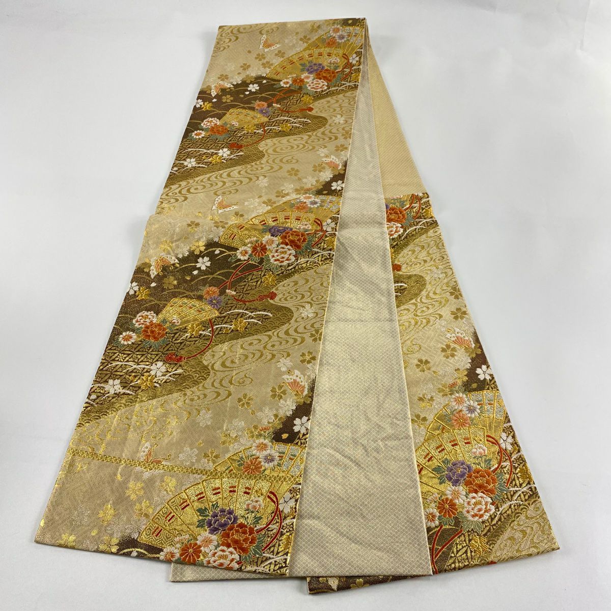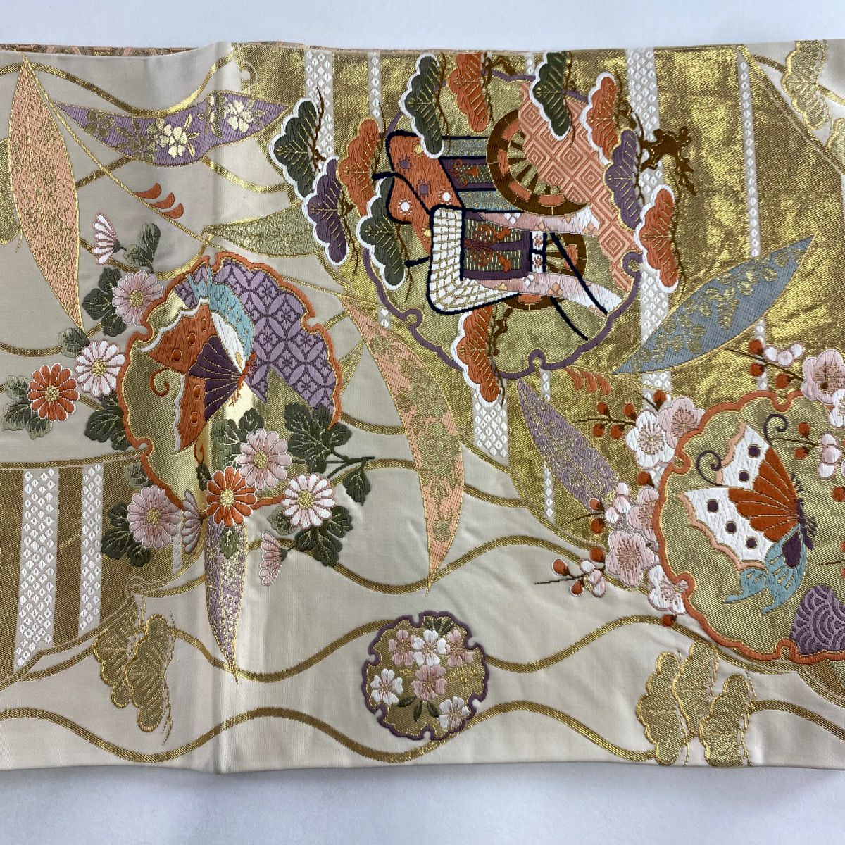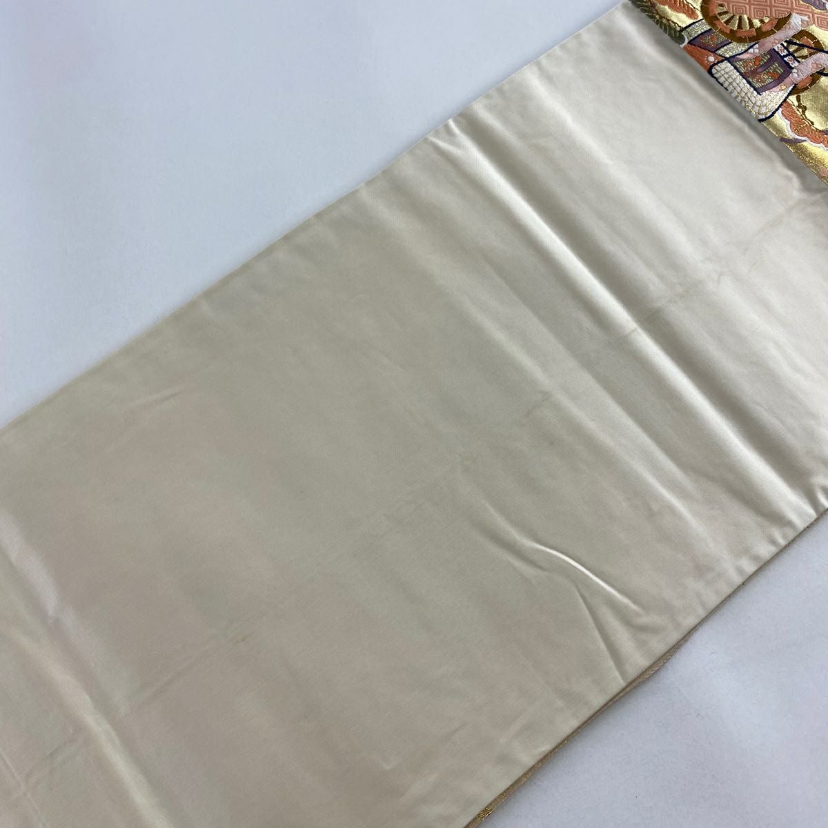 【在庫一掃】 袋帯 秀品 檜扇 花蝶 金糸 刺繍 ベージュ 六通 正絹