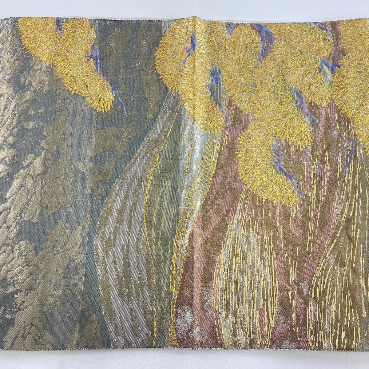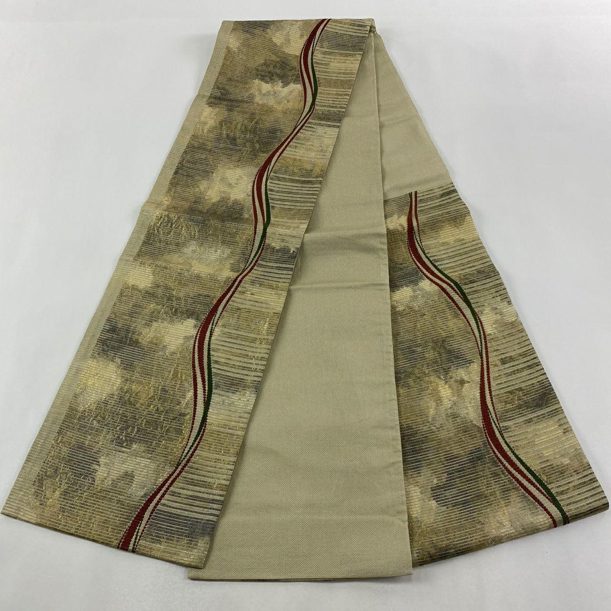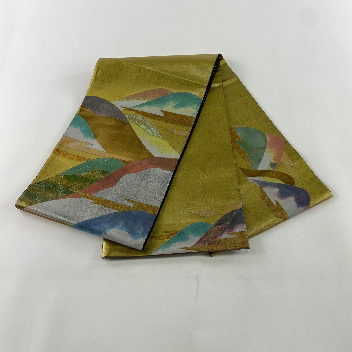 【在庫一掃】 【美品】 袋帯 秀品 山並み 霞 箔 金彩 金色 お太鼓柄 正絹