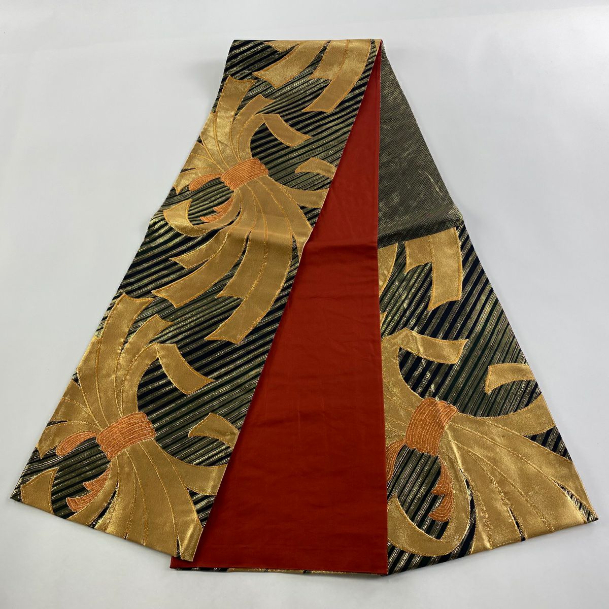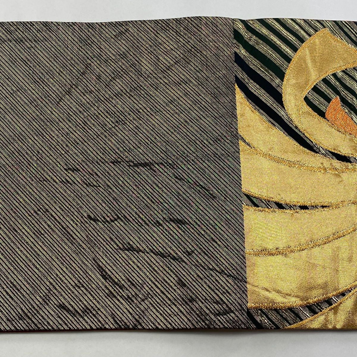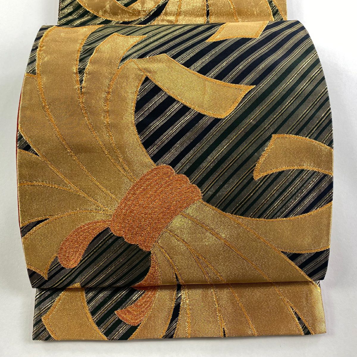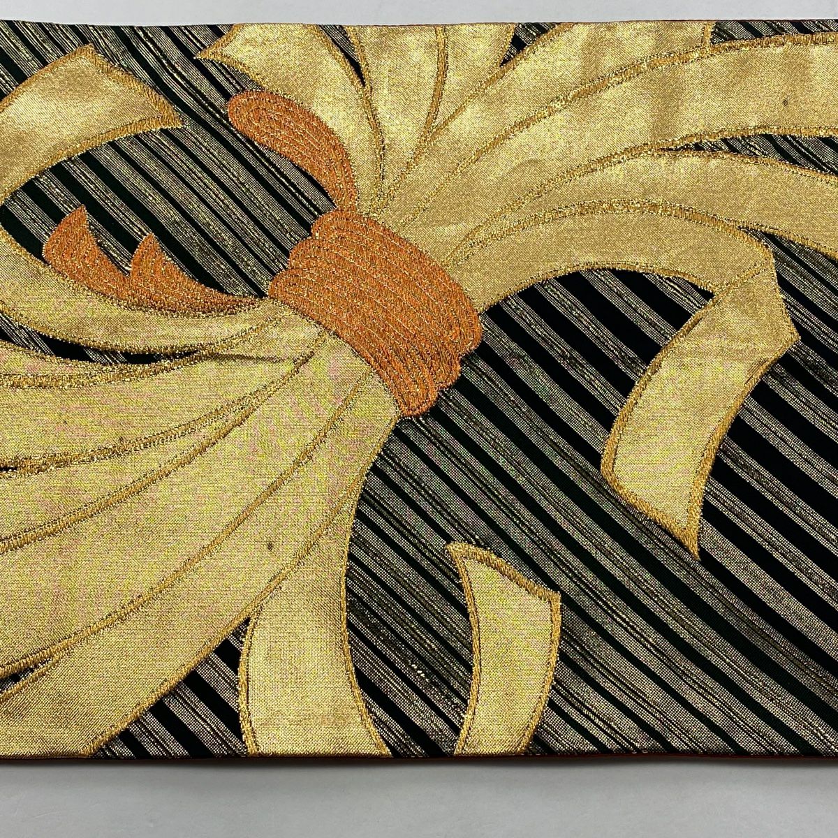 【在庫一掃】 【美品】 袋帯 秀品 束ね熨斗 斜縞 金糸 箔 黒 六通 正絹