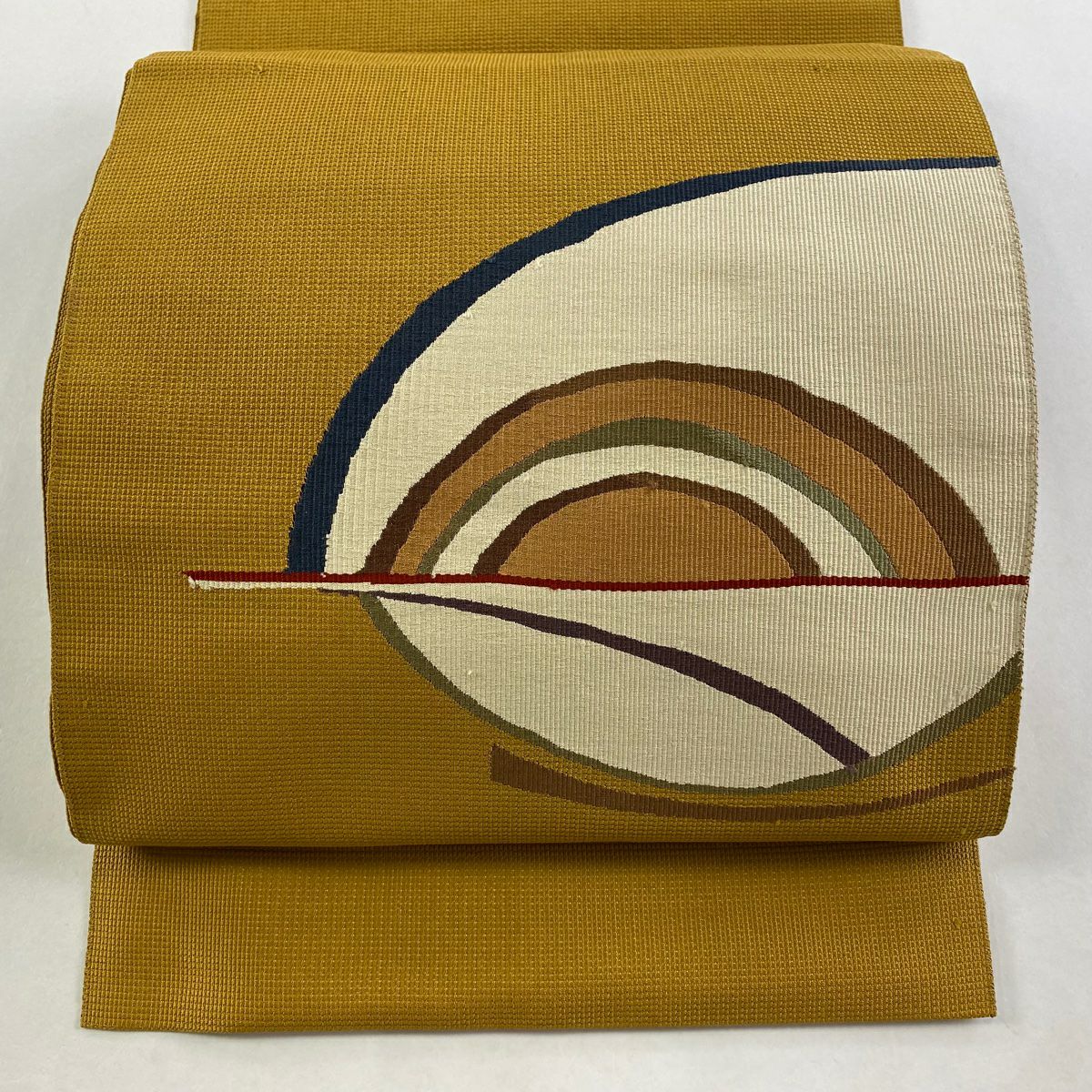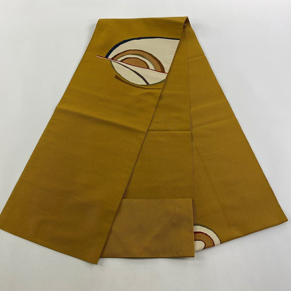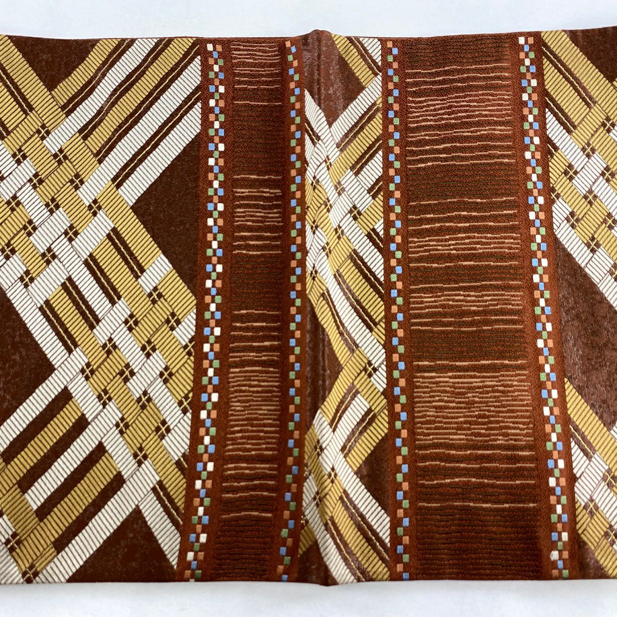 【在庫一掃】 名古屋帯 秀品 八寸名古屋帯 松葉仕立て 幾何学模様 黄土色 正絹