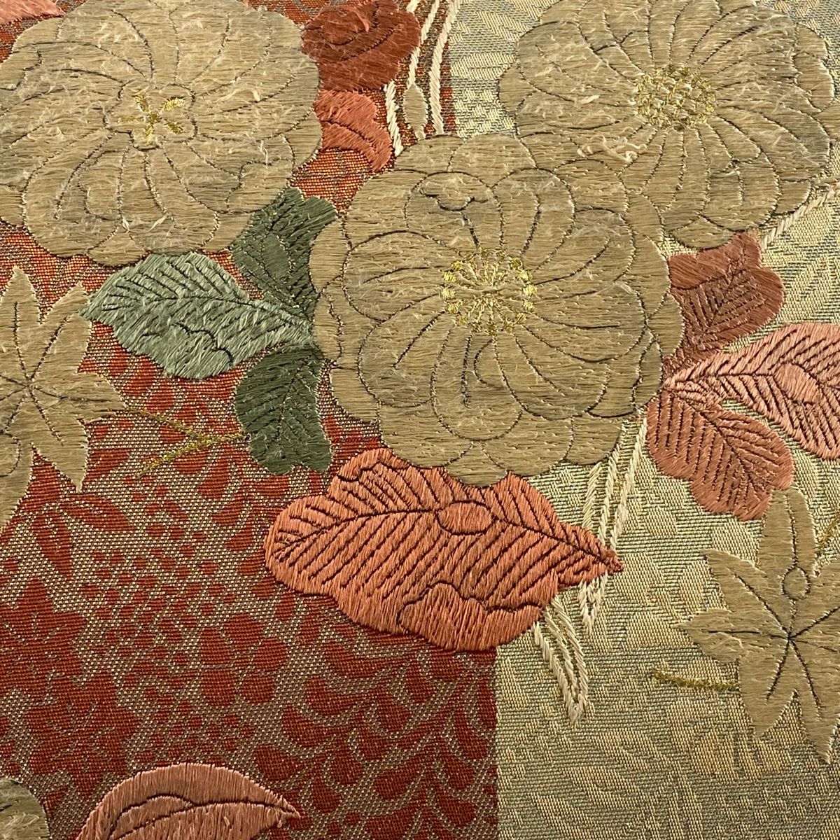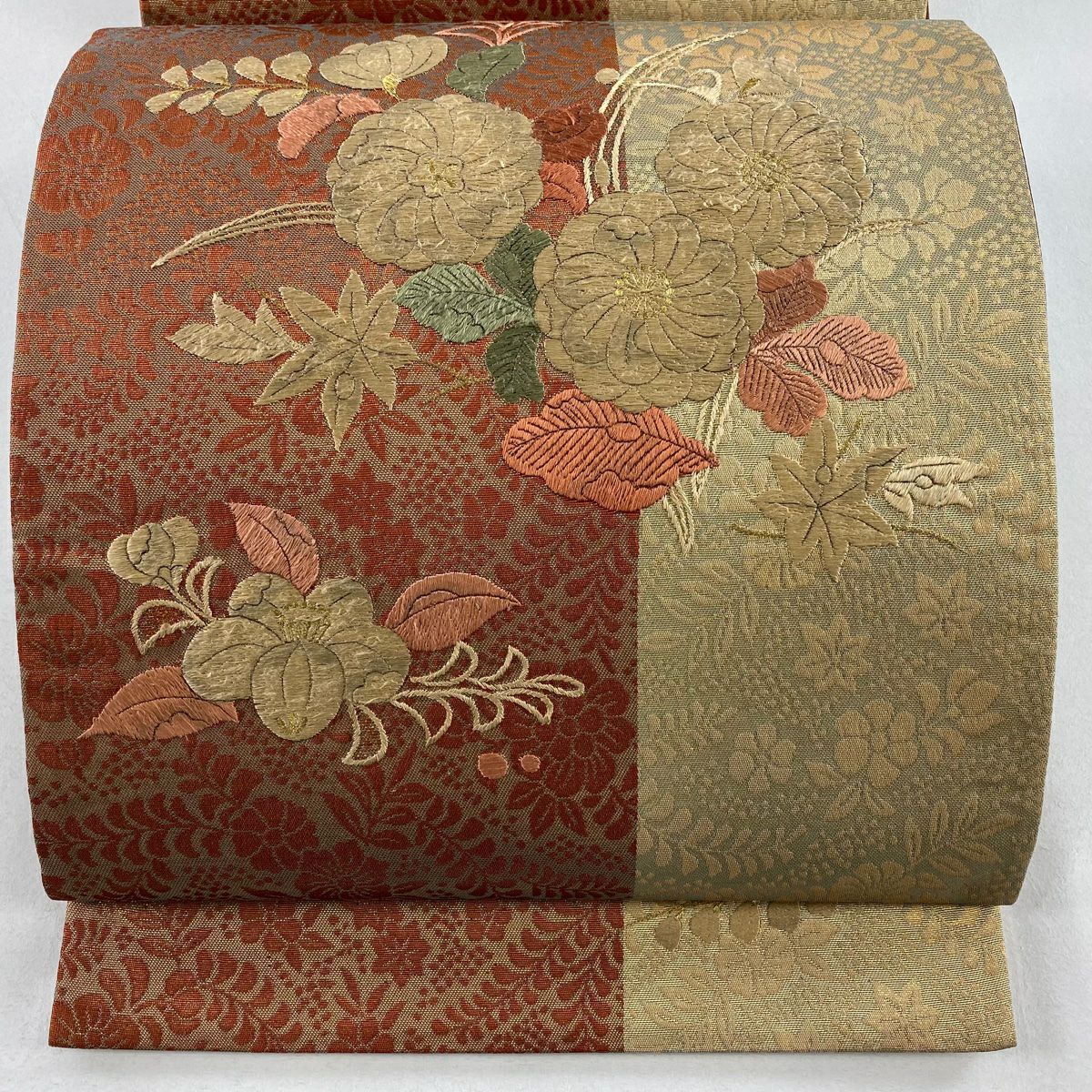 【在庫一掃】 袋帯 秀品 草花 椿 箔 刺繍 ベージュ お太鼓柄 正絹