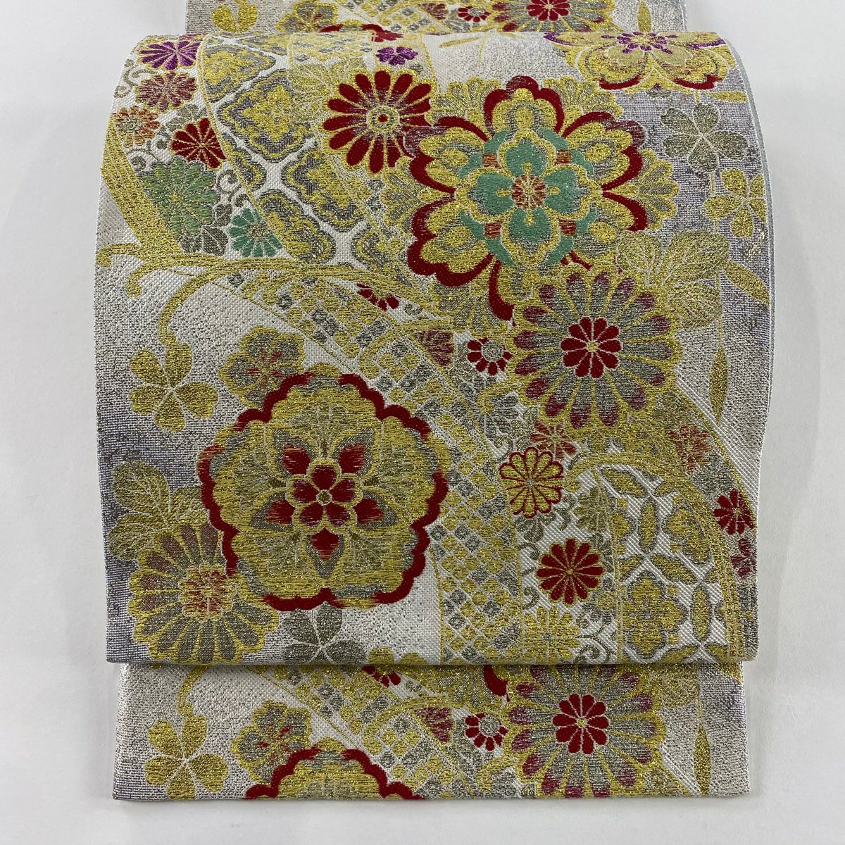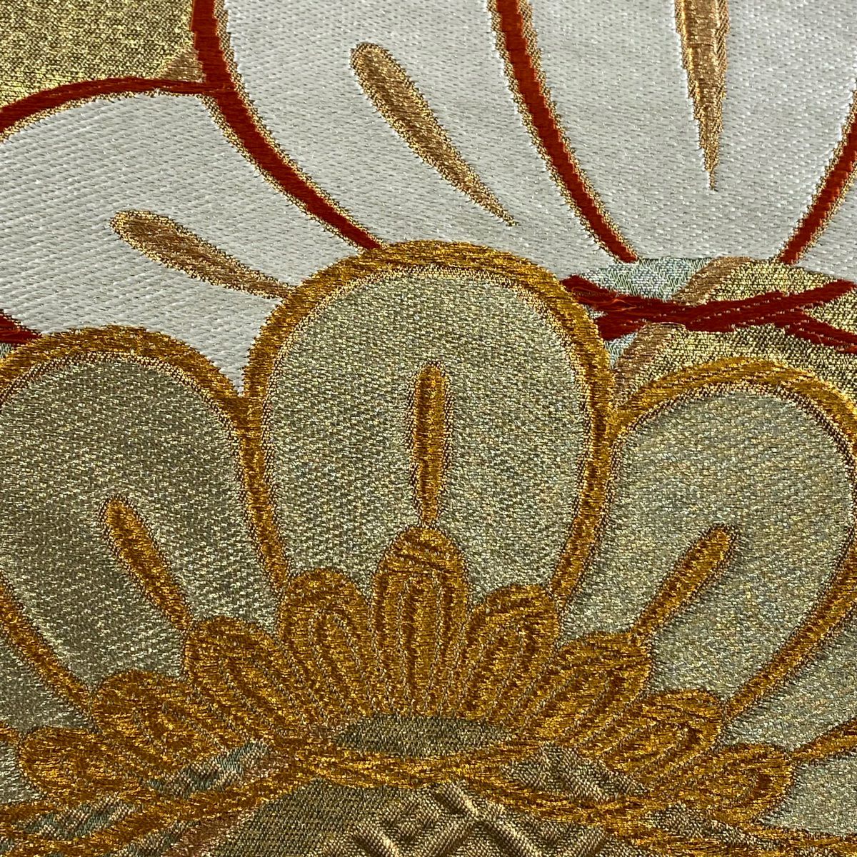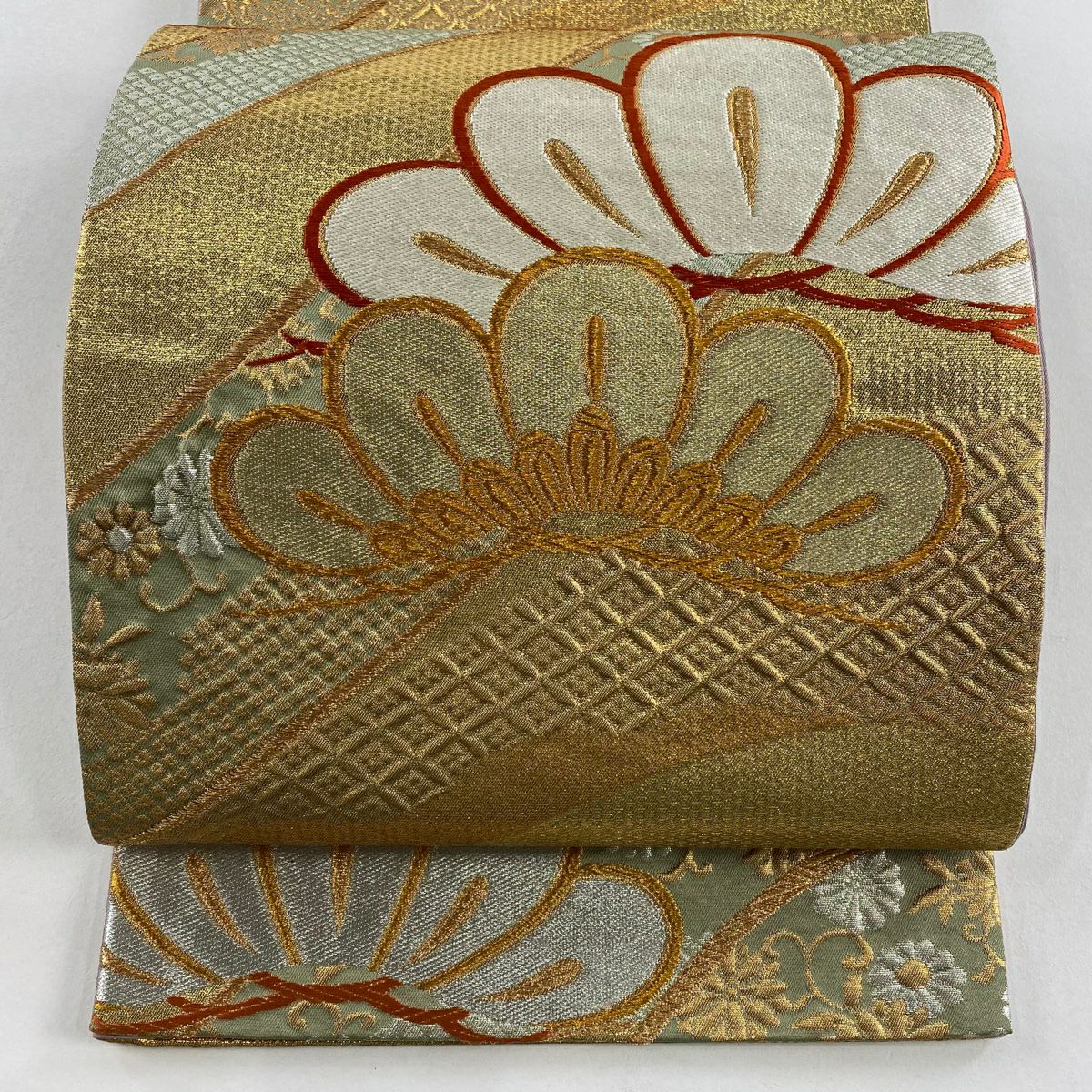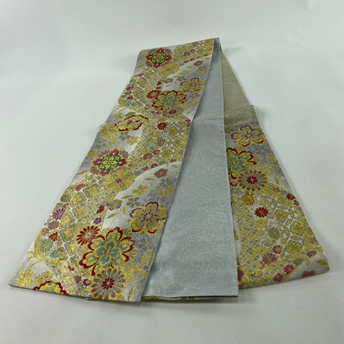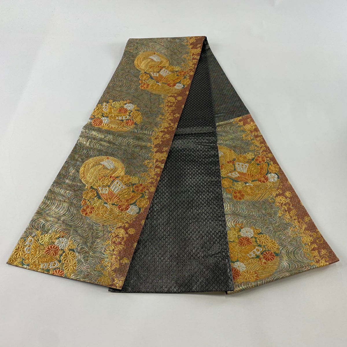 【在庫一掃】 袋帯 秀品 古典錦 笠松 菊 刺繍 金銀糸 灰色 六通 正絹