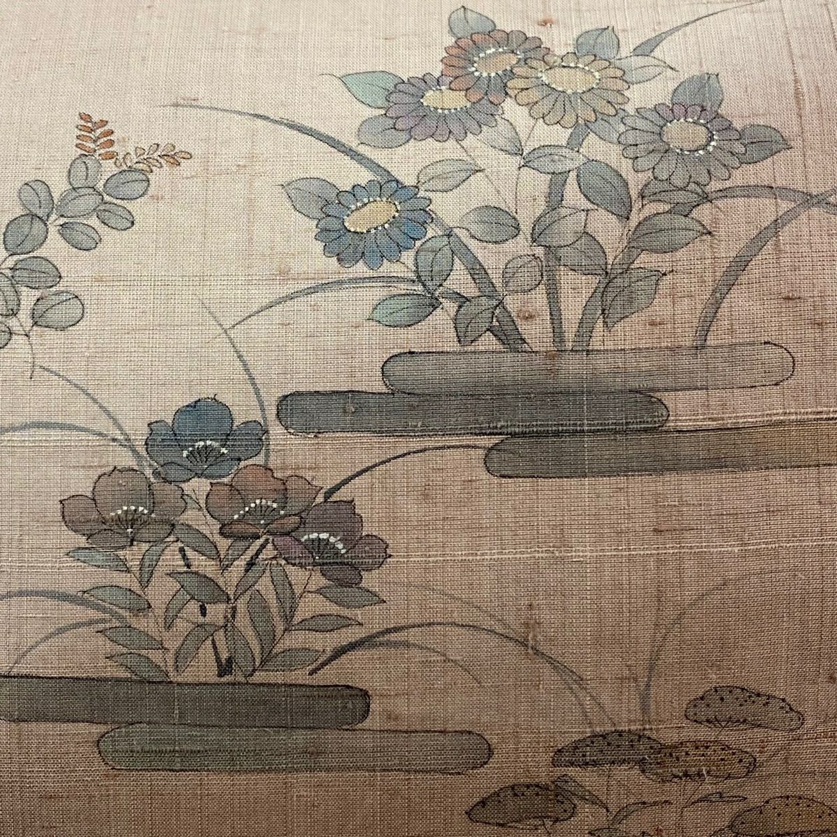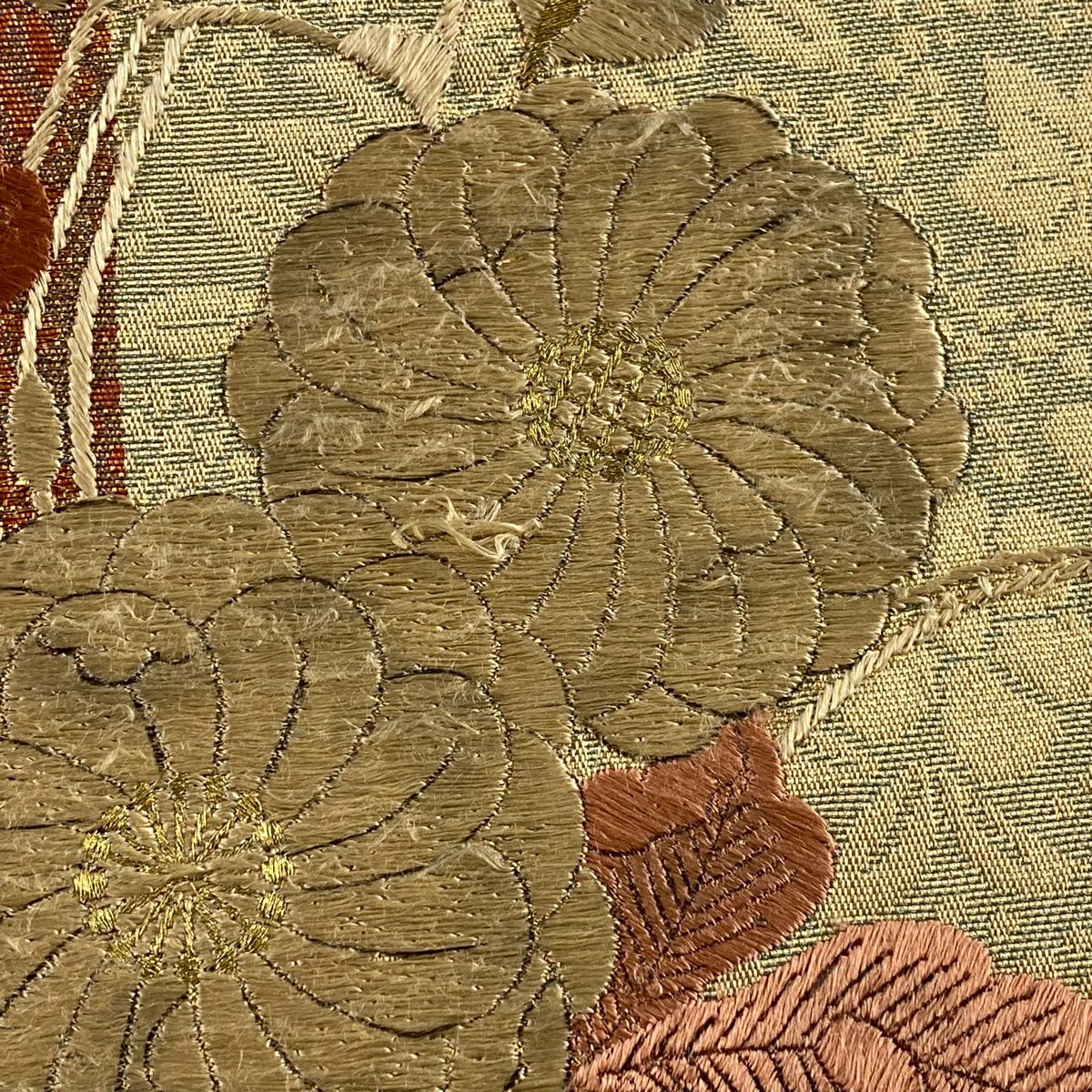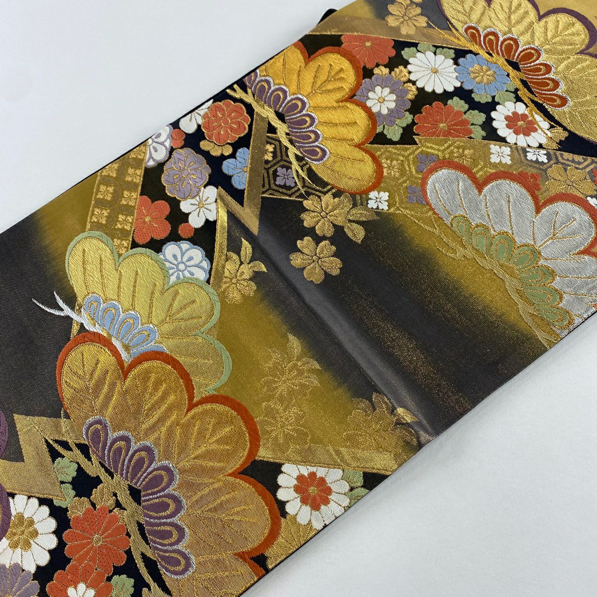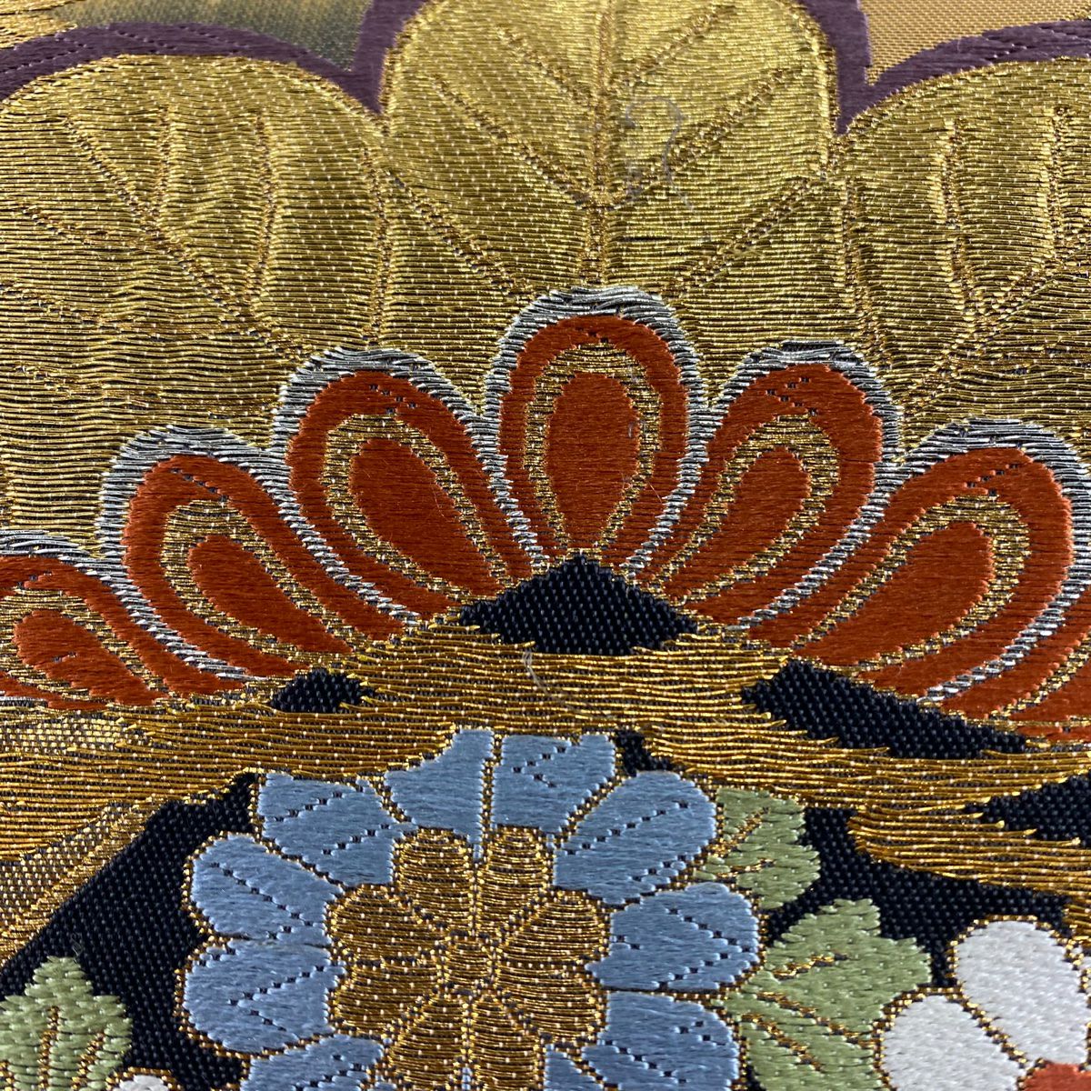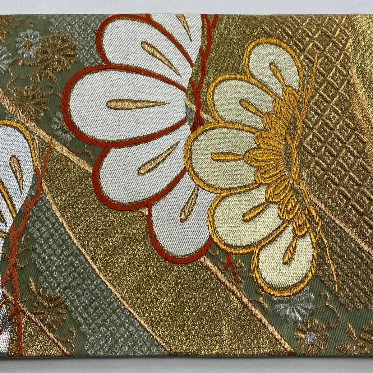 【在庫一掃】 袋帯 秀品 古典錦 笠松 菊 刺繍 金銀糸 灰色 六通 正絹