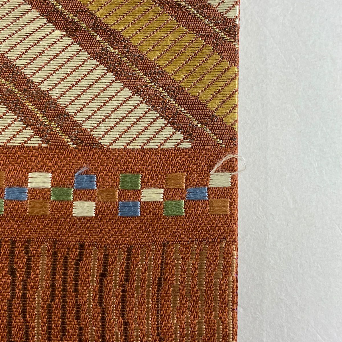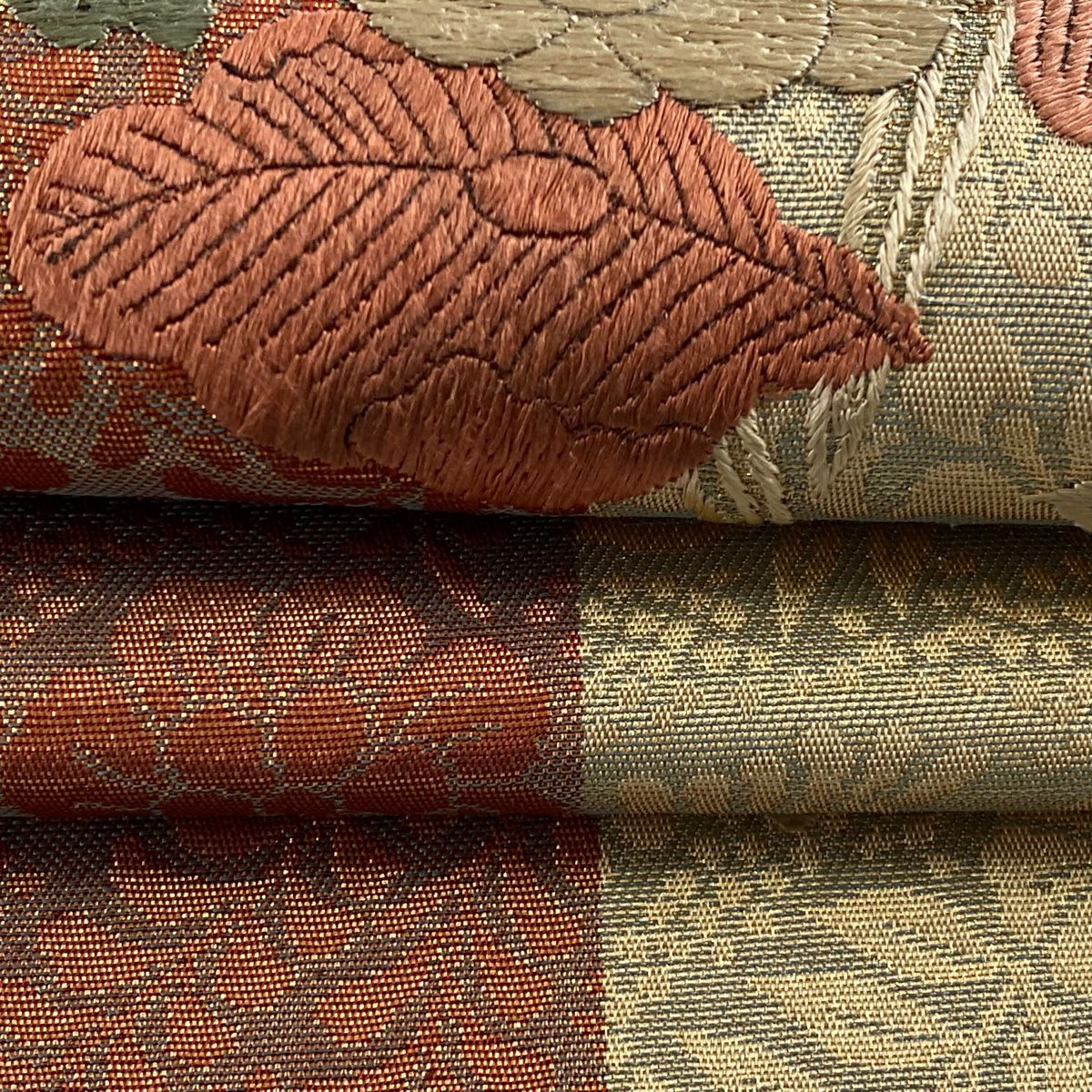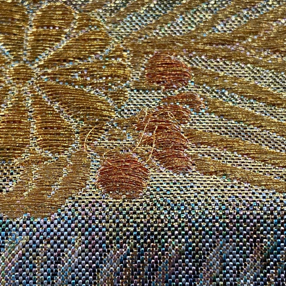 【在庫一掃】 【美品】 袋帯 秀品 幾何学模様 刺繍 金糸 赤茶 六通 正絹