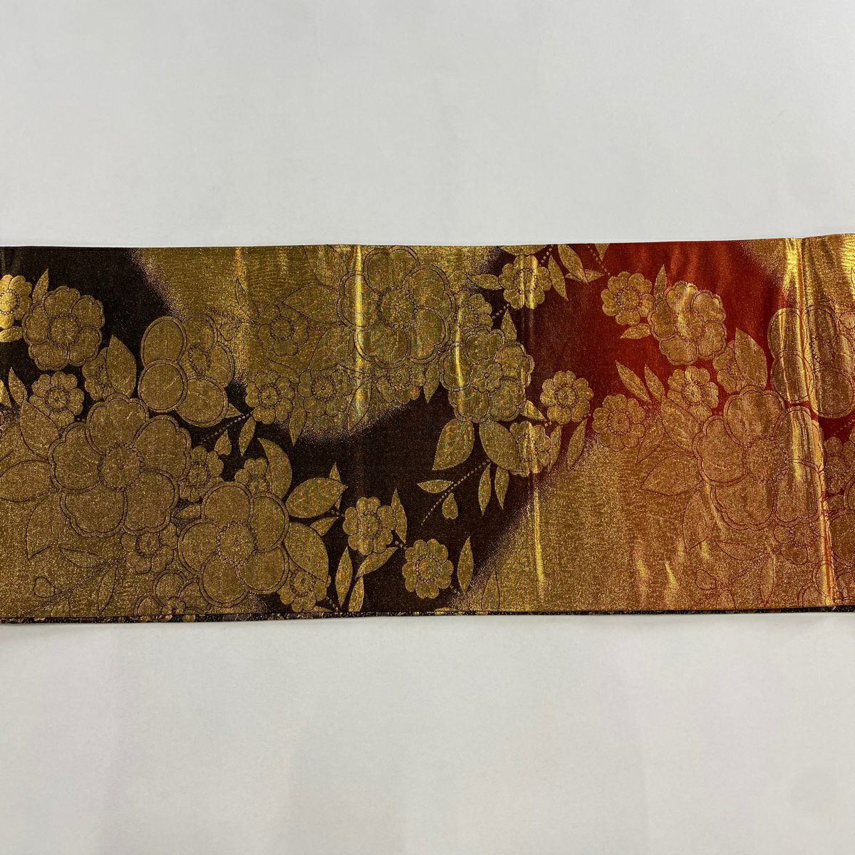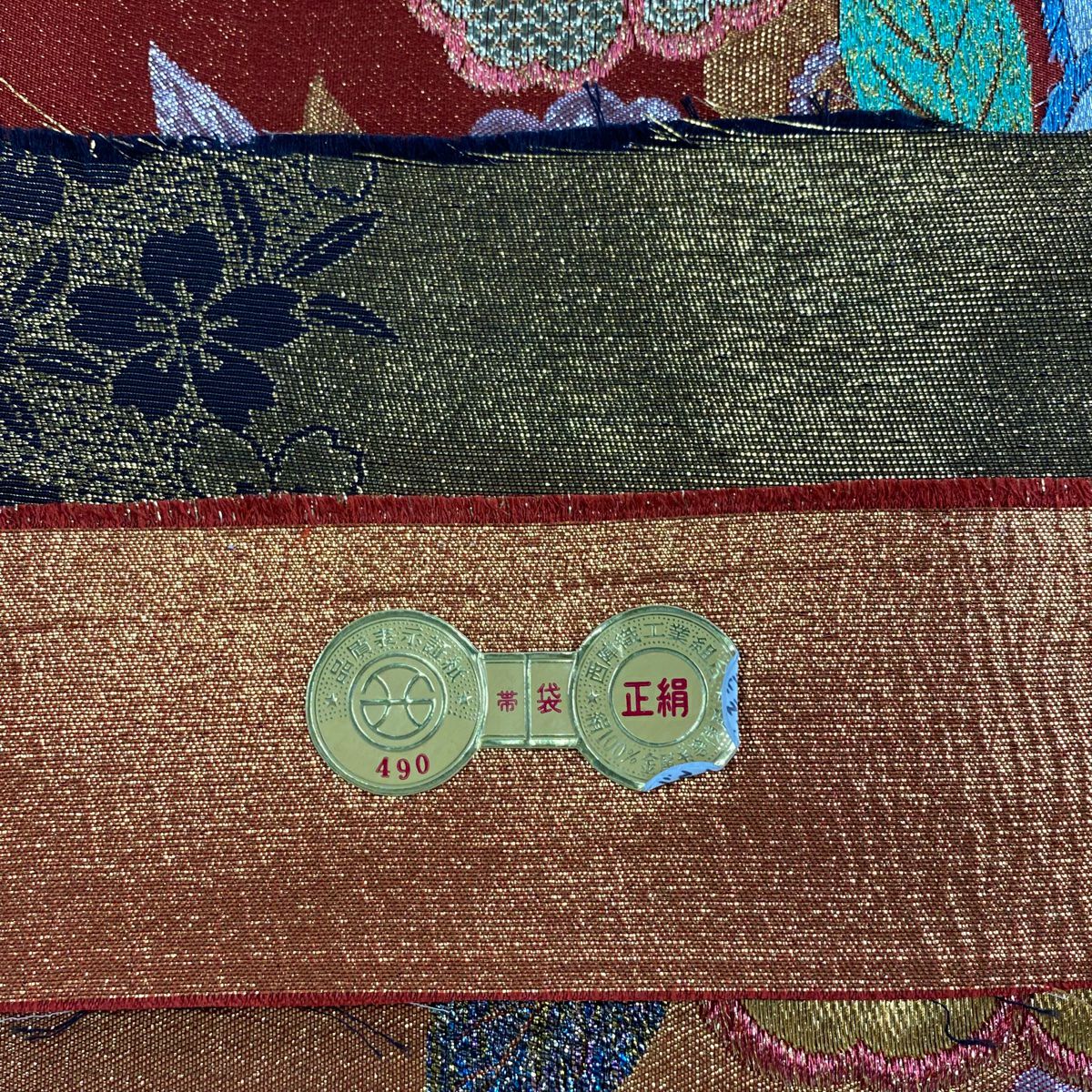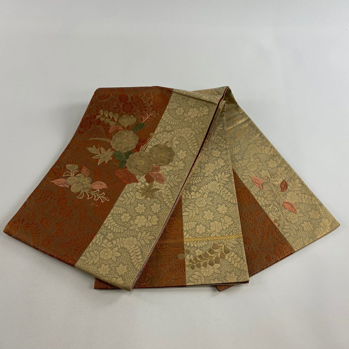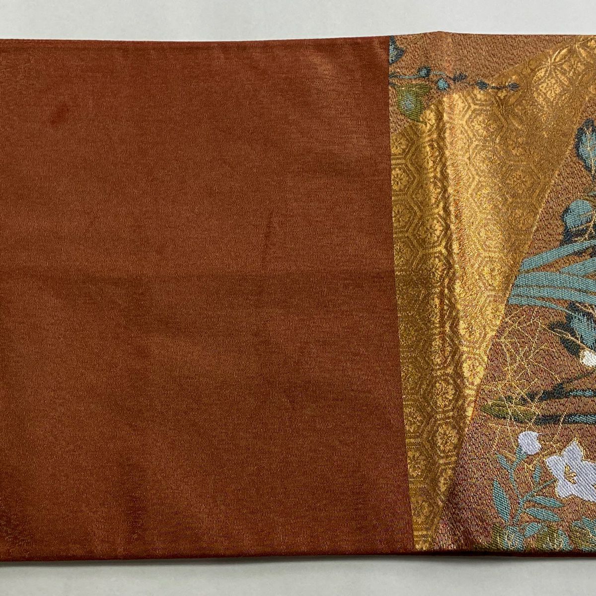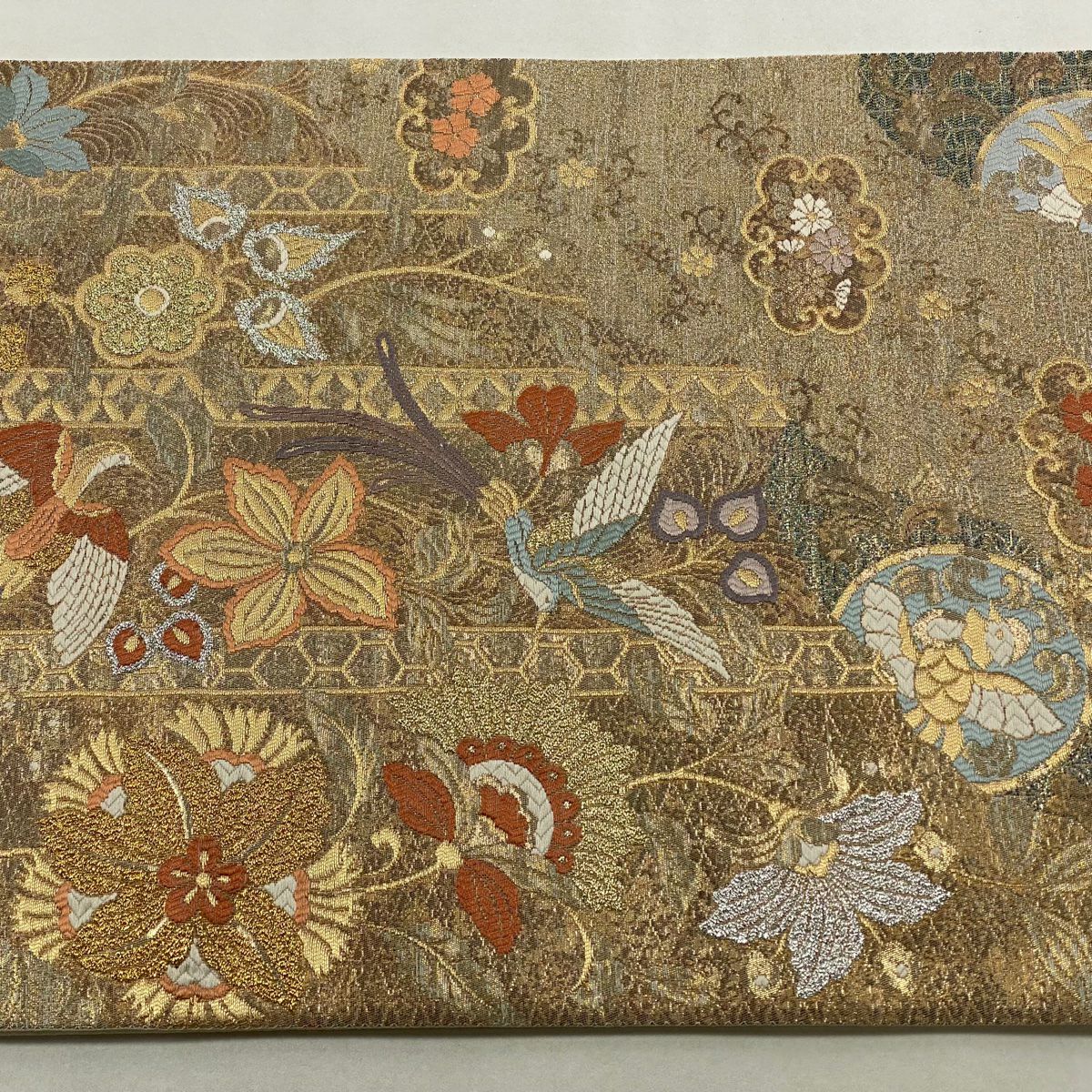 【在庫一掃】 【美品】 袋帯 秀品 草花 七宝 金銀糸 箔 赤茶 六通 正絹