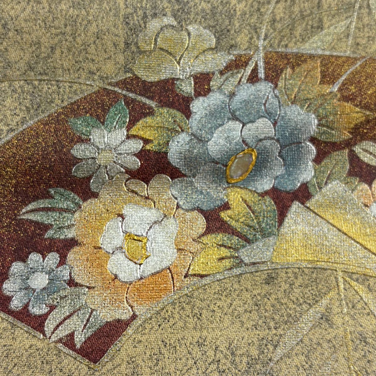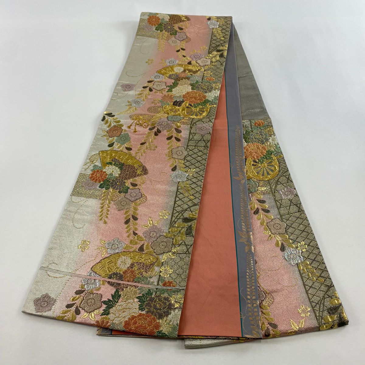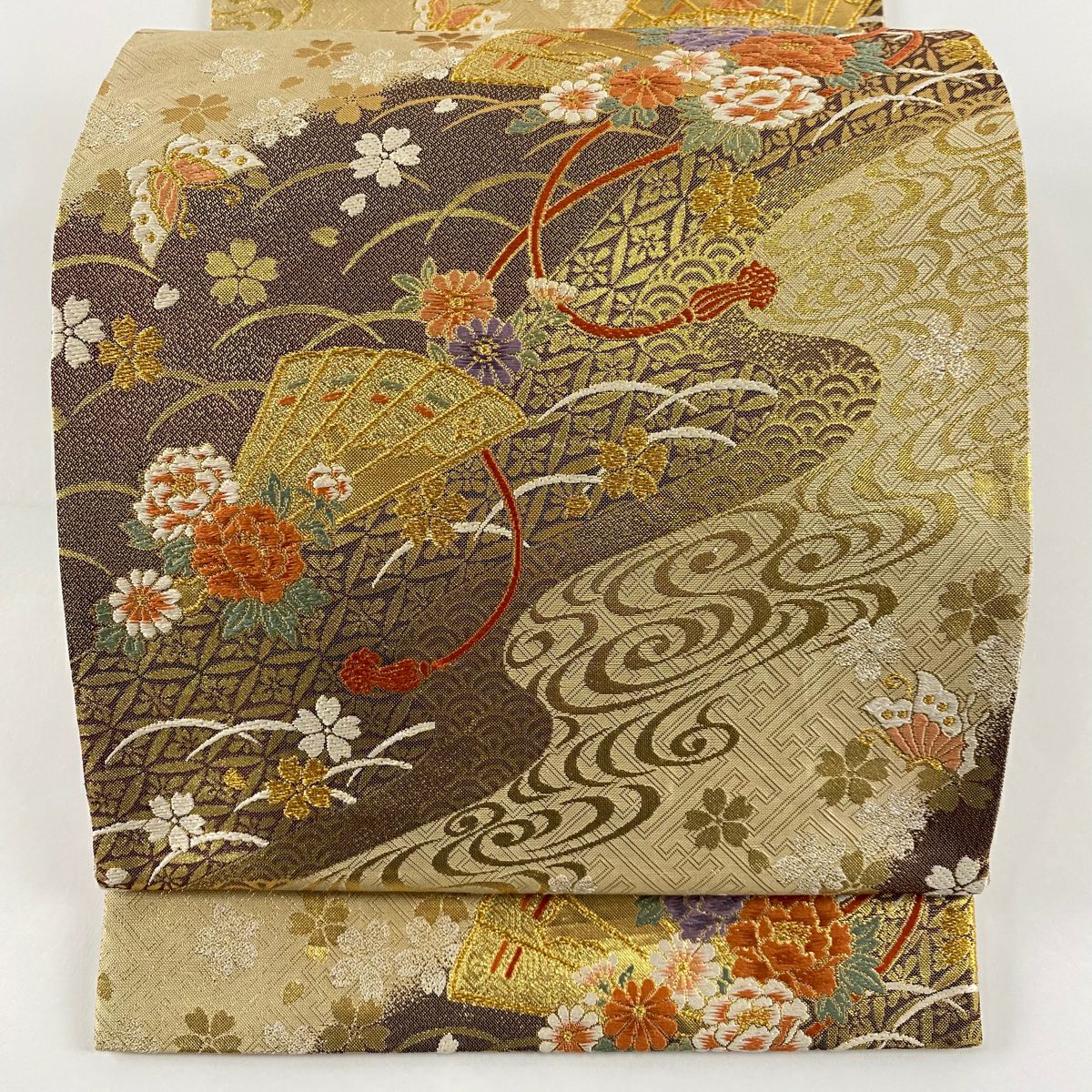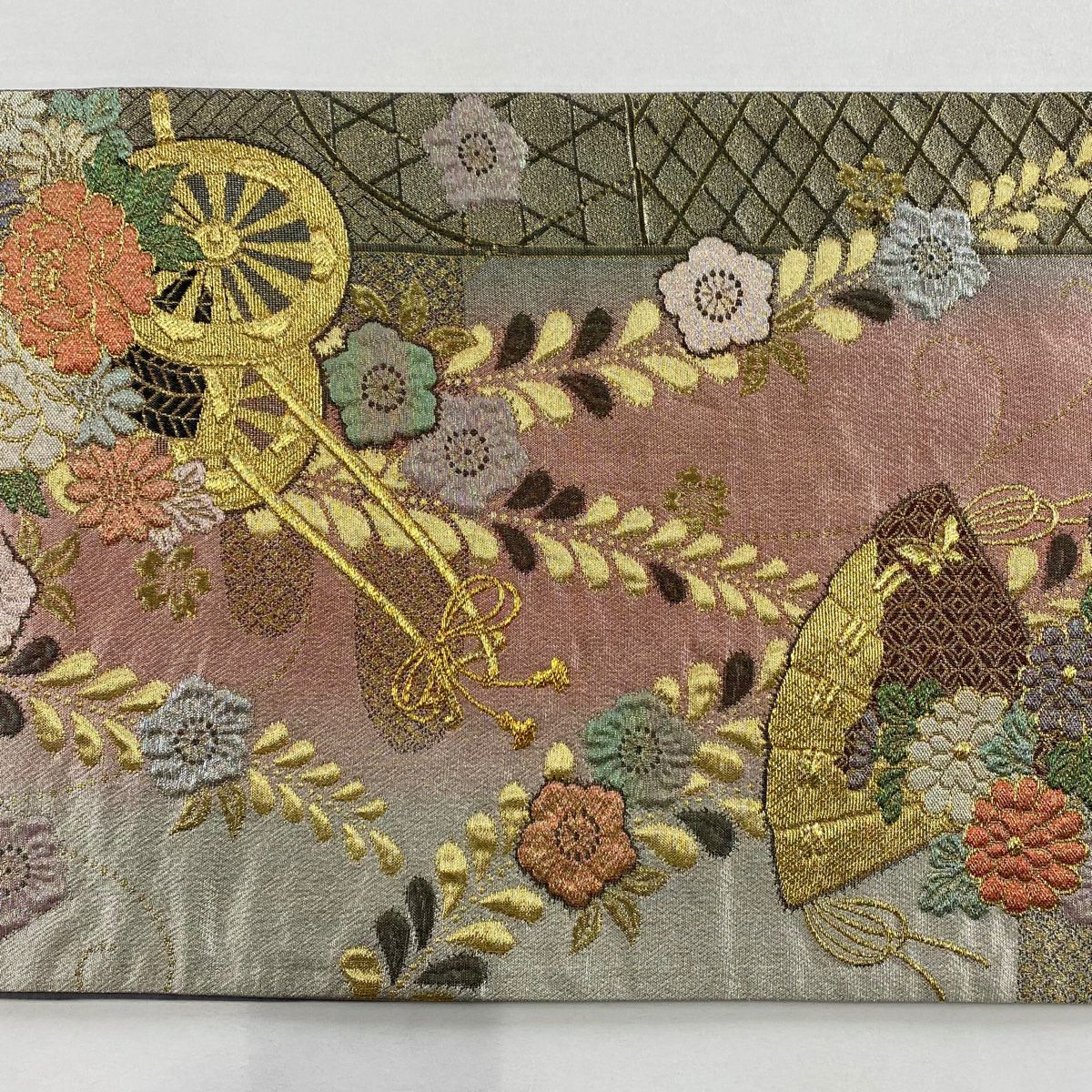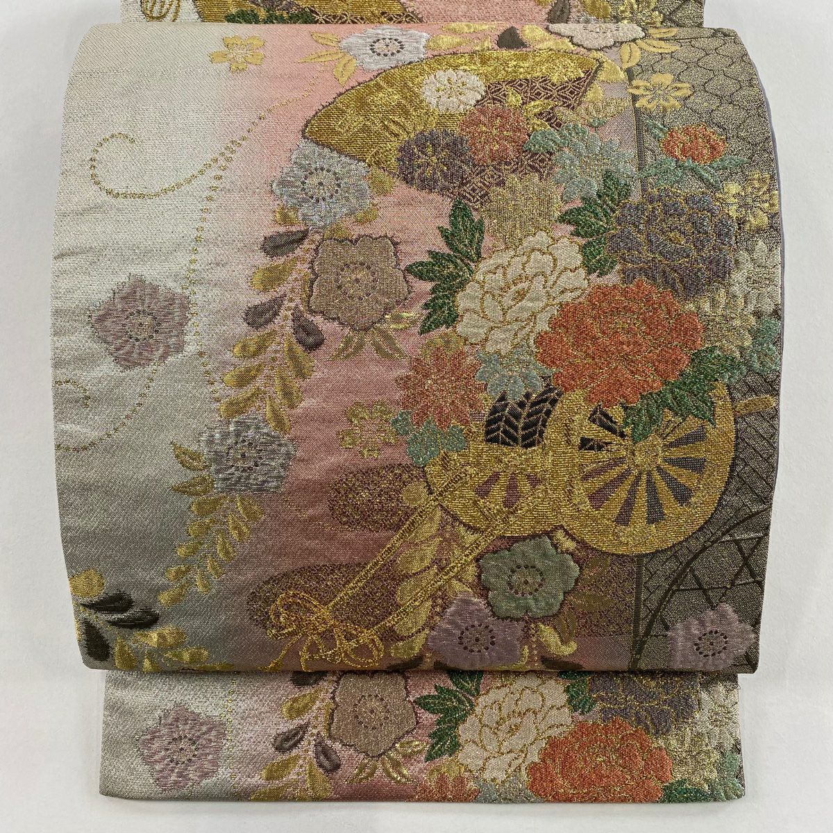 【在庫一掃】 袋帯 秀品 扇面 草花 螺鈿 金銀彩 薄茶色 お太鼓柄 正絹