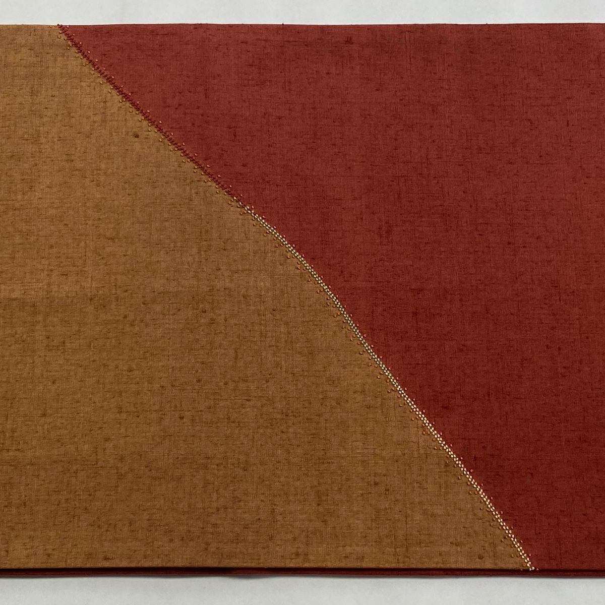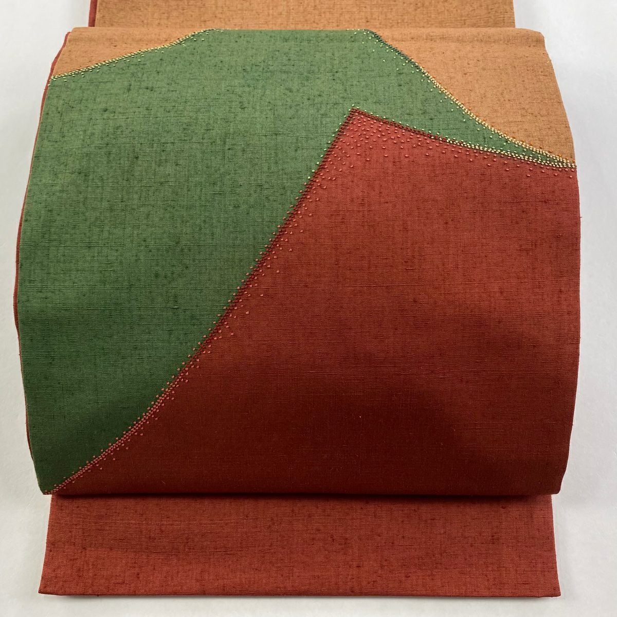 【在庫一掃】 【美品】 袋帯 秀品 紬地 幾何学 刺繍 茜色 お太鼓柄 正絹