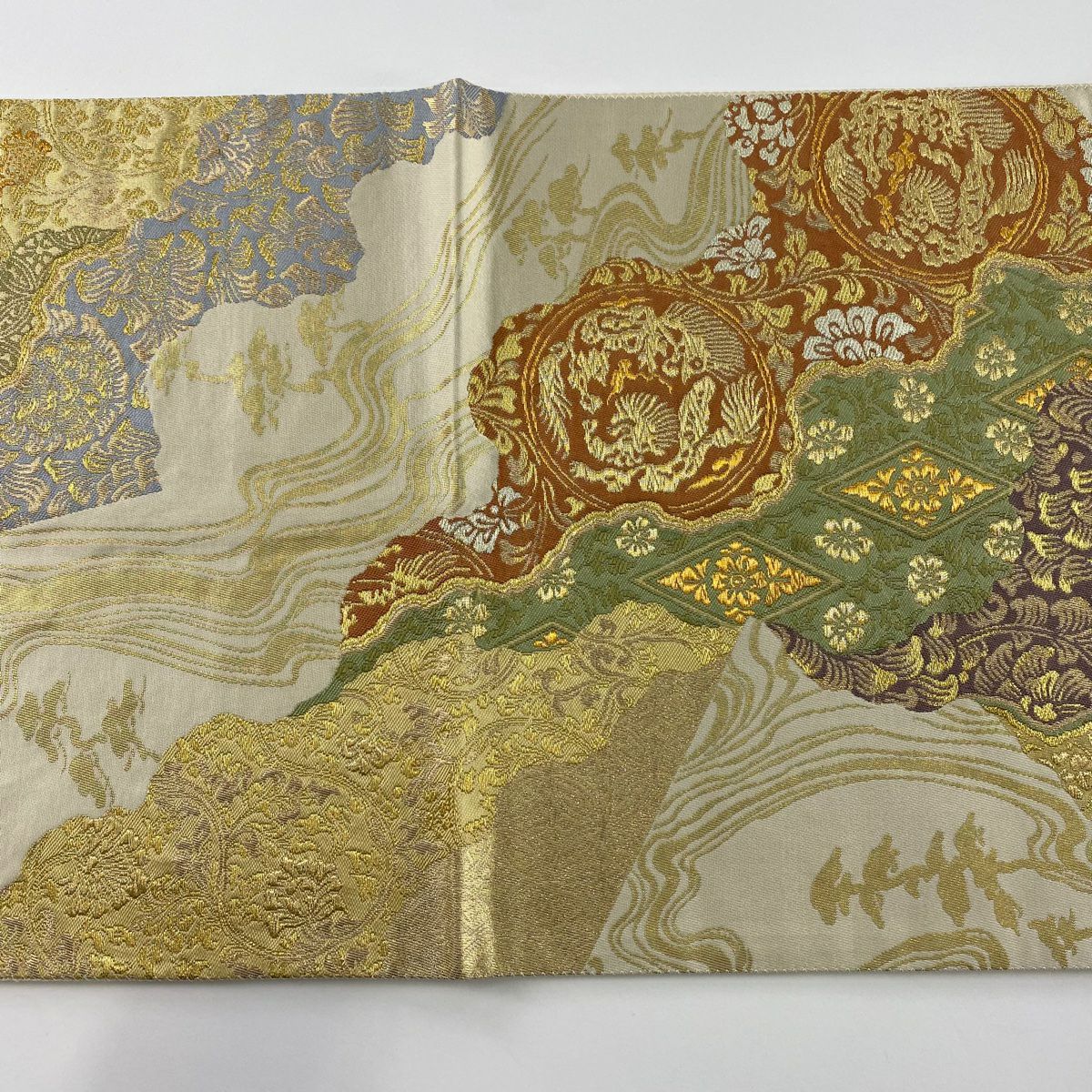 【在庫一掃】 袋帯 秀品 関西仕立て 丸文 花蝶 ベージュ 六通 正絹