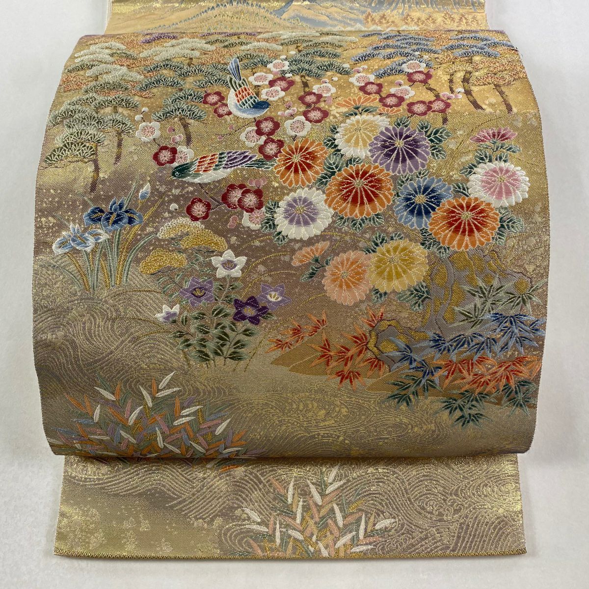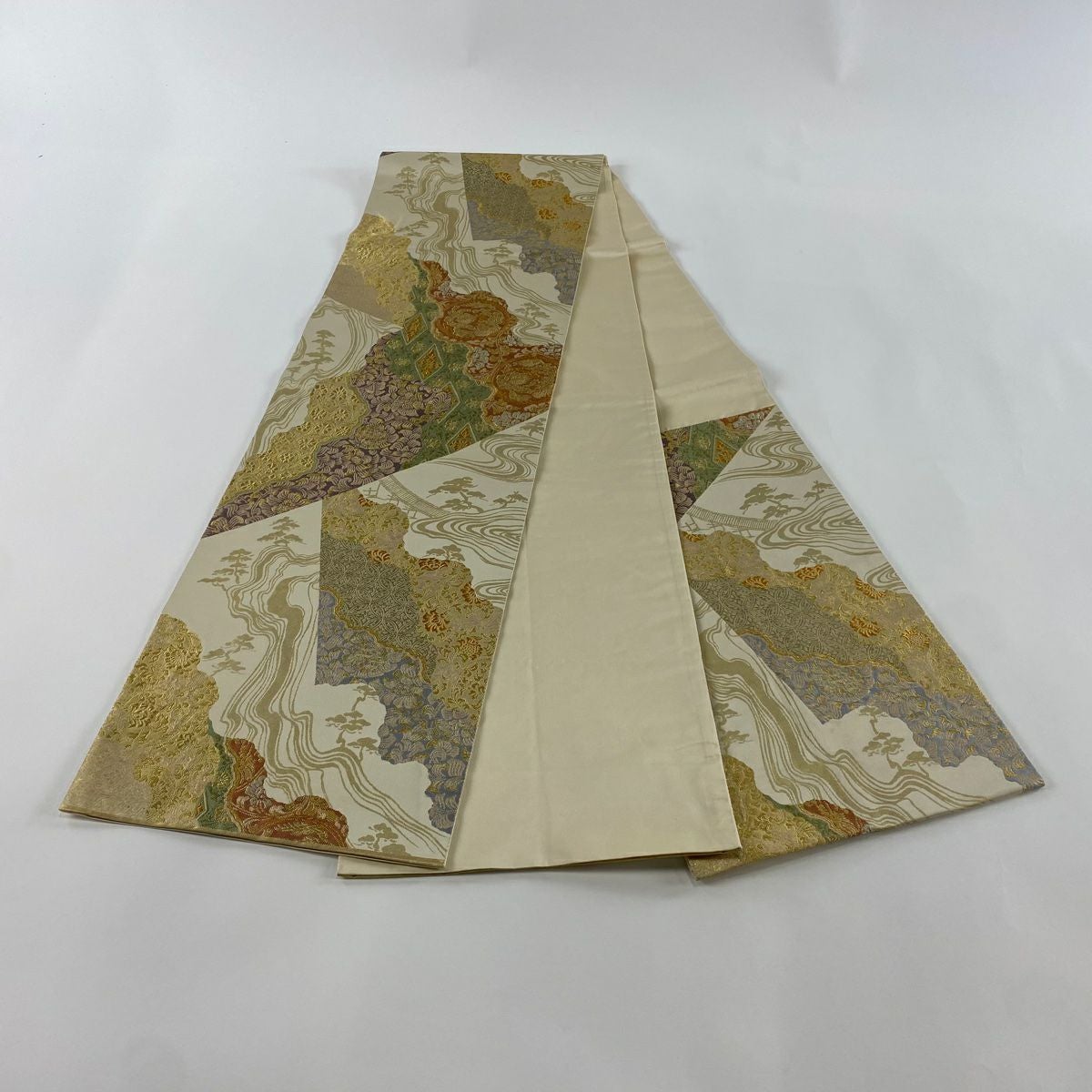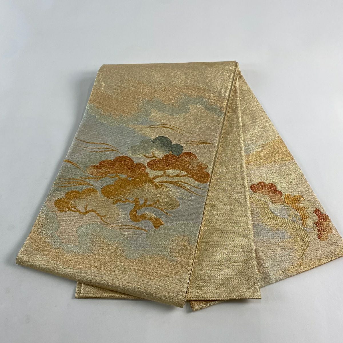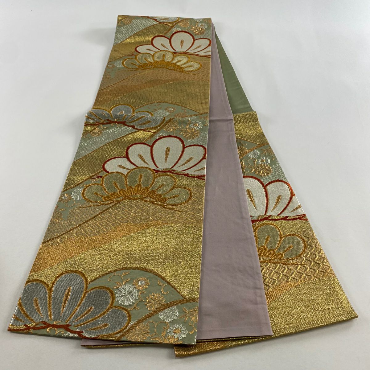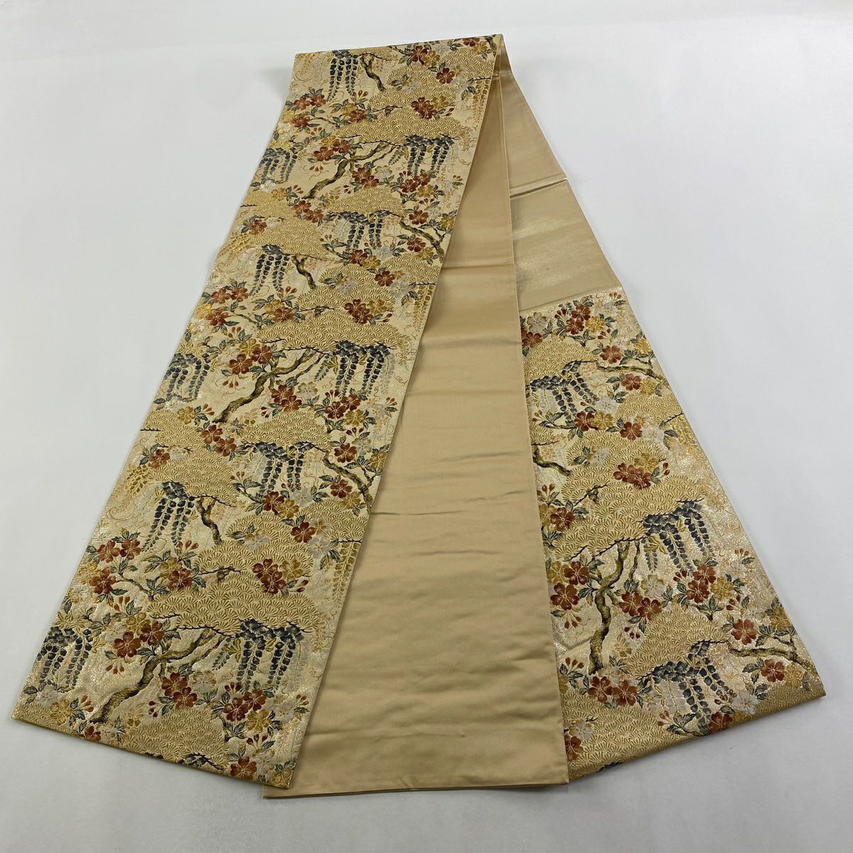 【在庫一掃】 袋帯 秀品 松 花びら 金銀糸 箔 ベージュ 六通 正絹