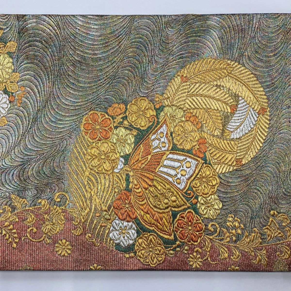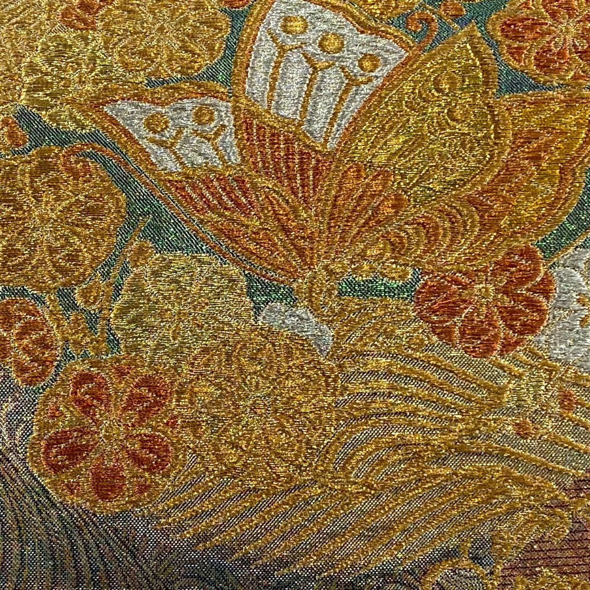 【在庫一掃】 袋帯 秀品 振袖向き 蝶 花丸文 金銀糸 箔 金色 六通 正絹