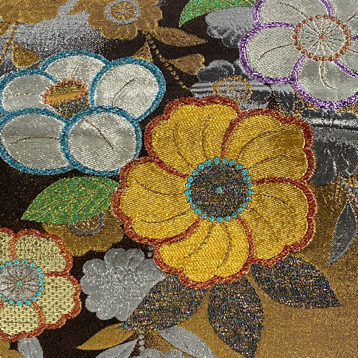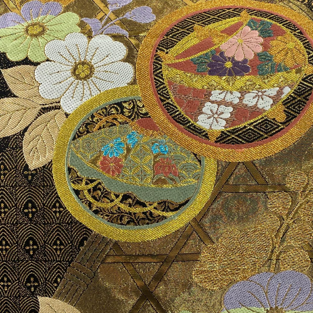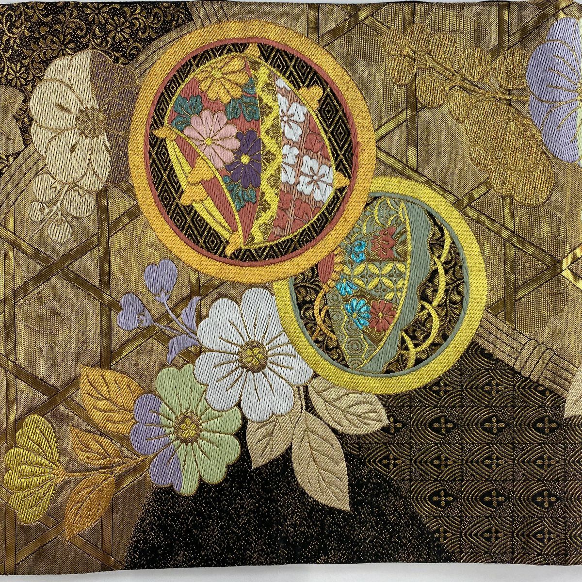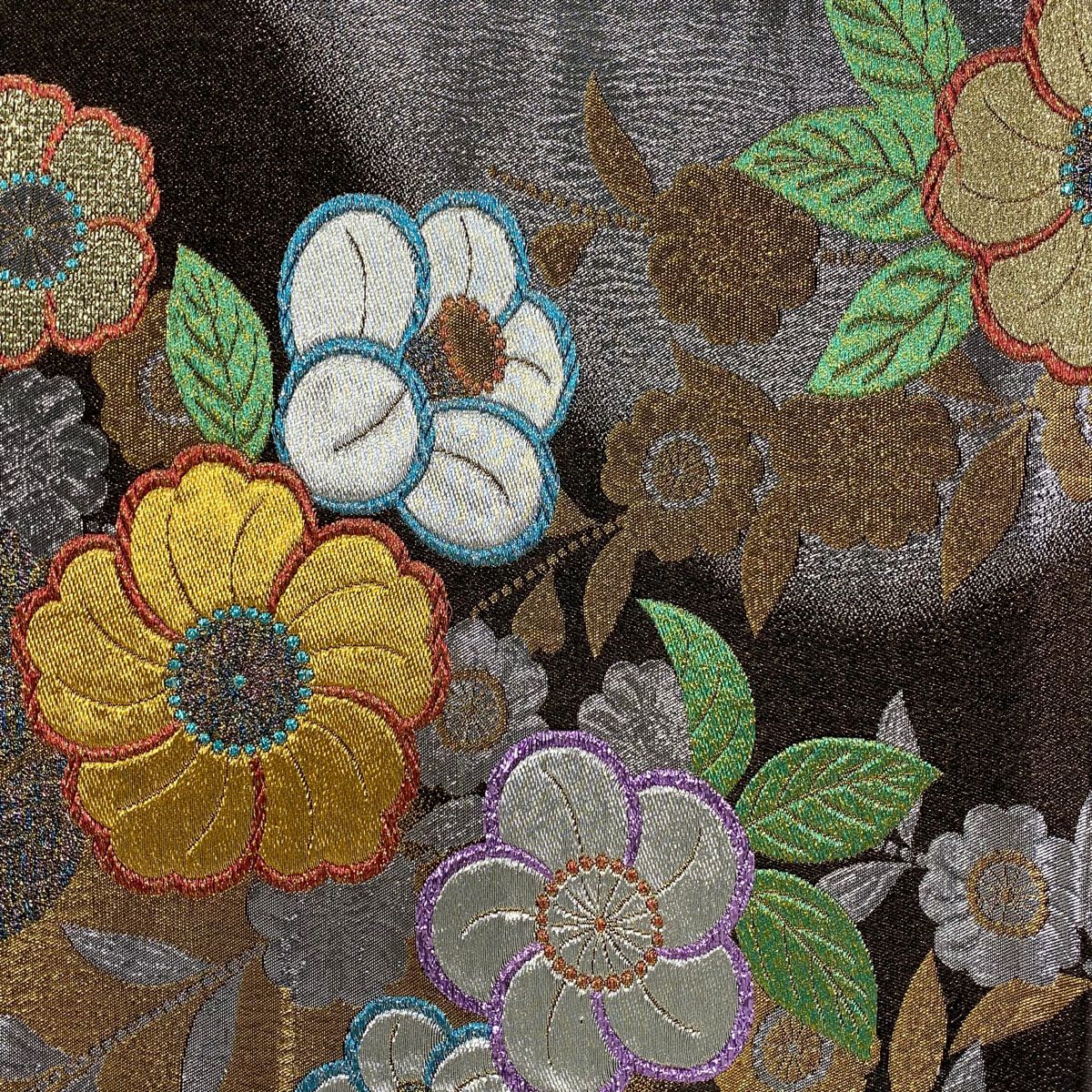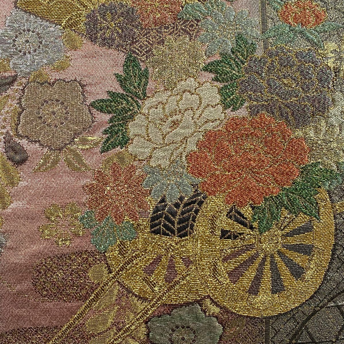 【美品】 袋帯 秀品 関西仕立て 誰が袖 花 金糸 箔 金色 お太鼓柄 正絹