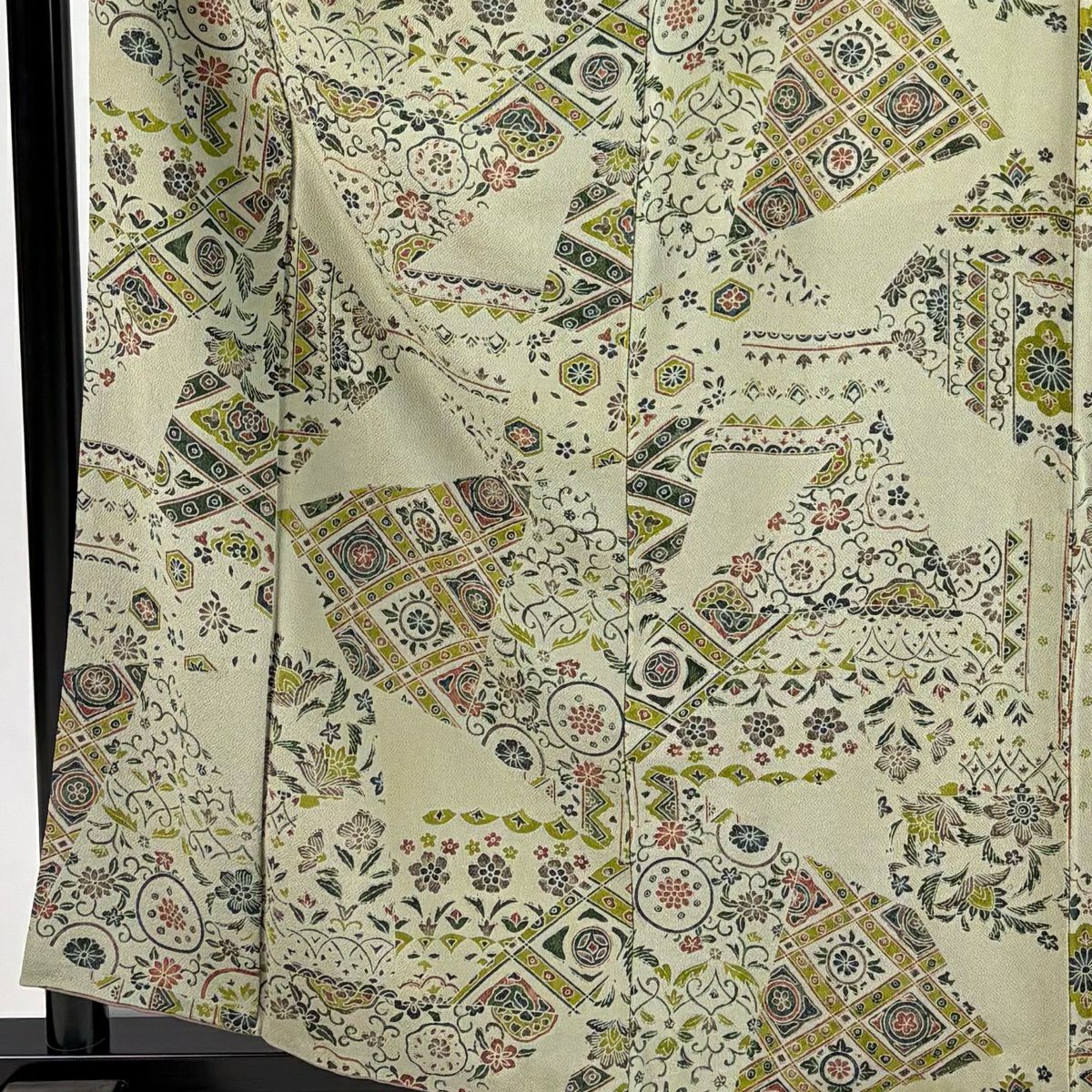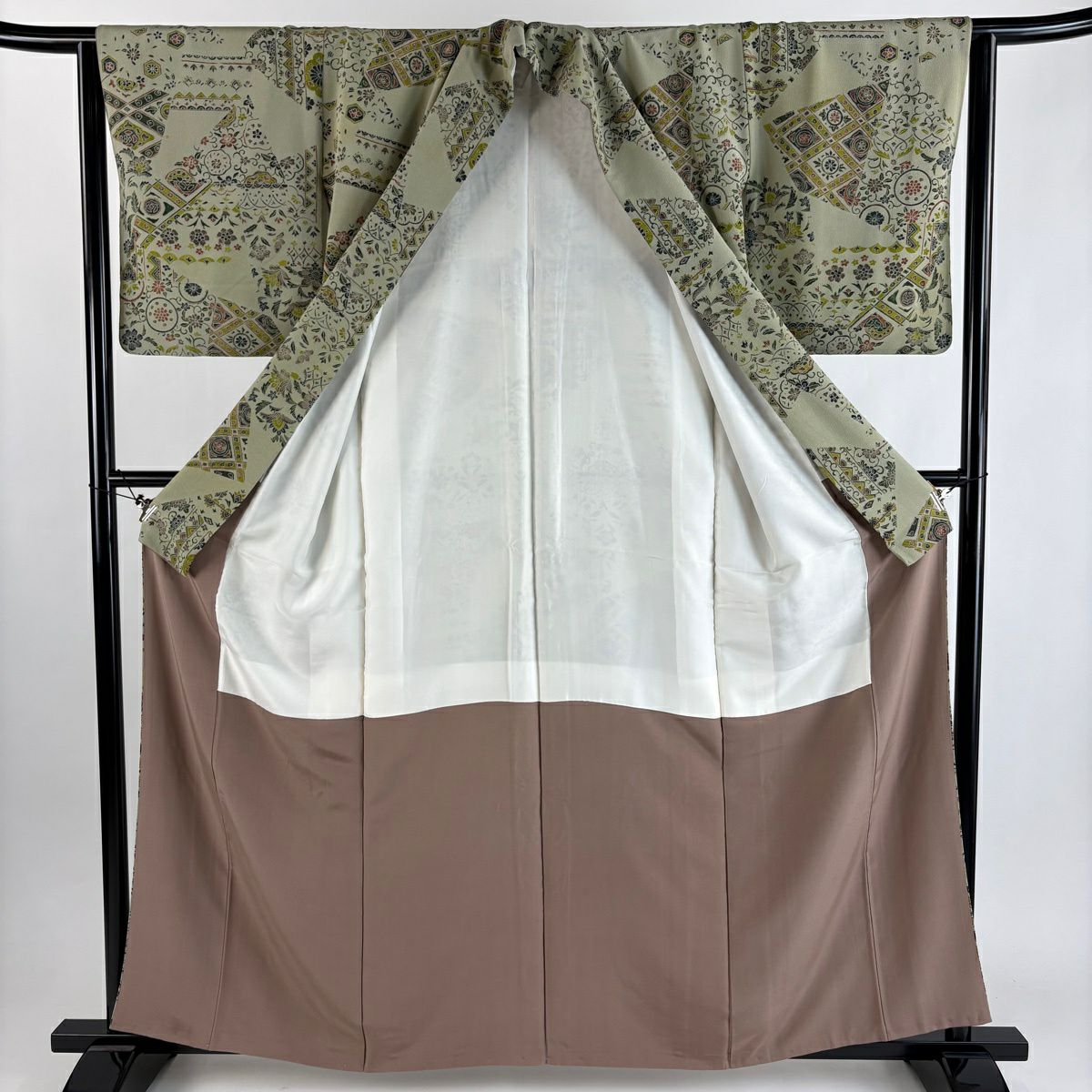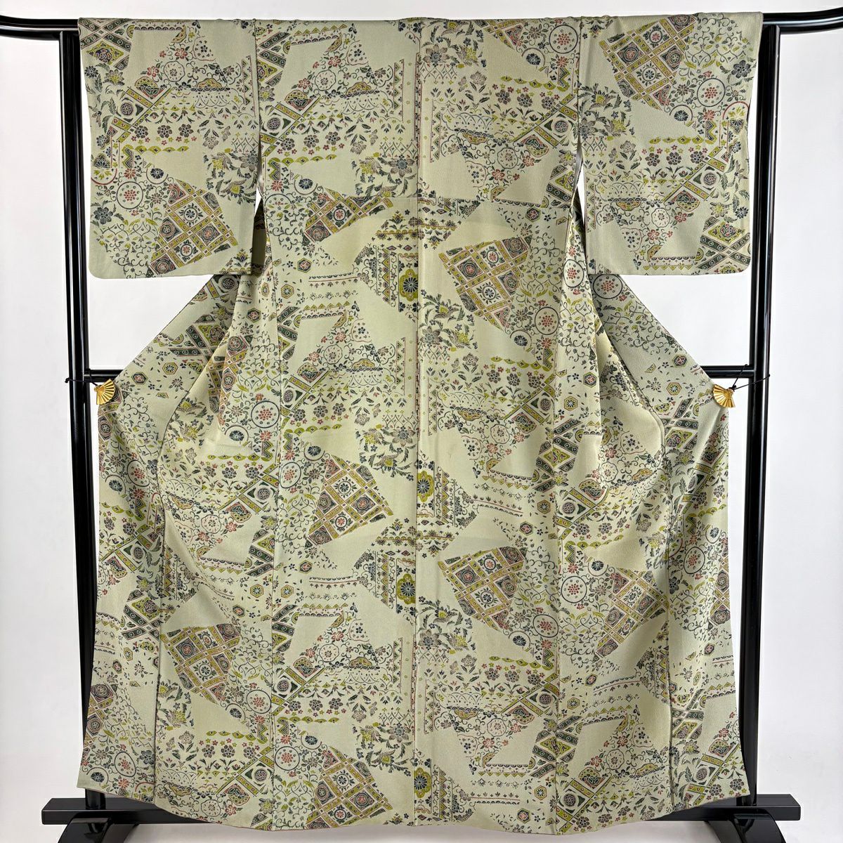小紋 身丈160cm 裄丈63cm S 袷 草花 亀甲 縮緬 灰緑 正絹 秀品