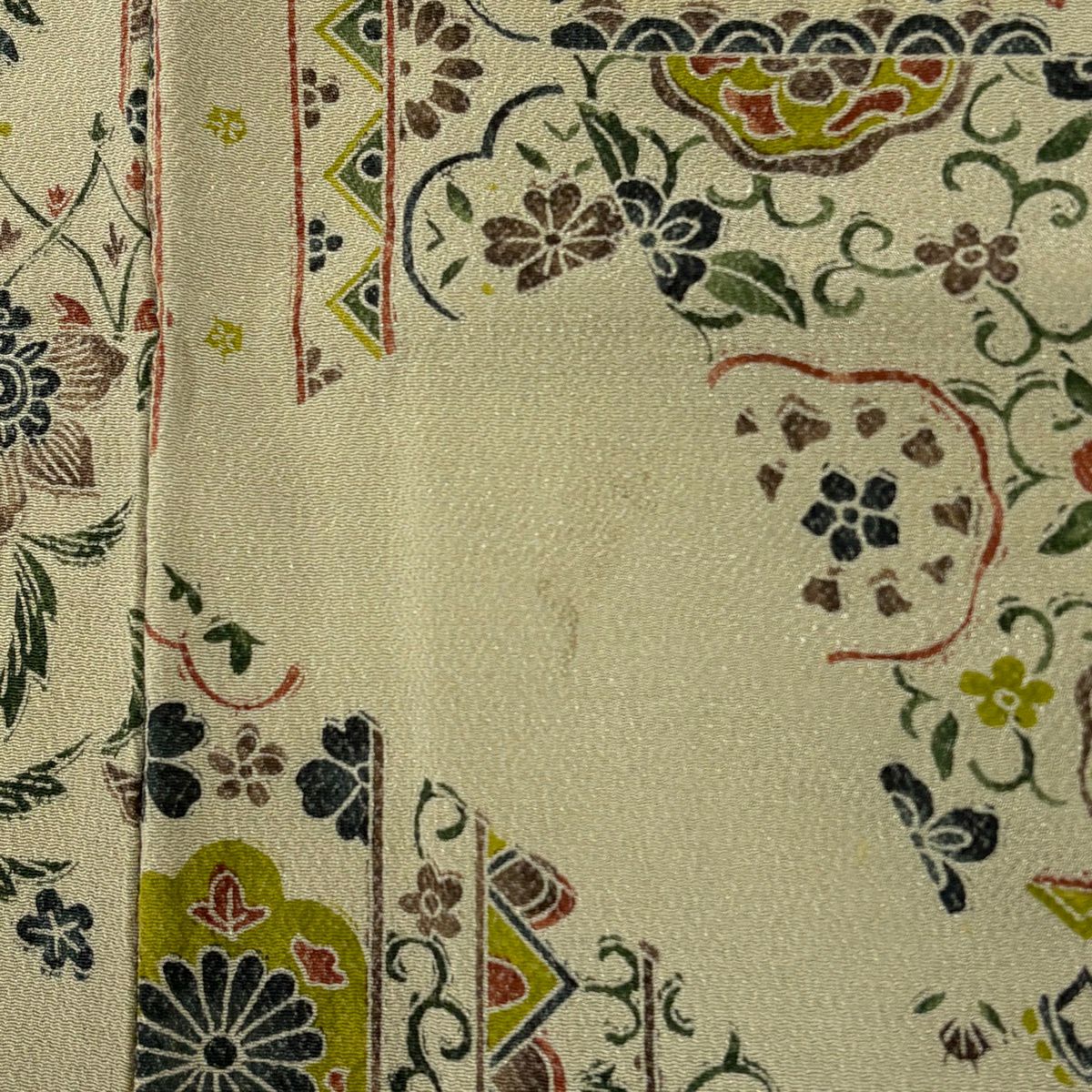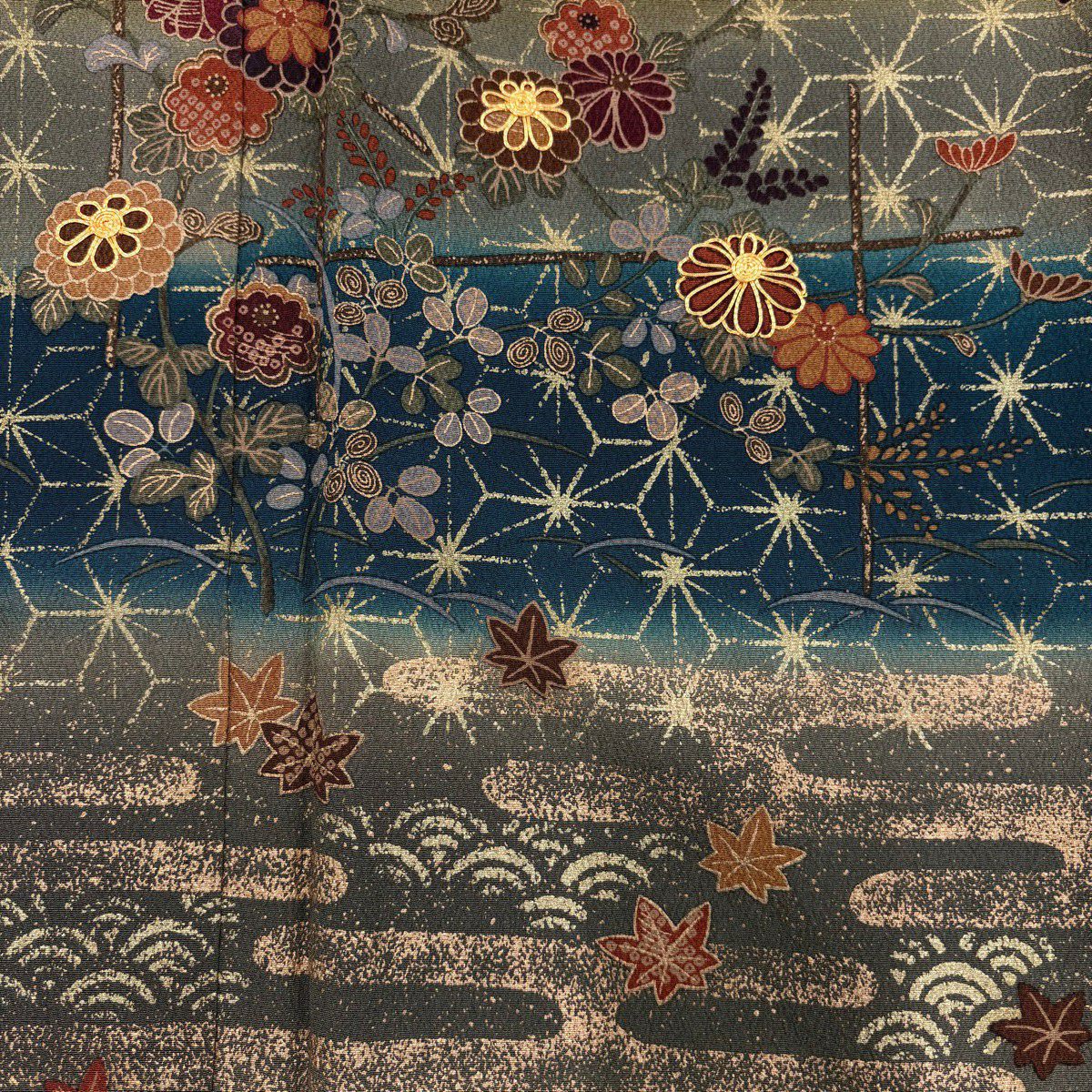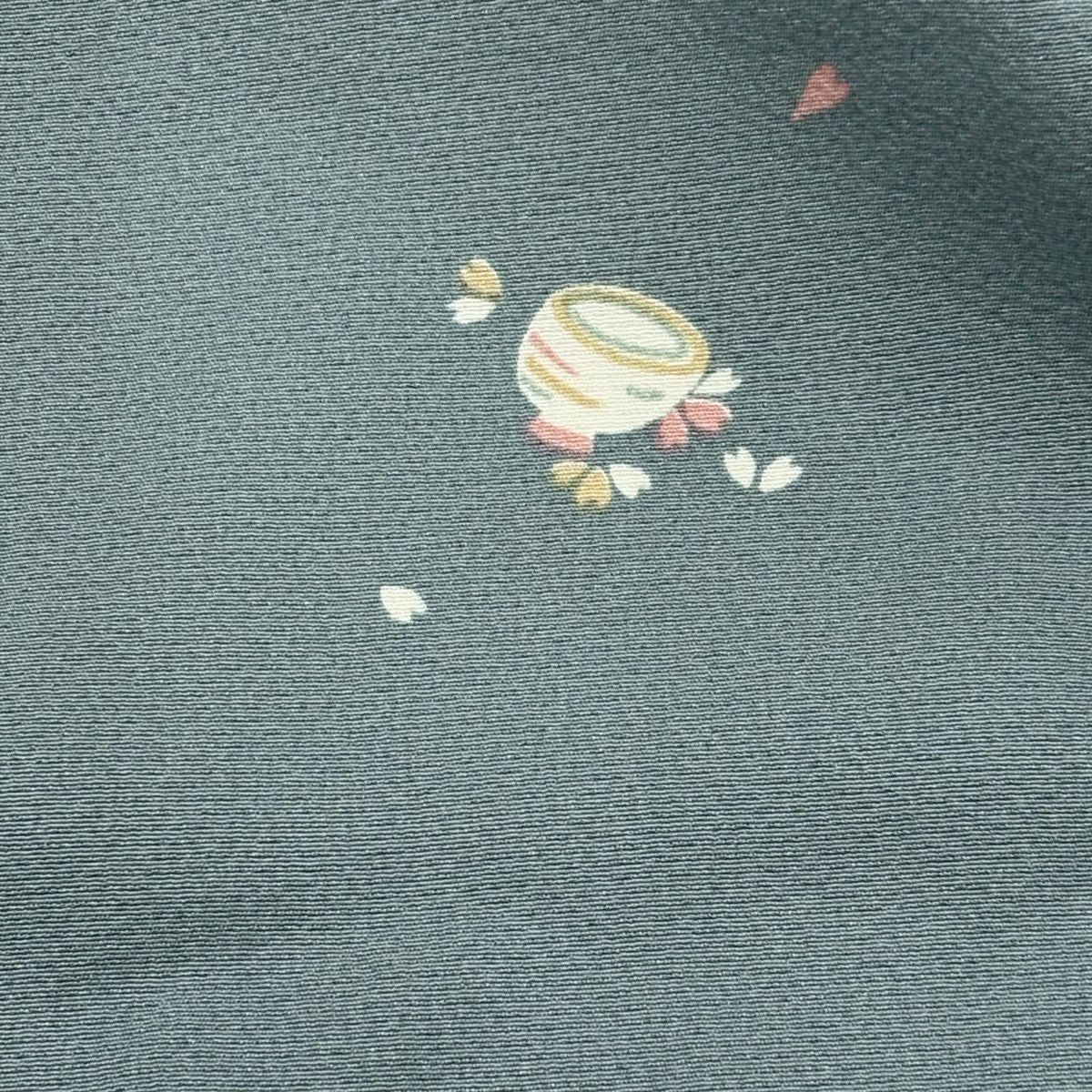 小紋 身丈160cm 裄丈63cm S 袷 草花 亀甲 縮緬 灰緑 正絹 秀品