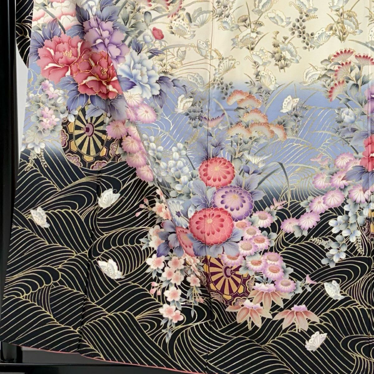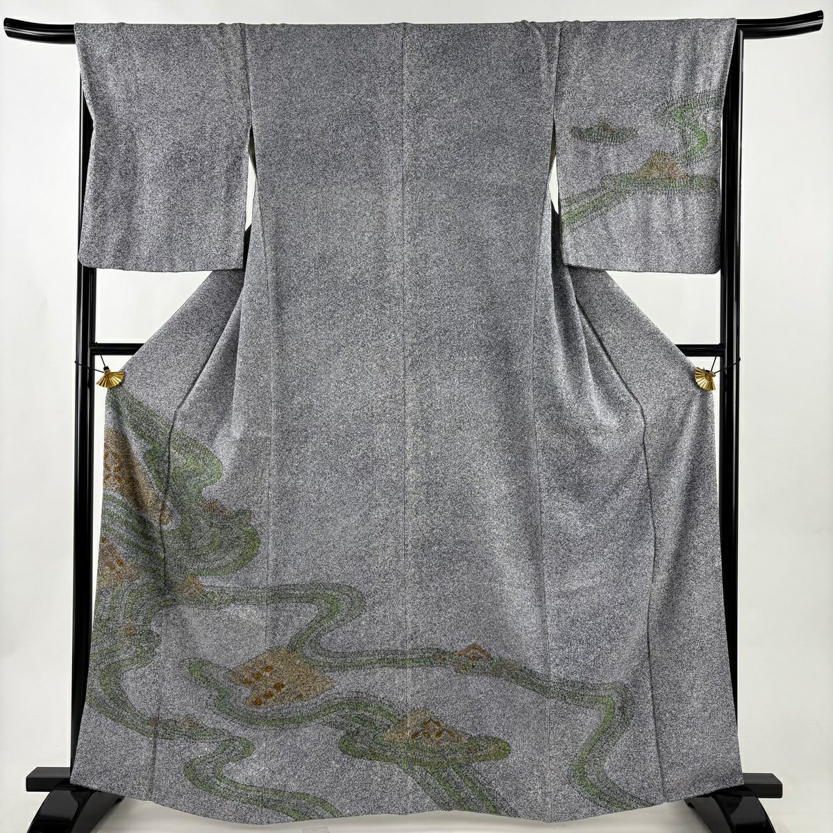 付下げ 身丈153cm 裄丈63.5cm S 袷 花車 金彩 黒灰 正絹 秀品